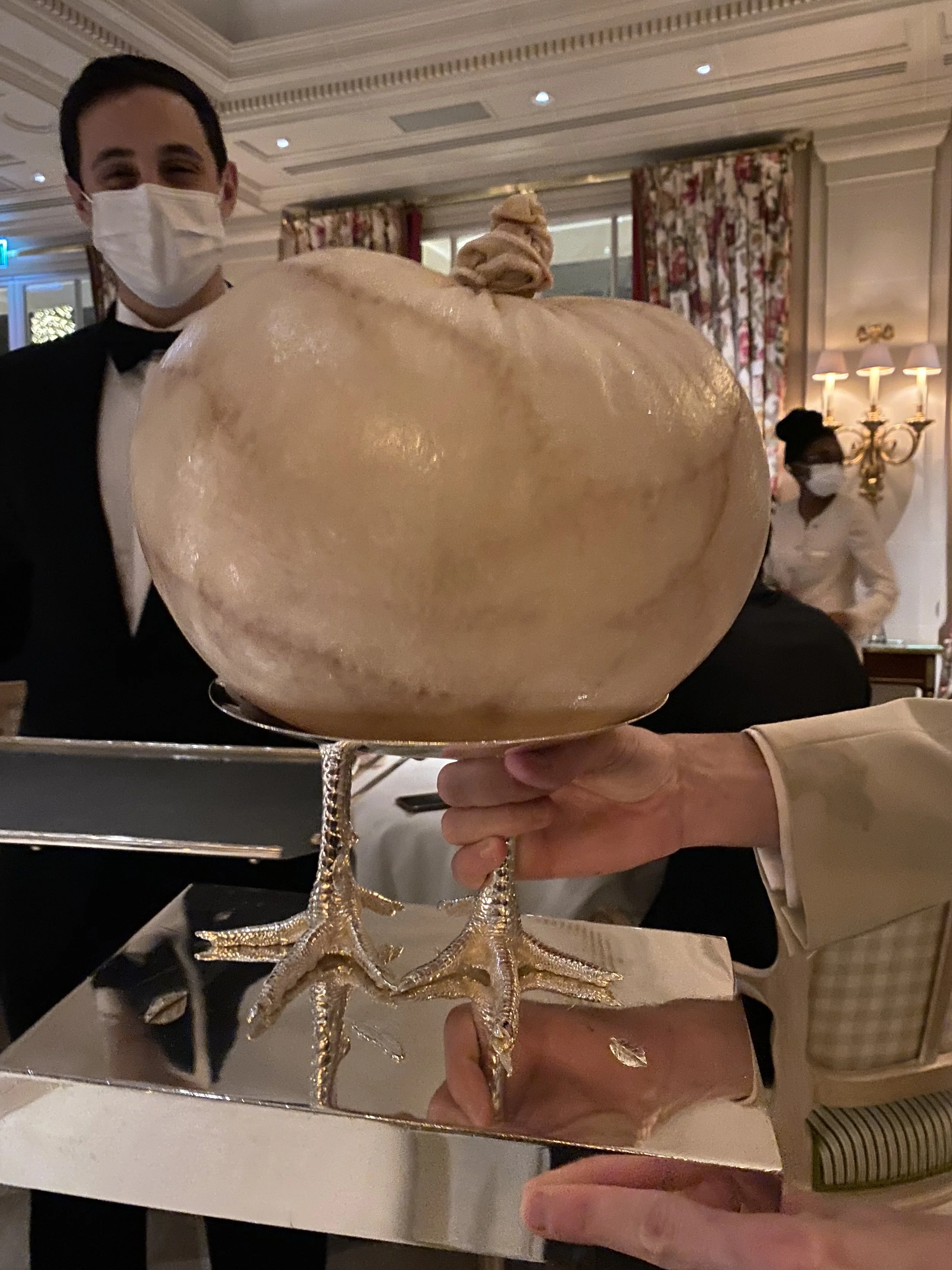 The final savory course was hen poached in a (pig's) bladder. An ancient way to perform sous-vide cooking, this dish is rarely enough served, presumably since cooking chicken sous-vide is so much simpler. A bladder is duly shown to all diners before being served the dish. I assume that this was an empty floor sample, since one would probably handle a bladder filled with hot chicken and sauce more carefully that the staff did. The chicken was wonderfully tender, with some crayfish and mushrooms. Among the best chicken breasts I've eaten, although there is probably a limit to how much I'd rhapsodize about chicken even if done perfectly - in the end, it's still only chicken 18.