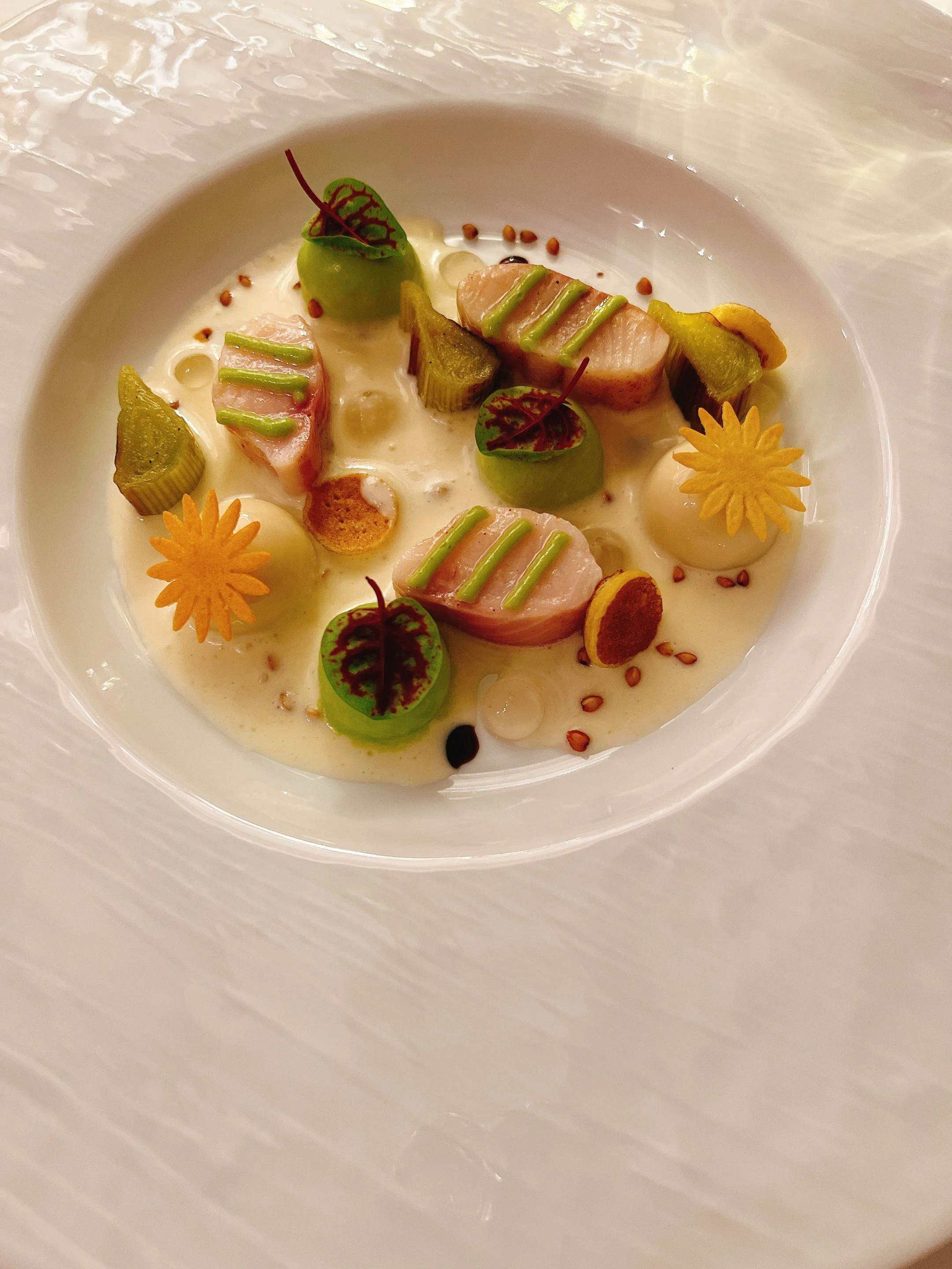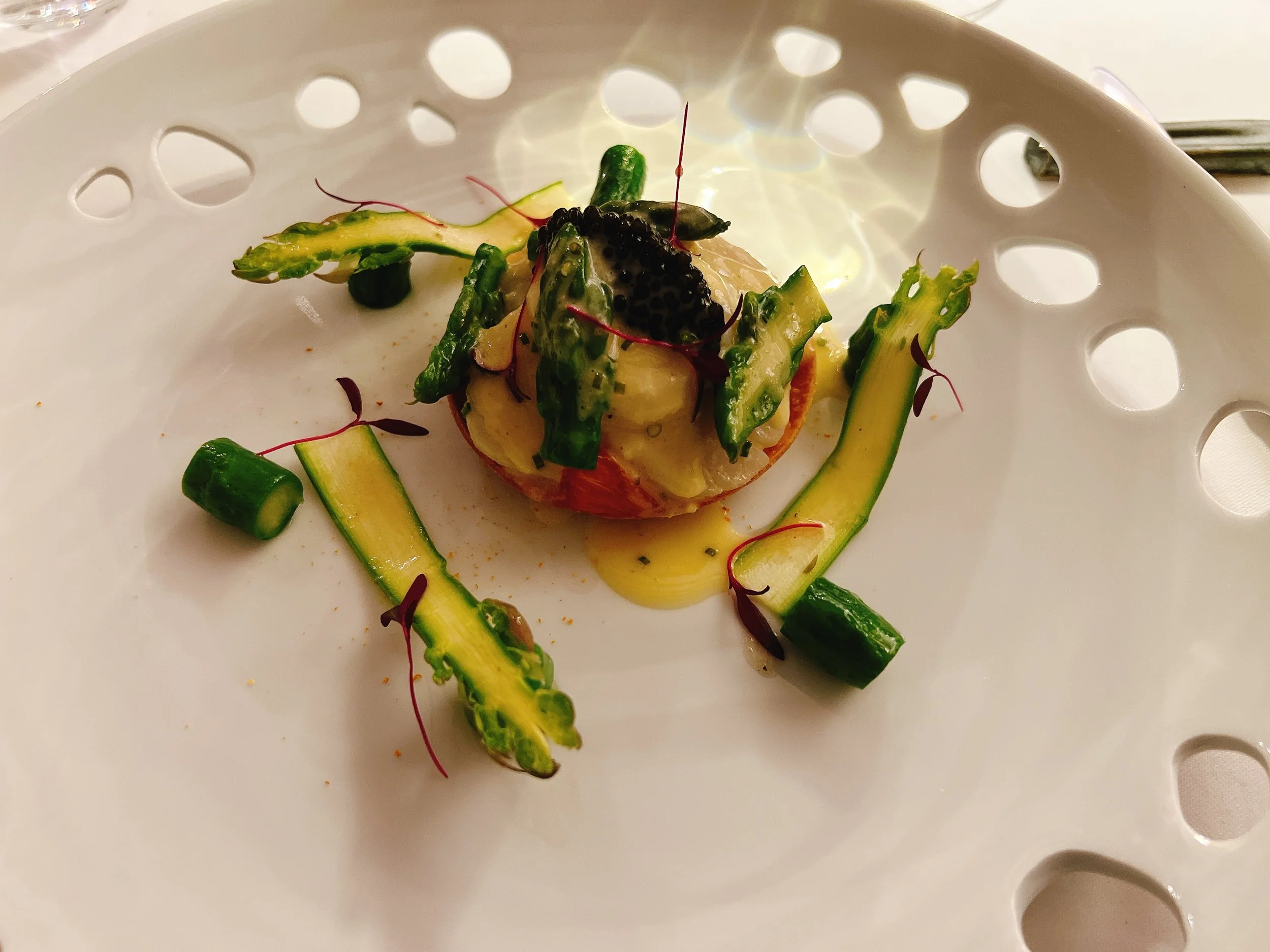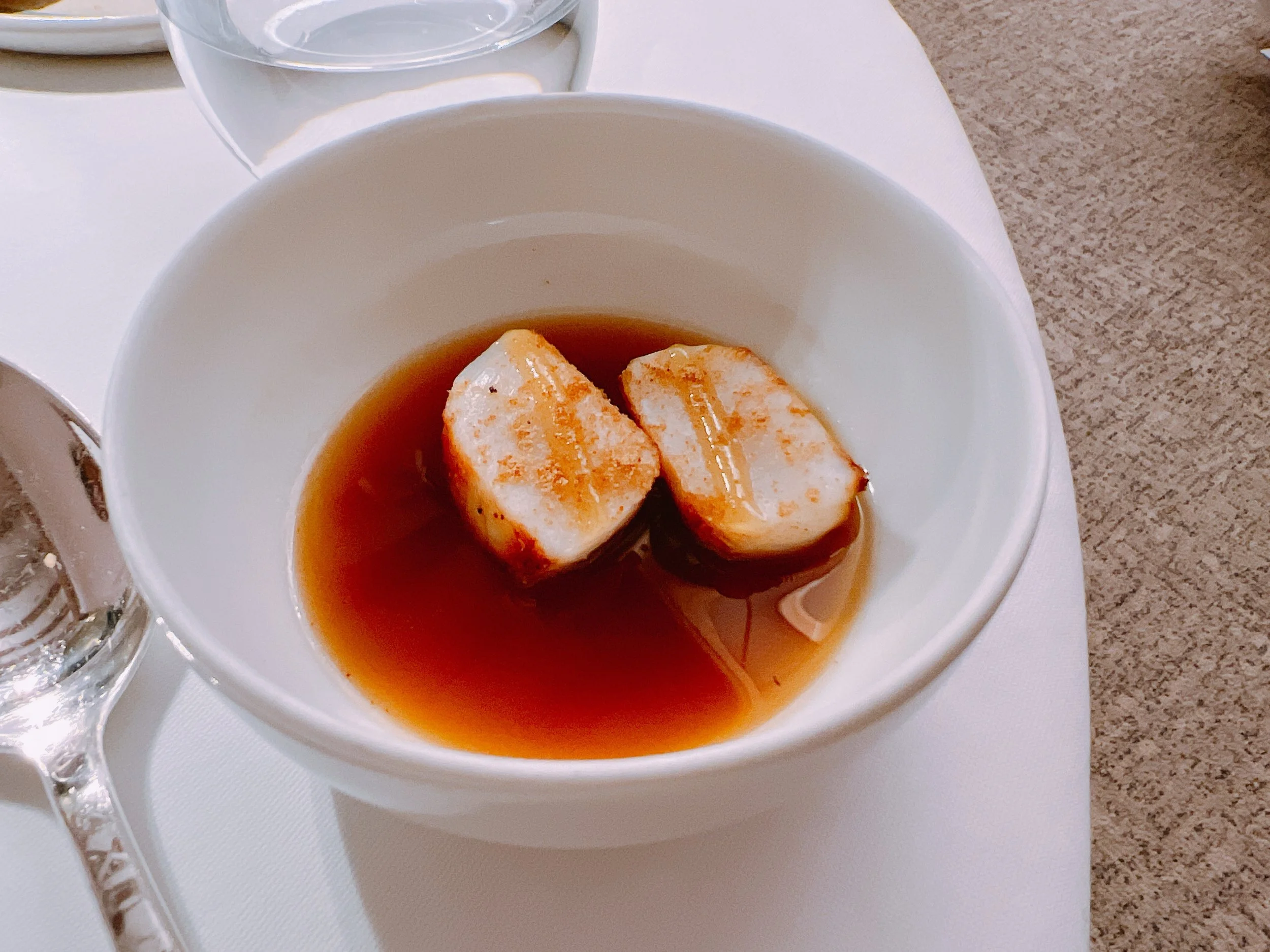 Next was the scallop dish in two preparations. The larger one was a scallop tarte with scallop mousse, leeks and caviar, accompanied by green asparagus. The smaller preparation was served in a bowl: seared scallop in a lemon broth. The tarte was excellent, a wonderful combination of ingredients that were fantastic individually and in combination. The lemon broth scallop initially surprised us by being on the sweeter side, but it actually went better with the paired Chardonnay. We finished every last drop of the sauce, drinking from the bowl at the end, so clearly one shouldn't overvalue first impressions 19.