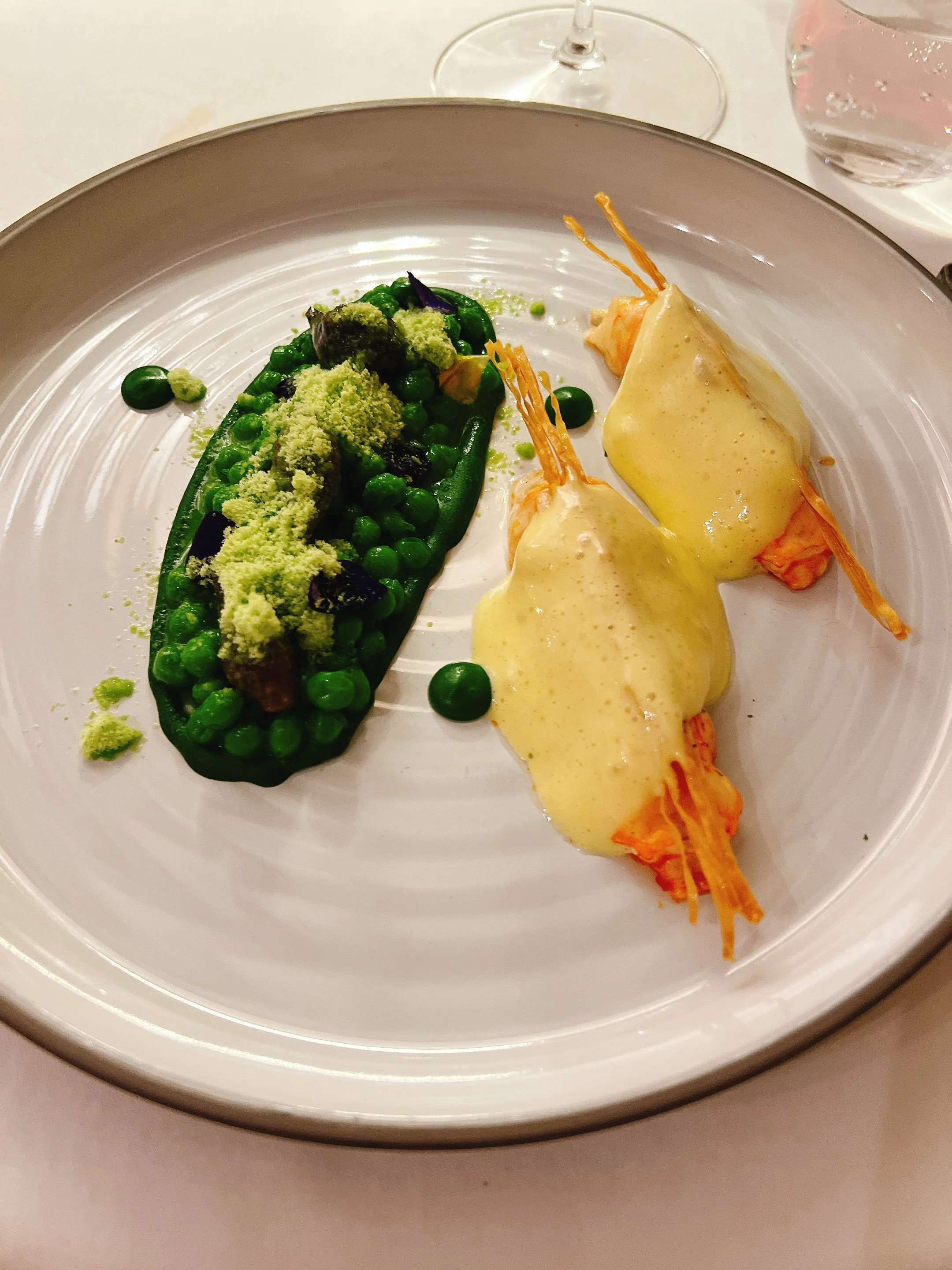 The pescatarian replacement was a preparation of langoustine with a sabayon sauce accompanied by first-of-the-season peas and browned onions. Apparently, we were the beta testers for this dish that would make its debut on the spring menu in a few weeks. It was truly excellent, beating the lamb hands down 19.
