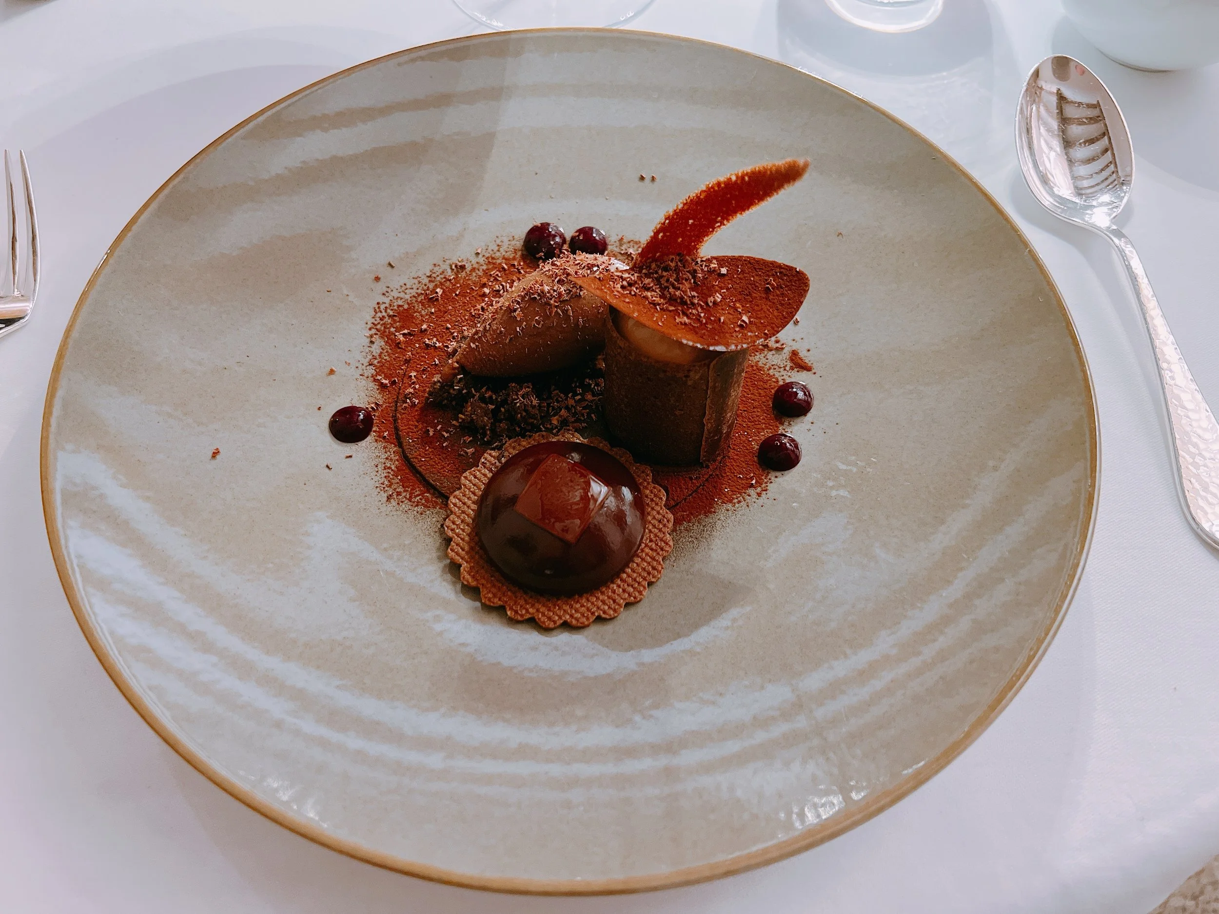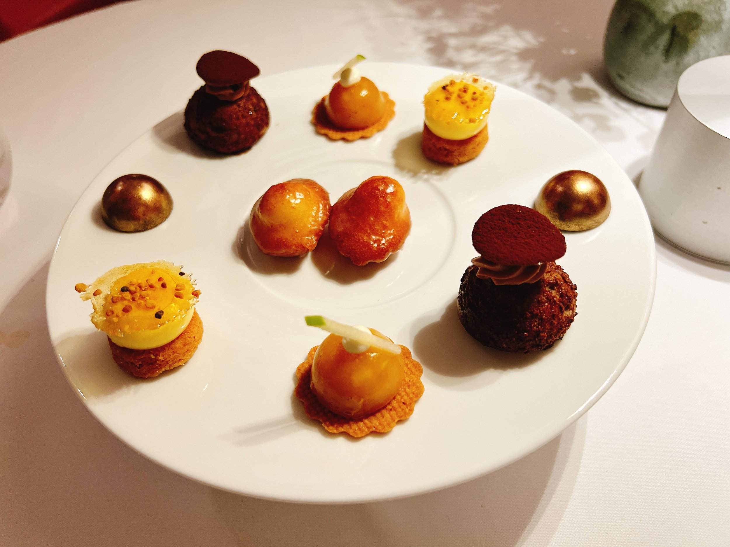 Petit fours (lemon tart, apple/passion fruit tartine, chocolate mousse praline, chocolate praline, lemon madeleine) preceded the dessert, and were nice 16.
