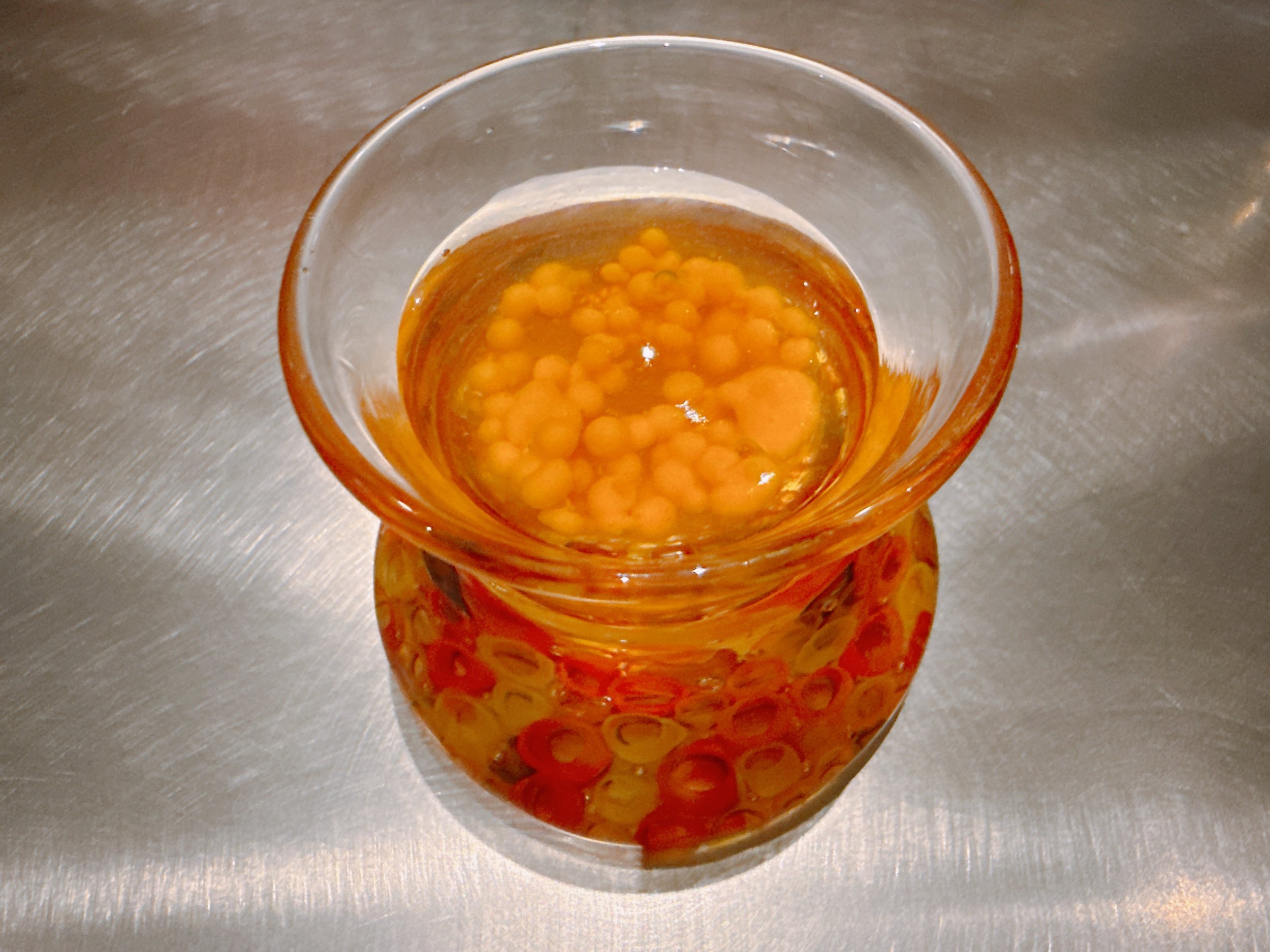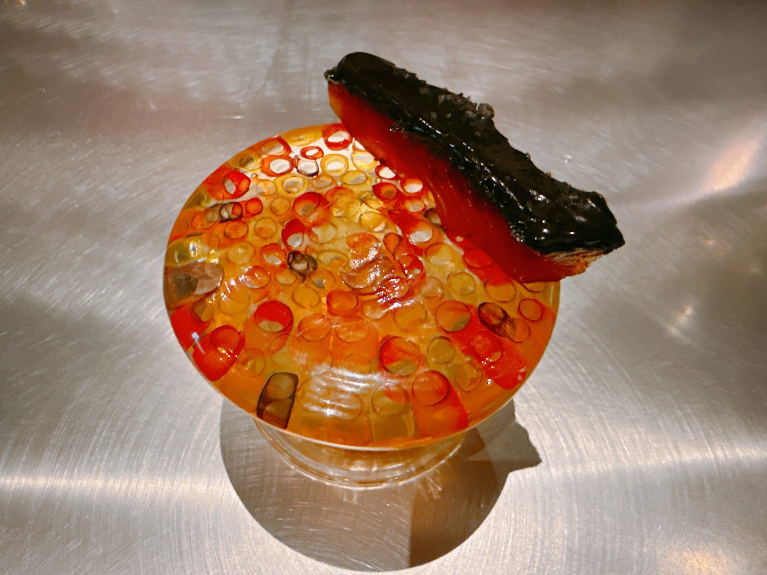 In a clever twist, the dish that was used to serve the char filet could be turned upside-down, revealing a cup filled with jello. That jello contained char roe and suspended balls of liquefied smoked Thai carrots. The roe provided some popping texture, but the rest of the dish was pretty much just jello, quite sweet with a light seafood taste. After the more flavorful filet of char, this was a step down 15.