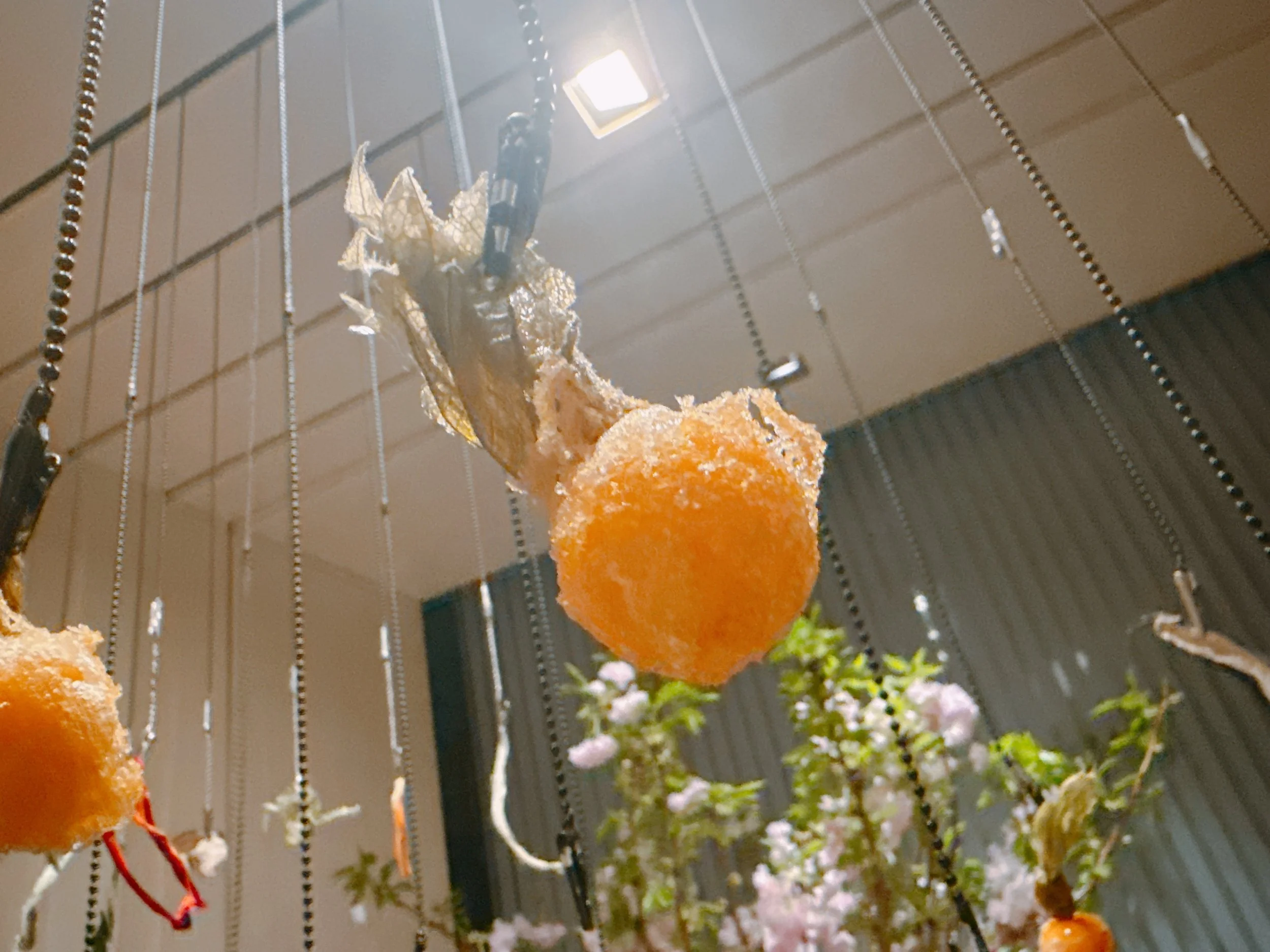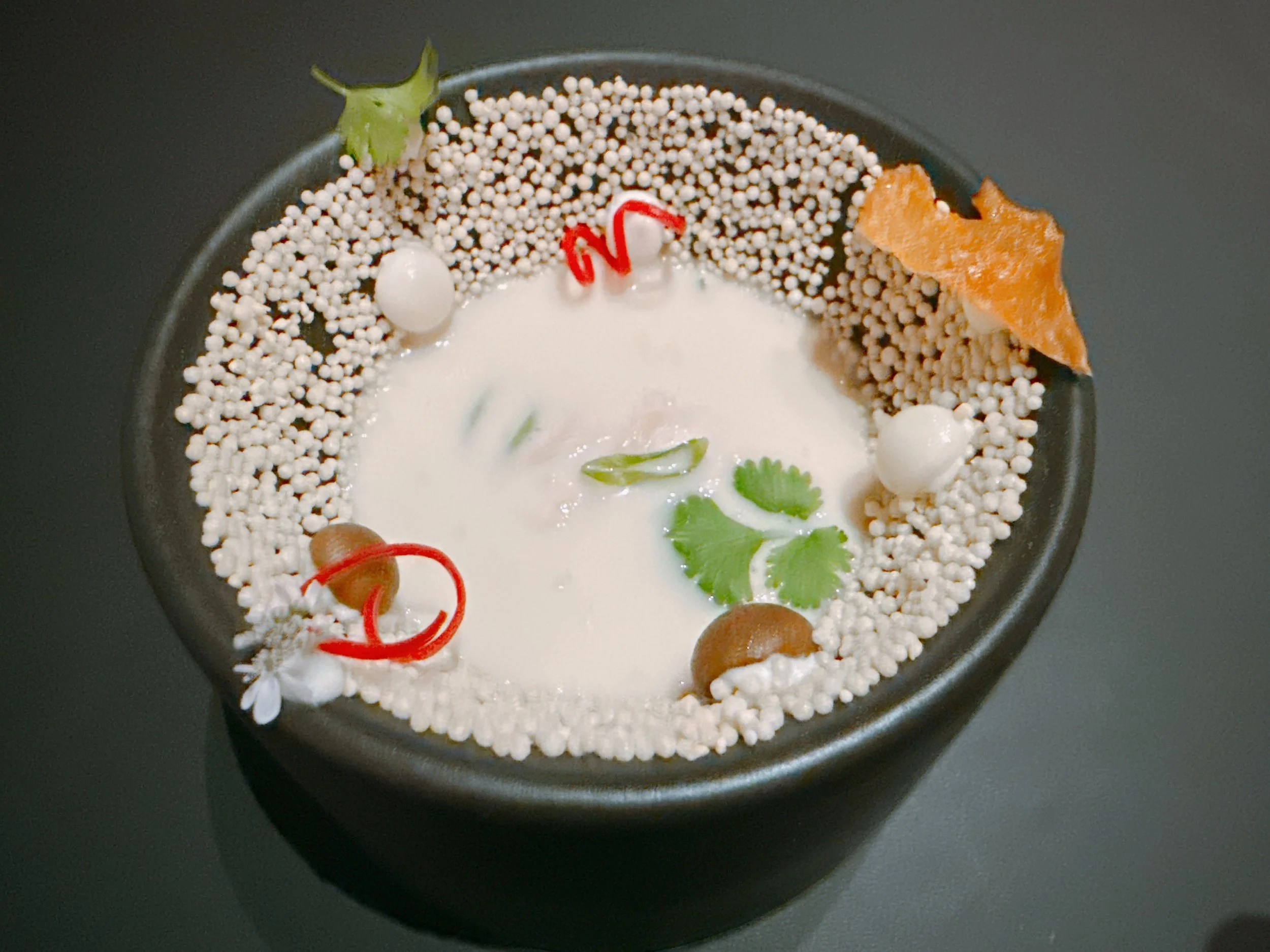 But let's back up a bit. During our walk from the front door to the dining table, we stopped in an alcove for a cup of tea: a mixture of horchata, chai tea, pandan, lemongrass and other ingredients (not pictured). It was light, fruity and acidic 17. In addition, we were invited to pick a tempura gooseberry that was hanging from the ceiling, next to other dried ingredients that would later appear in our dinner. The fruit was also light and a bit tart 16.