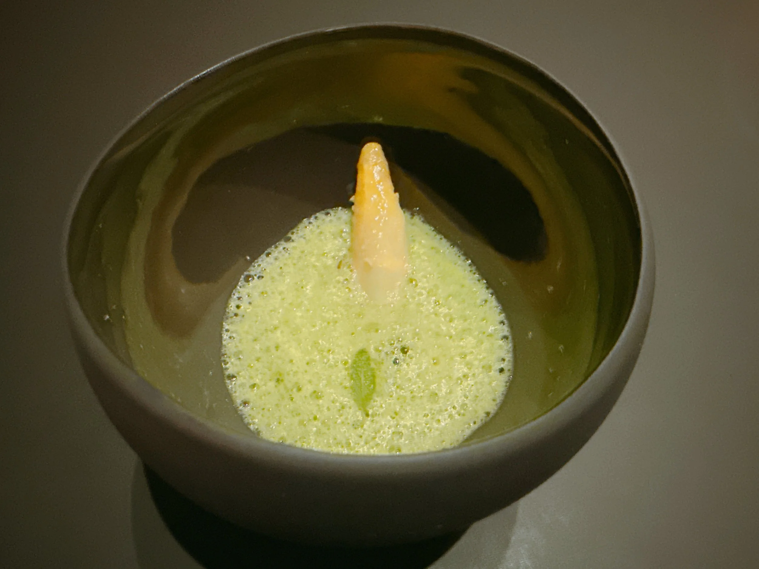 Next: a seasonal dish based on white and green asparagus. The white asparagus had been poached in olive oil and was served in a green asparagus aeration that contained a brioche crisp, some pieces of yuzu and a sage leaf on top. The warm white asparagus was lovely, in particular since it was soaked in the broth, and the sauce was nicely creamy with the acidic yuzu and marinated slices of (maybe) more white asparagus. The crunchy brioche wasn't too exciting tastewise, but I guess it was a decent textural additional 17.
