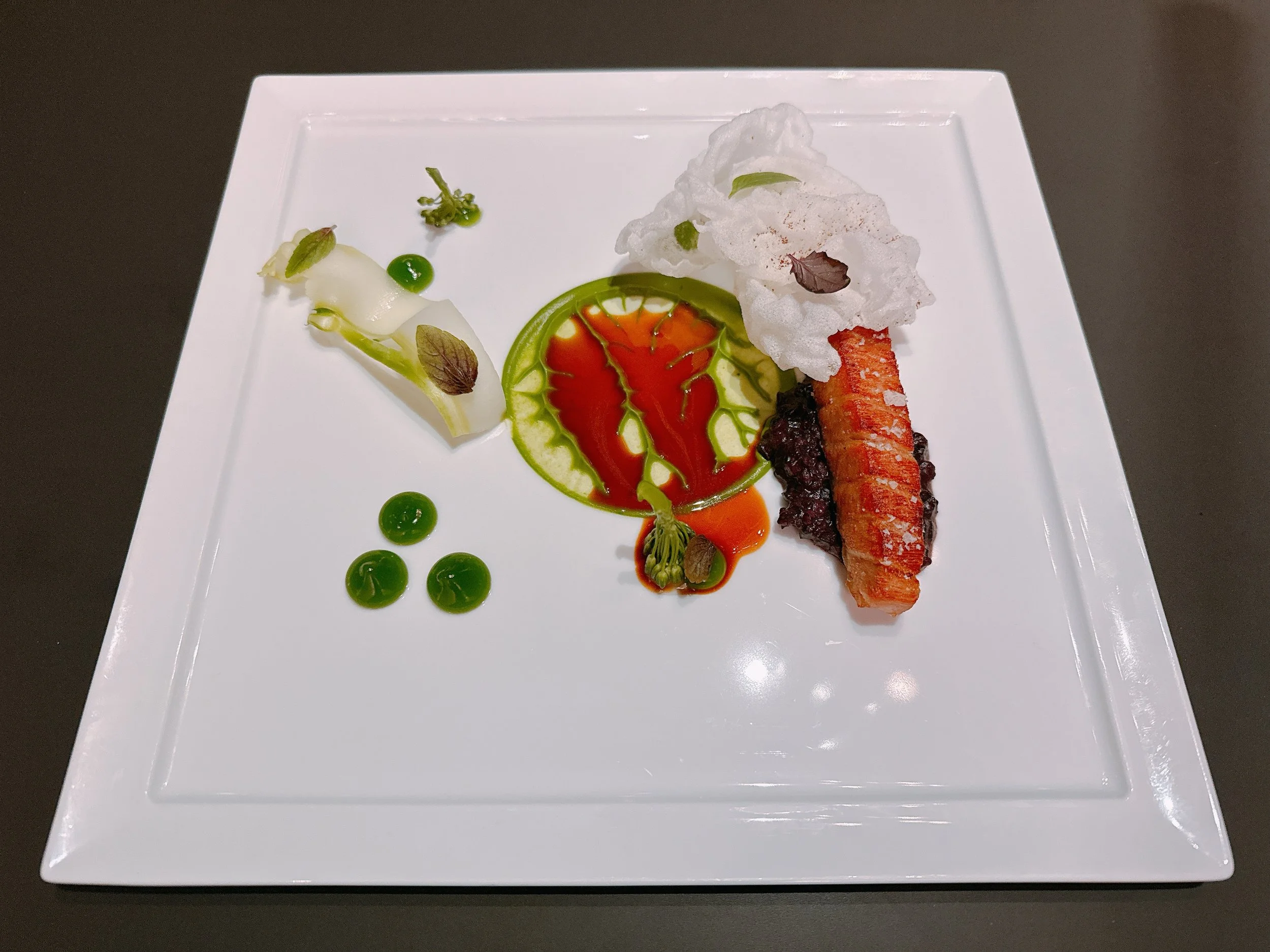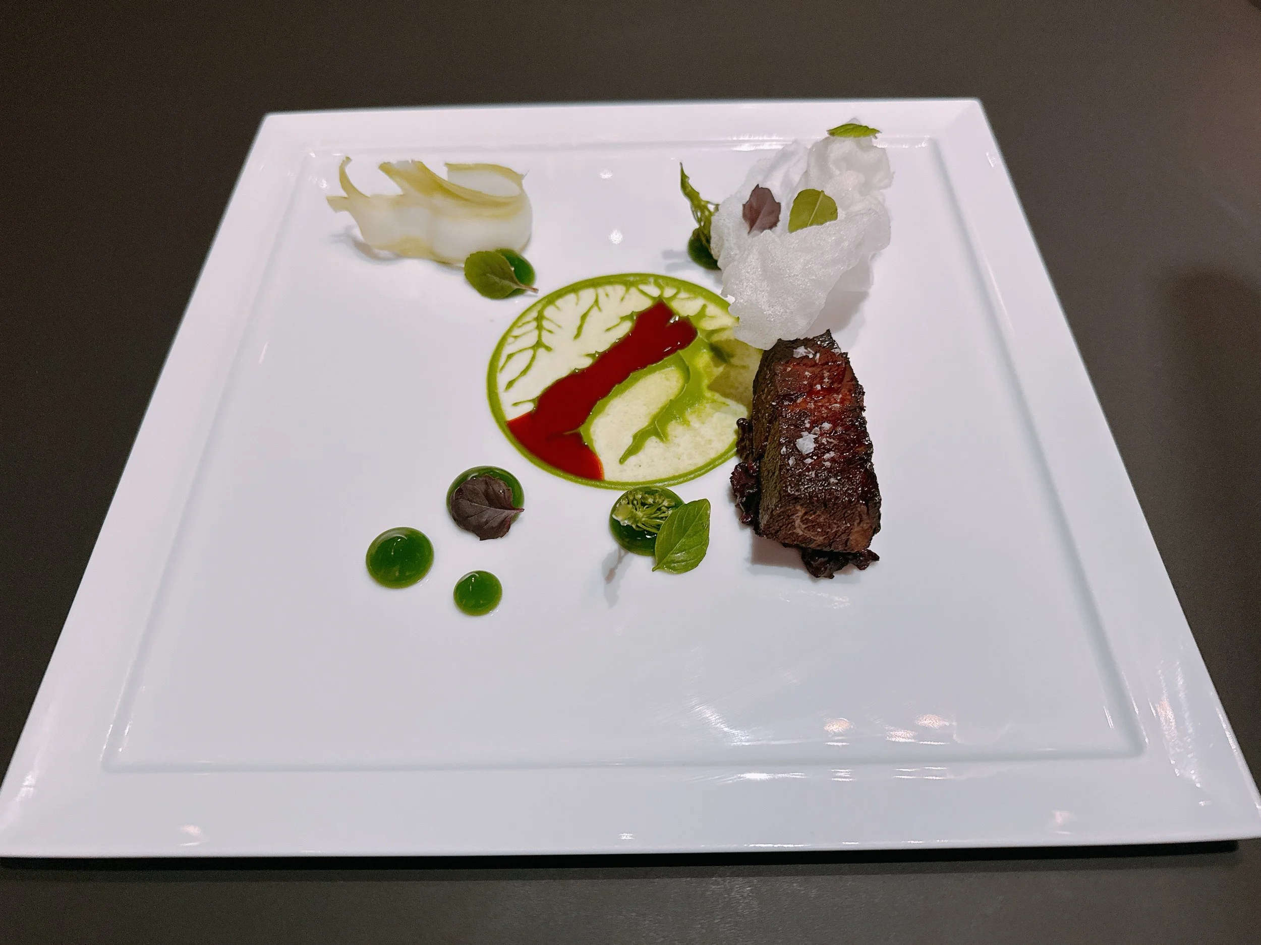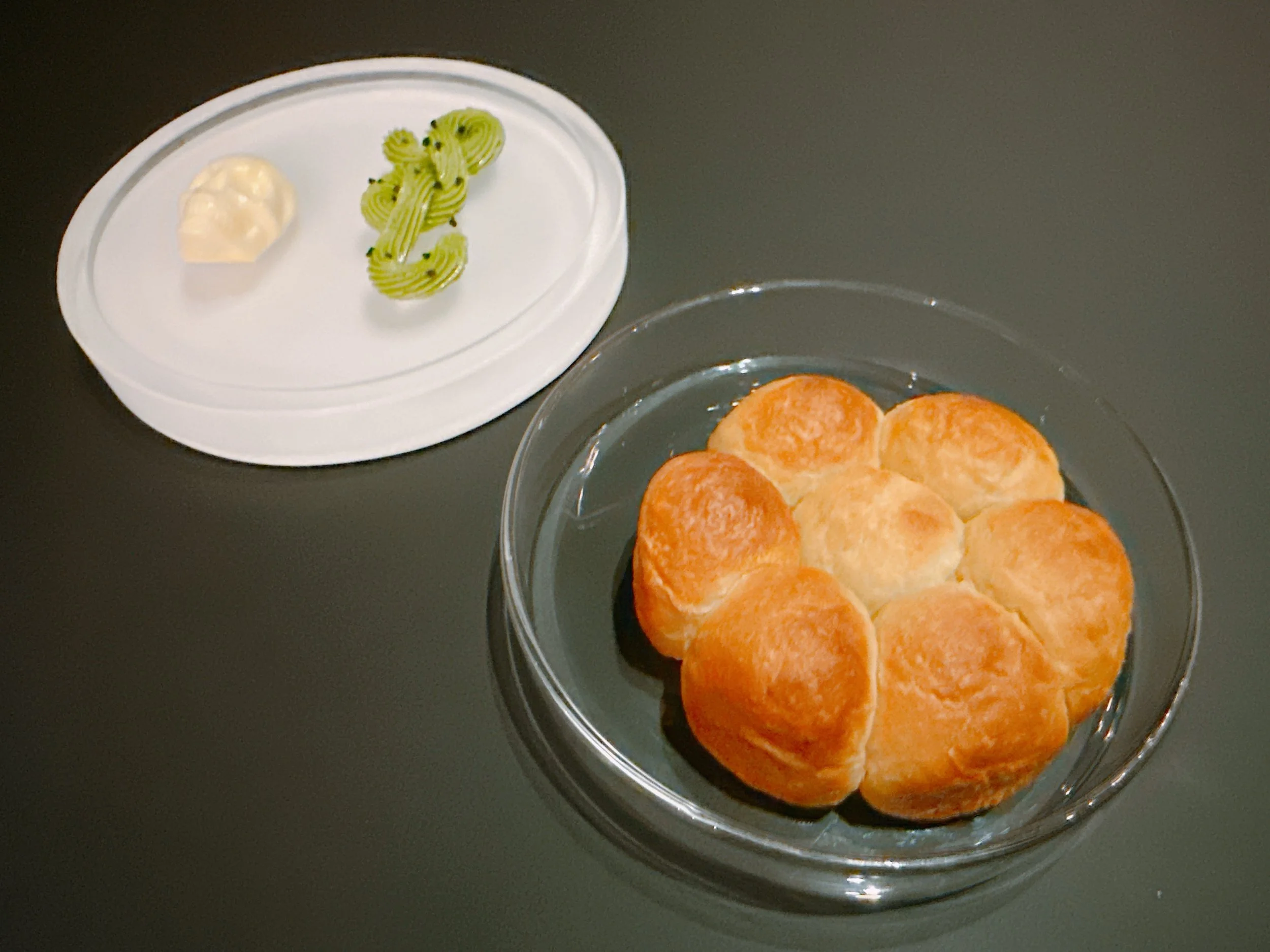 The bread course consisted of a Hokkaido milk bread and two spreads: a house-made buttermilk crème fraîche and an herb-infused butter from Wisconsin, both infused with rosemary smoke. The bread was pretty neutral in taste, but that was probably intentional: it was meant to sop up the sauces in the next few courses. The bread also went nicely with the spreads 17.