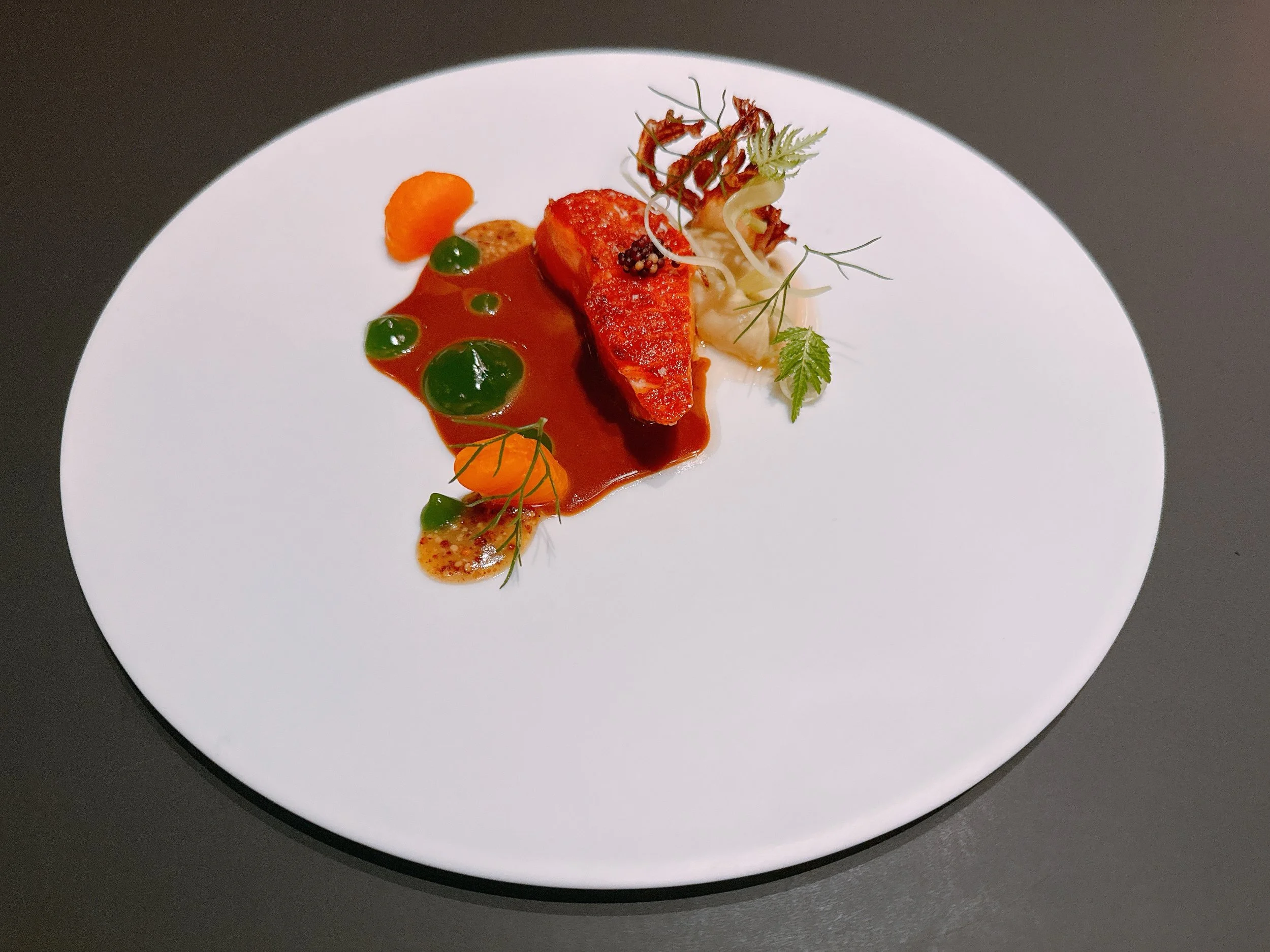 Roasted ora king salmon was served with a vegetable demi glace, two types of mustard, and fennel prepared several ways: fresh, as a puree and as a crisp. The salmon was cooked to perfection, with a crispy skin and an almost row-looking interior. I found the anise flavor of the fennel to be a bit much by itself, but it wasn’t noticeable when eaten together with the sauce. There was also a hint of spice in the dish - delicious. Only the two mandarin wedges seemed somewhat misplaced in the dish - maybe they were an attempt to stick with the course's orange color scheme 19.