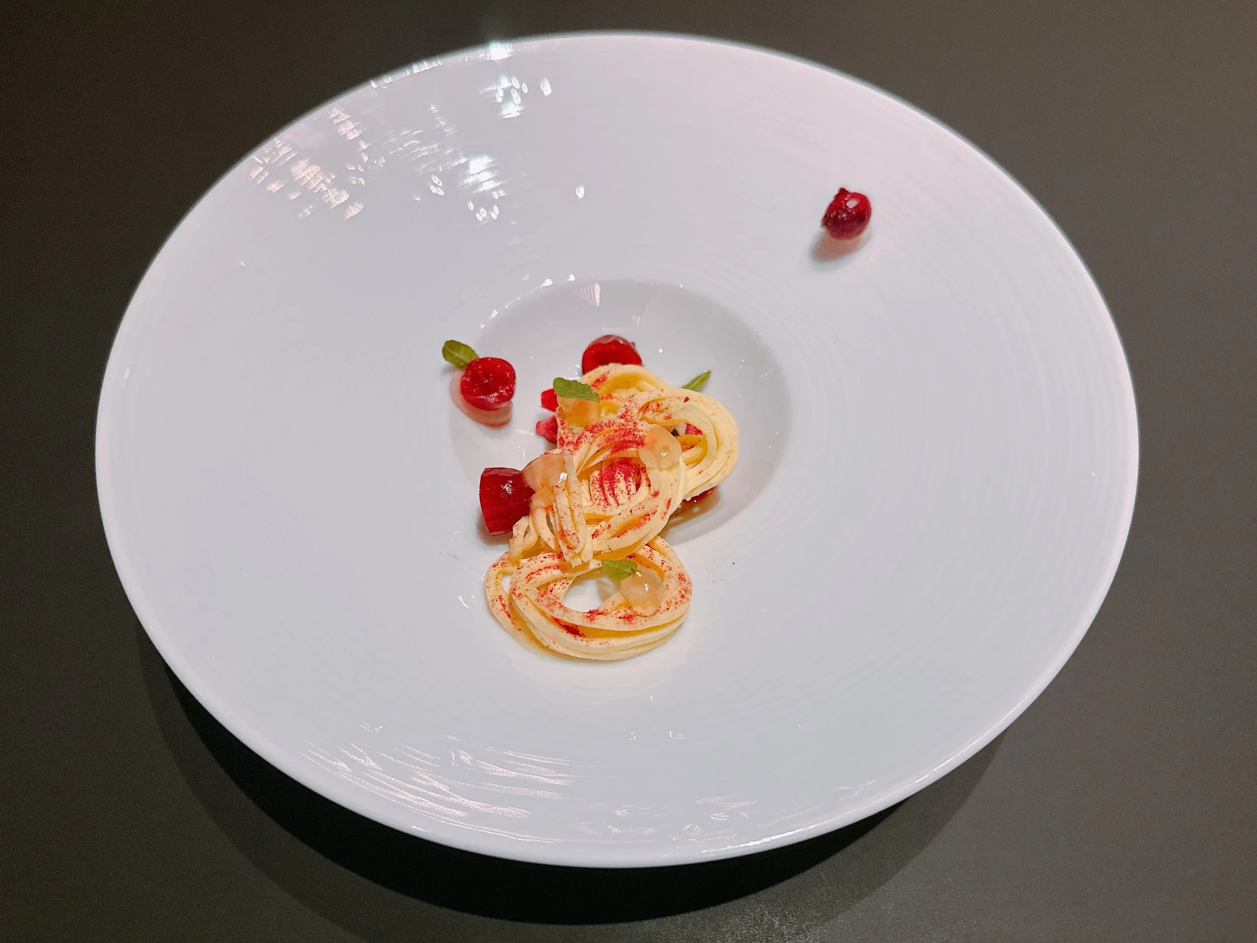 Then it was on to desserts. The first one featured a lemon/olive oil cake with cranberries, and a “pasta” made from cream topped with jam dust and green chartreuse. Clearly, this dish was made to resemble spaghetti with tomato sauce, while being nothing of the sort (and also quite unlike a German “spaghetti ice cream”). The “pasta” was creamy and sweet, and the cranberries added some fruit and acidity. Fine, but not mind-blowing 15.