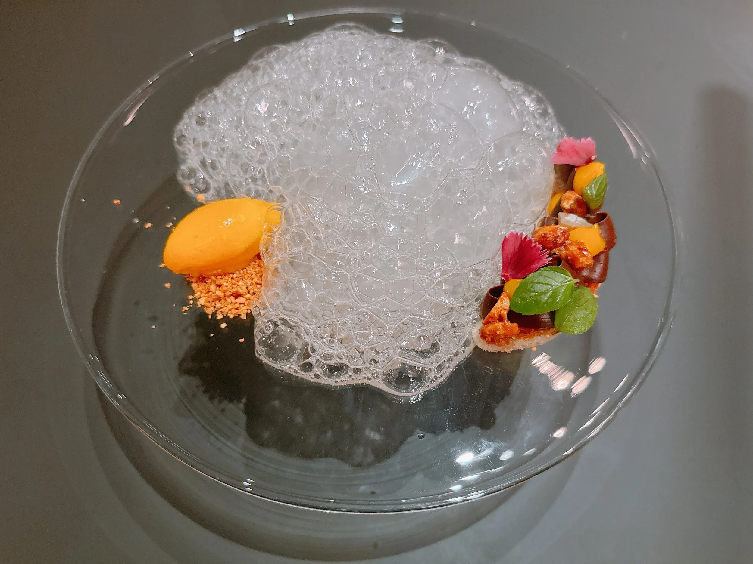 The second dessert had a curious presentation. It was served on an elevated plate that had a hole at its center. Inside that hole was some dry ice to which our server added a banana/chai tea. That resulted in copious amounts of lightly acidic foam spilling over the two plated parts of the dessert. One was a mango sorbet on brown butter crumbles, the other a banana financier with chocolate mint toppings. The mango was fruity and quite thick in texture, the banana/chocolate combination classic, but relatively light on the banana front (maybe a good thing). The acidity of the foam lightened the dish up further - something always appreciated at the end of a long tasting menu 16.