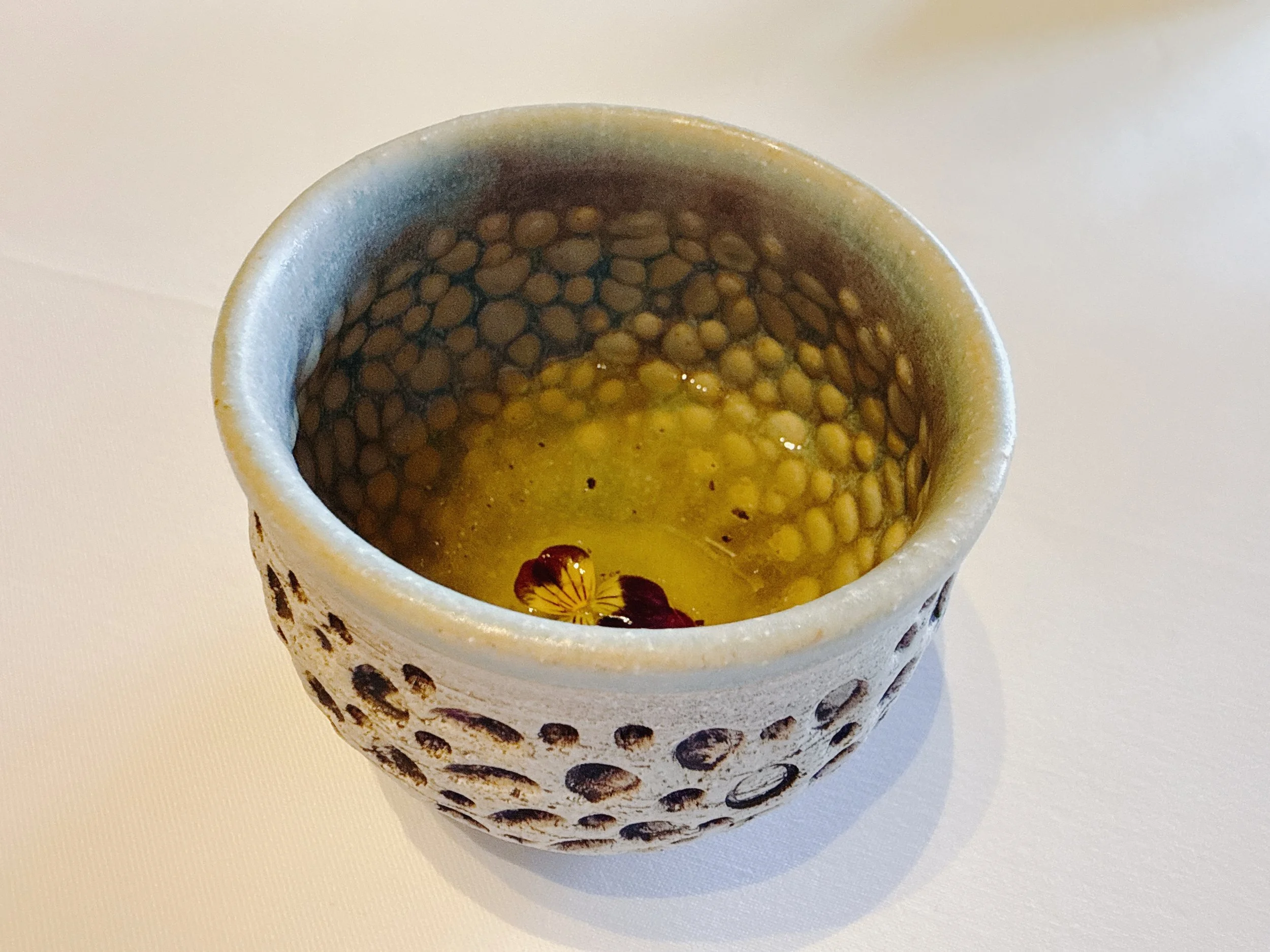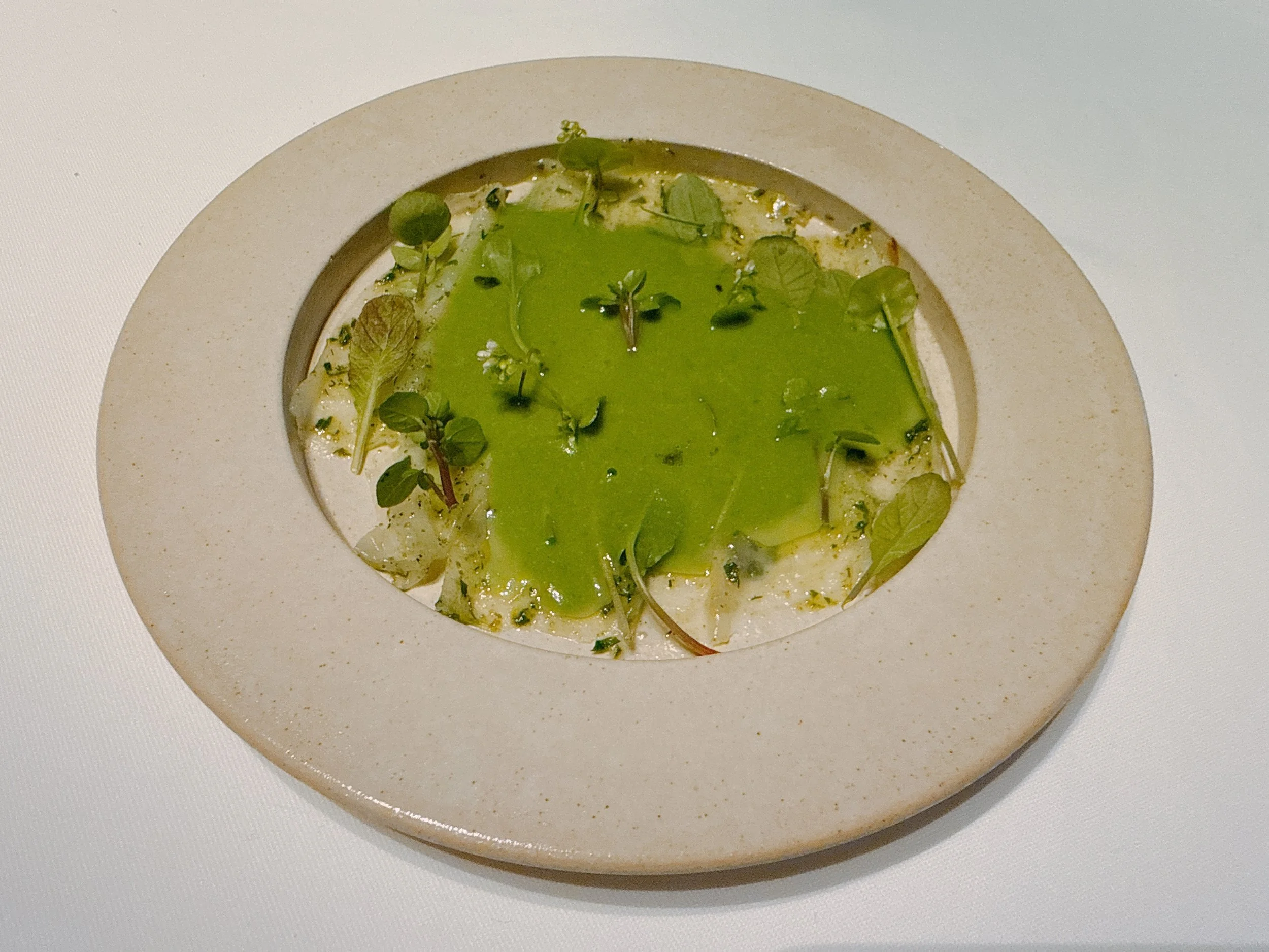 Our official first course was a spring vegetable broth, seasoned with black pepper, chervil and nasturtium oil. The soup had a very light vegetable taste, it almost felt Japanese in its avoidance of strong flavors 14.