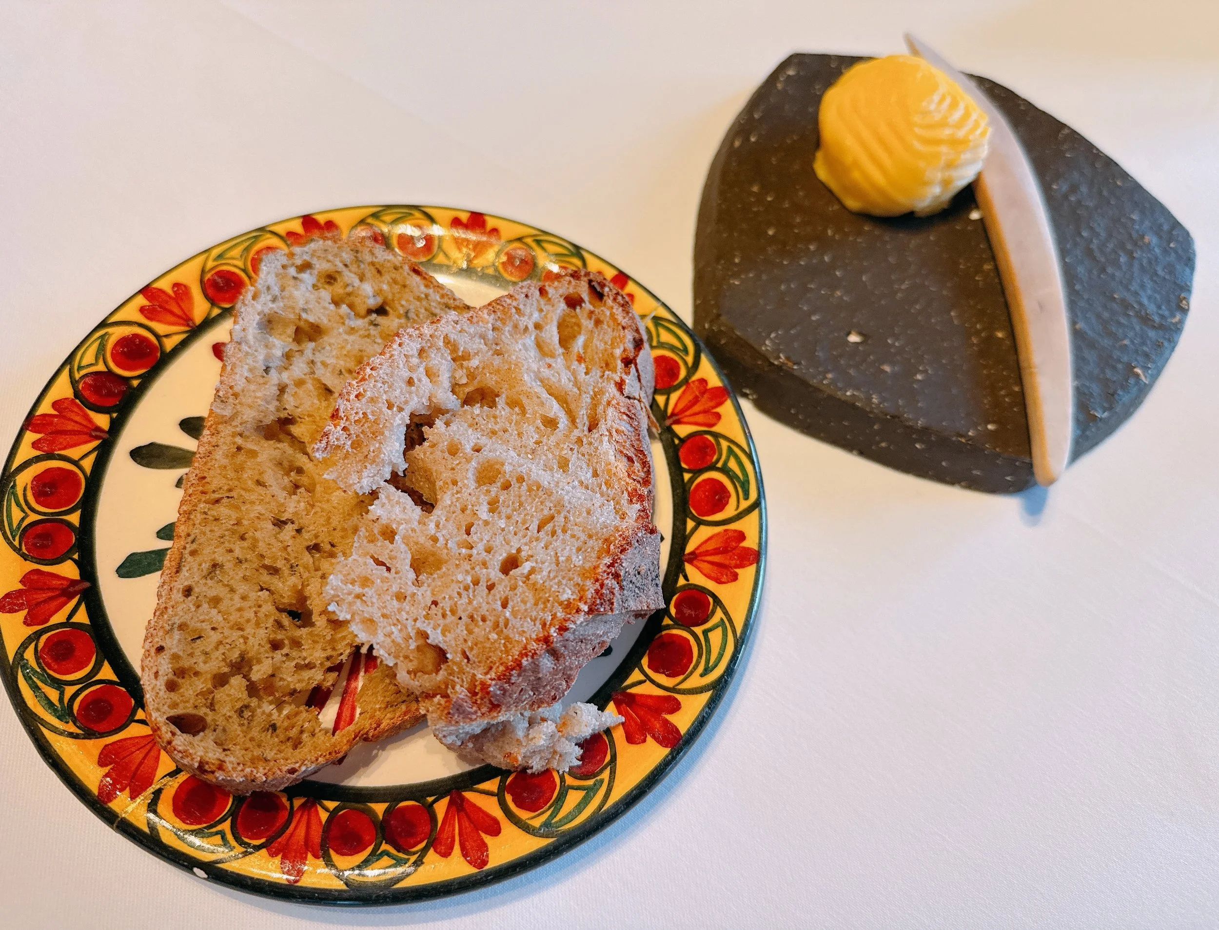 We were then served two slices of bread, both at room temperature. One was a country bread, the other contained some seaweed. Both were crunchy, rustic and had light flavors. The lightly salted butter from near Rennes was a bit underwhelming at first, but developed more of a taste once it warmed up during our dinner. A pretty neutral bread course, but given the light flavors of the food, anything more would have been a poor fit 14.