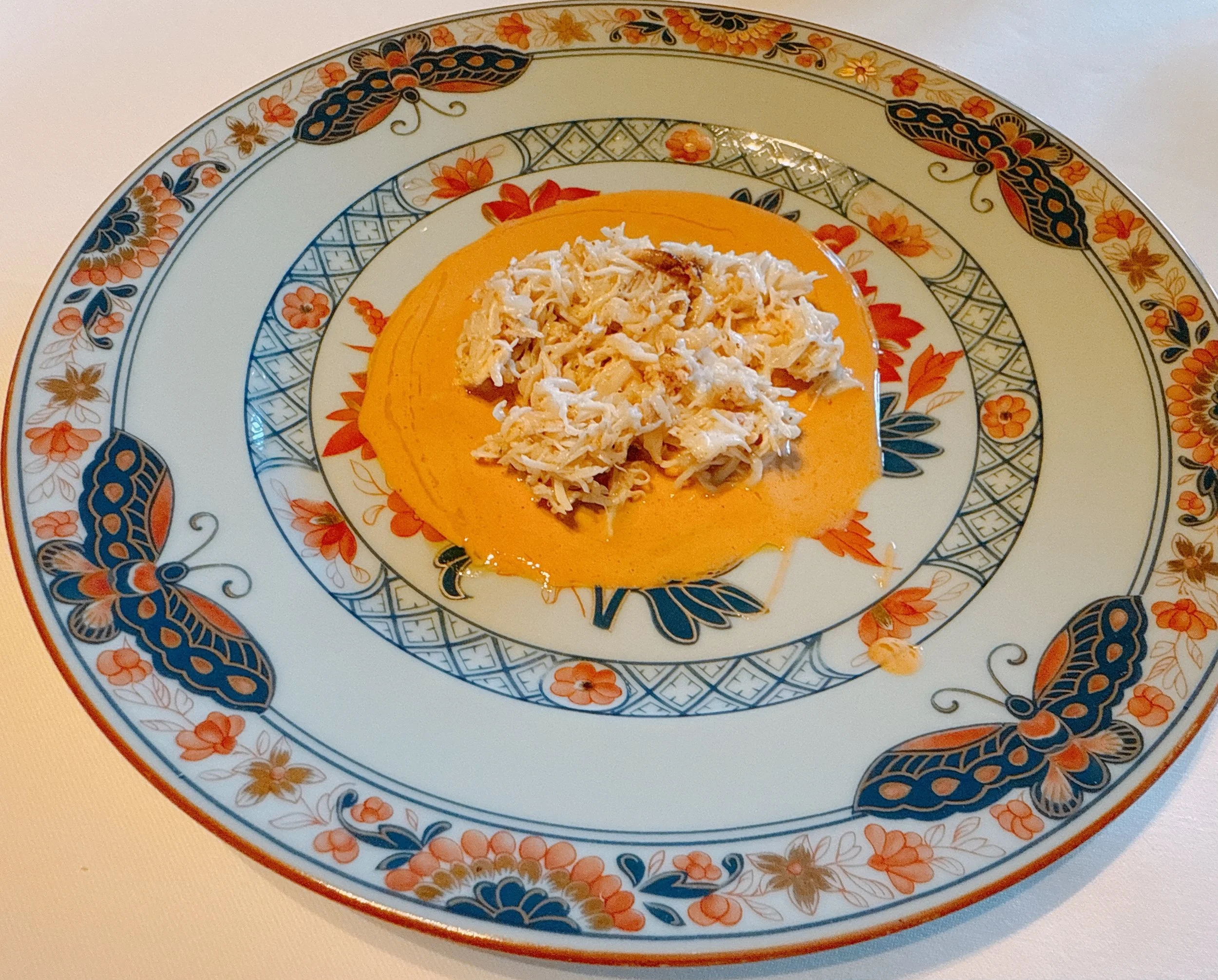 Our dinner started in a lounge next the dining room. Here, we were served an (optional) aperitif and a few small bites. First, we had smoked slices of red mullet seasoned with the family's “Neptune Powder” spice mix. The fish had a smoky and lightly marinated flavor, but the spices were almost impossible to taste 15. Next, we tried a carrot seasoned with shiso, coriander and mustard flowers. The carrot was crunchy, and its sauce had a hint of acidity, but the other flavors were extremely light. Essentially, just a piece of carrot then - not too exciting 13. Our third bite was an oyster from nearby Cancale topped with a dollop of chili sauce. The oyster had a briny taste, but the chili sauce was very light 15. The final serving in the lounge was a cream of pollack, sandwiched between two very thin crisps. The fish flavor was so light to be almost non-existent - clearly there was a pattern here. The crisps were fine, though: crunchy on the outside, and getting softer towards the middle where the fish cream was 14.