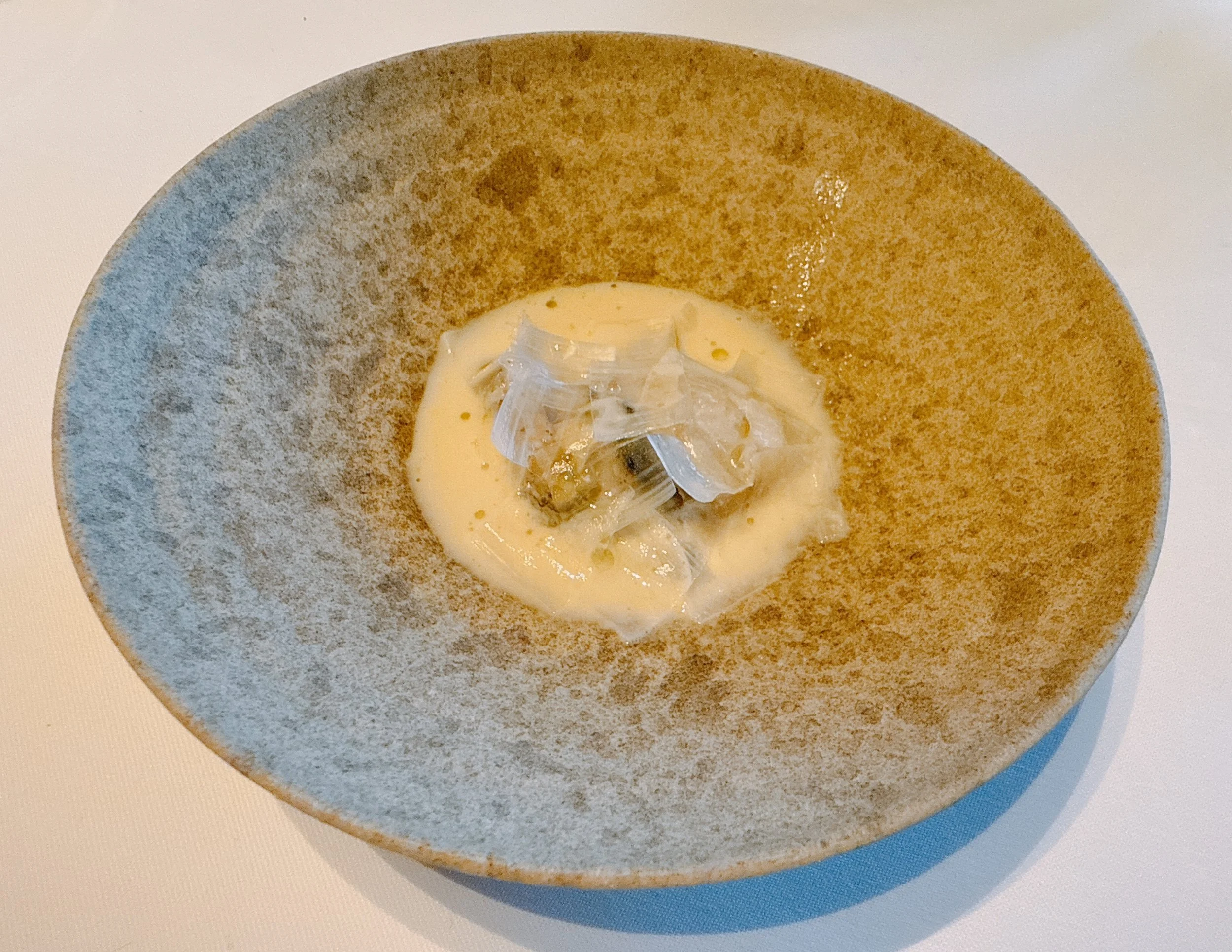 Another oyster from Cancale was served with thinly shaved pickled white asparagus, a lemon condiment, and a sauce made from angelica and jasmine. The medium-size oyster tasted of the sea, and the white asparagus was pretty lightly flavored. The more one ate of this dish, the more there was a hint of lemon 14.