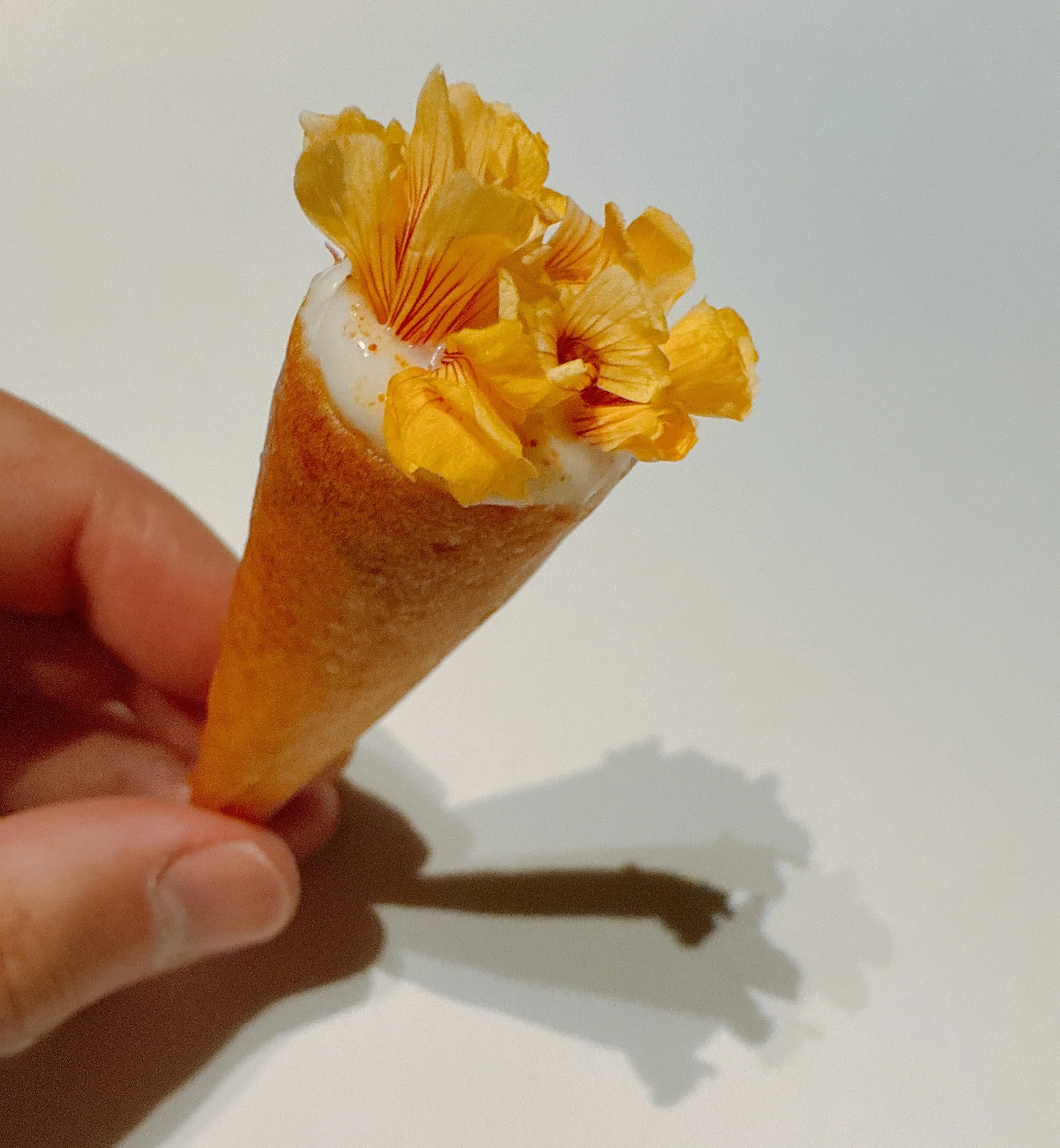 The long awaited next serving was a crunchy crepe cone filled with a cream made with turmeric and the honey from the restaurant's beehives. Interestingly, the filling seemed to have a texture reminiscent of bee pollen 14.