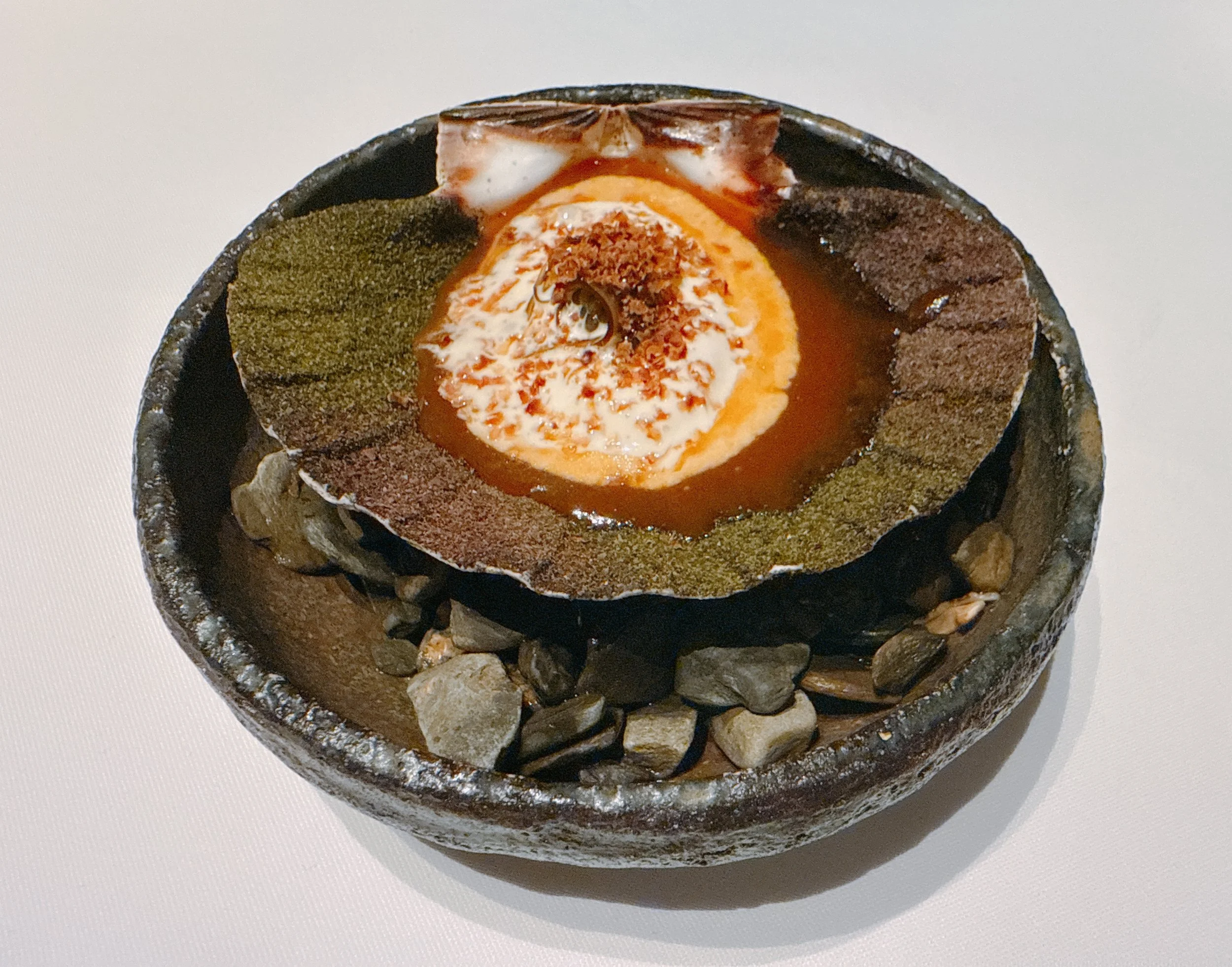 The next dish featured a spider crab. Its meat had been marinated with verbena pepper and was served on top of a sauce made from the crab's head, maritime pine oil, vinegar and fennel oil. The crab meat was of good quality, but again had only light flavors, although they were getting a tiny bit stronger compared to previous dishes. There was a small amount of spice, and the sauce was a bit mealy in texture. Just as with the previous dish, the more one ate here, the more pronounced the flavor became 15.