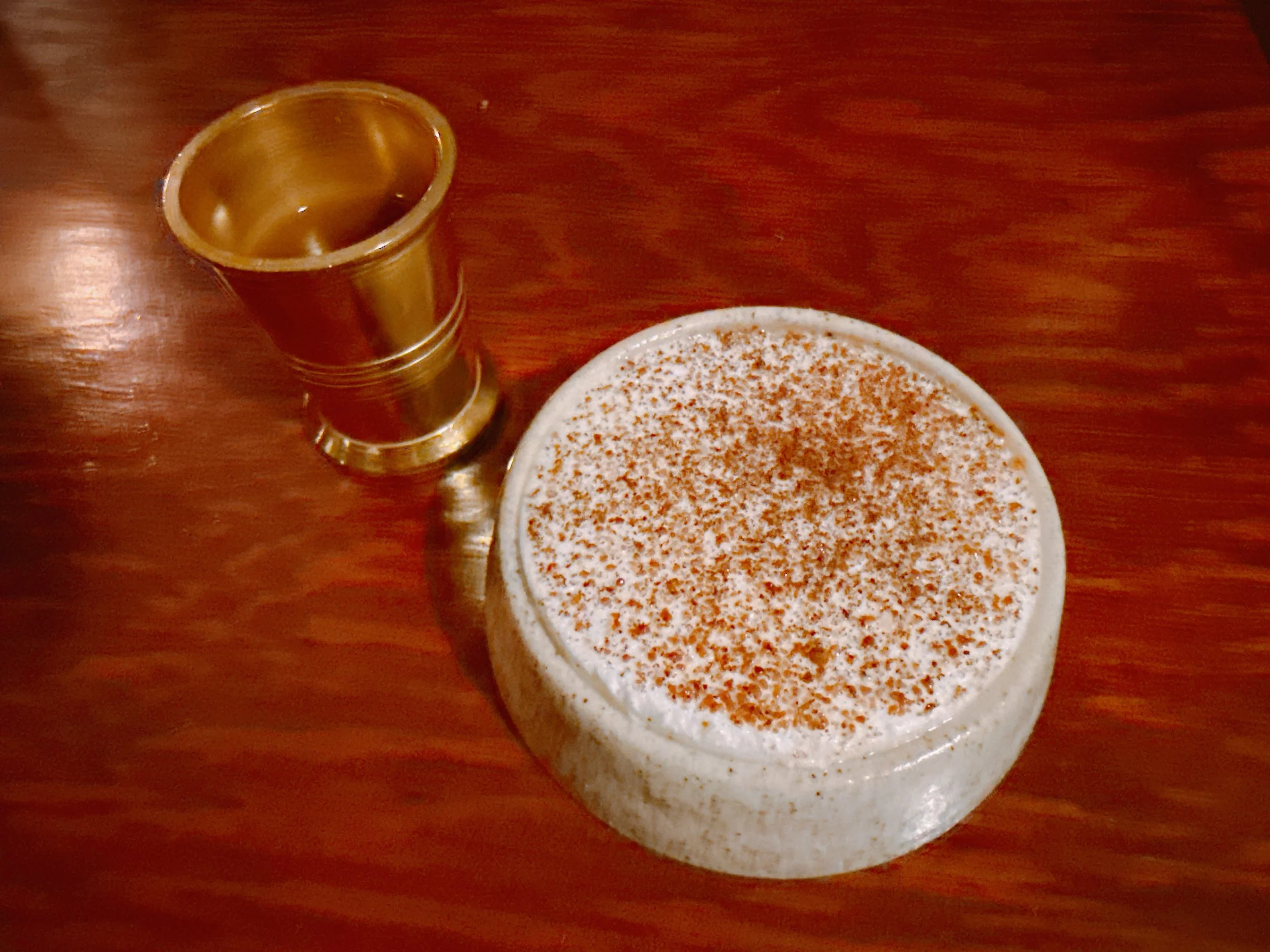 For the last couple of bites, we retraced our steps to the lounge. The first dish contained three variations of vanilla: marshmallows, a sauce and a kind of meringue. It came with a hot infusion of white rum, hot cider and spices. Both allusions to the spice trade, evidently. The dessert was fine, and the drink tasted mostly of cider 15.
