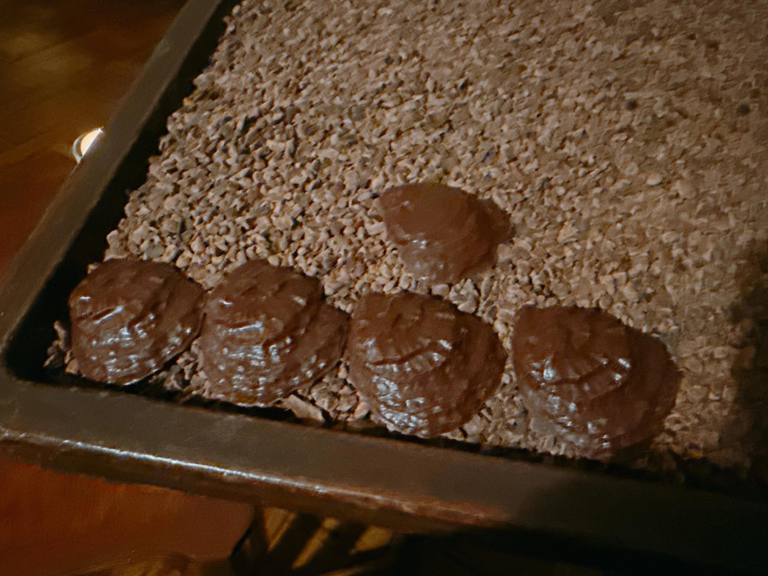 Finally, we received a dark chocolate disc that was filled with black sesame and buckwheat. Not exactly the prettiest presentation for a chocolate praline, but its filling was nicely crunchy 14.