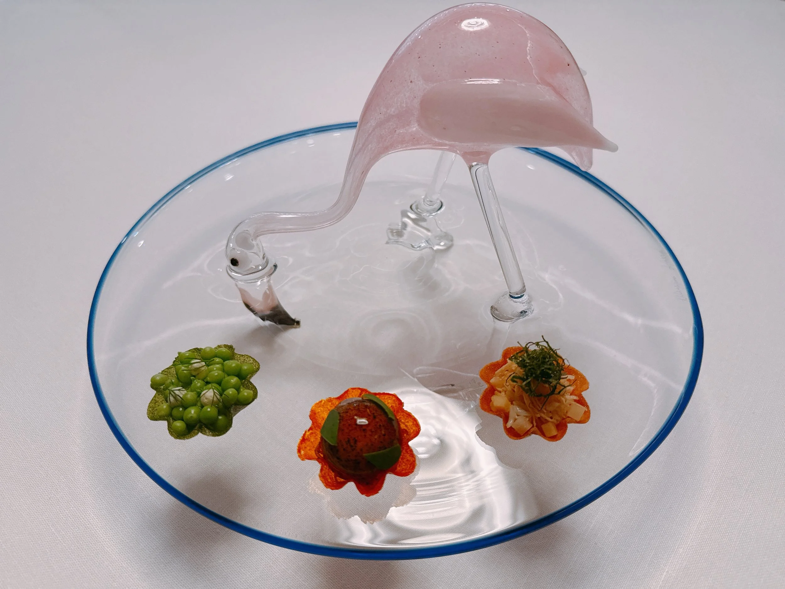 The first course was a trio of small bites, presented on a plate that had a glass flamingo on it - a curiously goofy design for a restaurant that otherwise had such a minimalist decor. First, I tried a little sphere filled with carrots and red oolong tea. Served slightly cold, it was definitely a mix of flavors - maybe of tea with an aftertaste of carrot. A bit confusing - without the explanation I wouldn't even have begun to guess at the ingredients 15. After that, there was a little tart with peas and lovage. The fresh, popping peas were quite nice, but did not have a very strong pea flavor 16. Finally, a tartlet filled with spider crab and ginger. This bite had by far the strongest flavors among the three - a very pronounced crab flavor, to be precise. Seafood of good quality, lovely 18.
