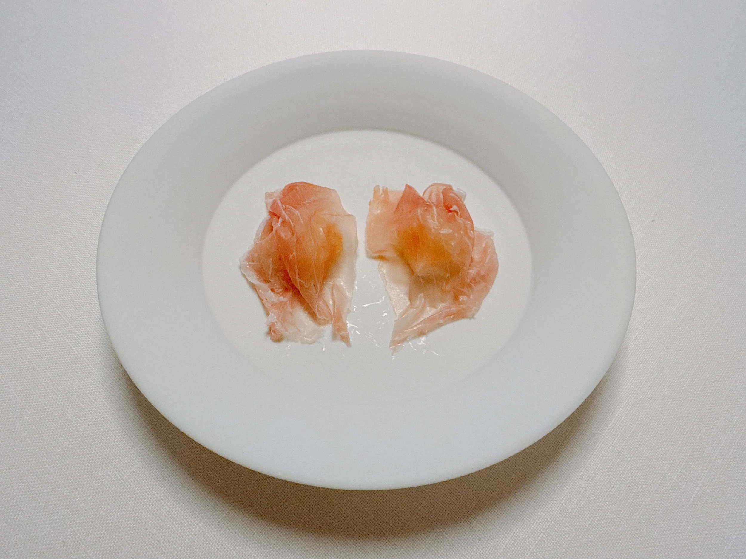 Shortly thereafter, the wine pairing started. Foodwise, raw and cooked squid was seasoned with horseradish and topped with a thinly sliced, 24-month-aged Parma ham. The squid was served warm, and something about its preparation reminded me of good squid sushi. The ham mostly added a bit of saltiness. Despite its simple presentation, the flavors of this dish were quite elegant 17.