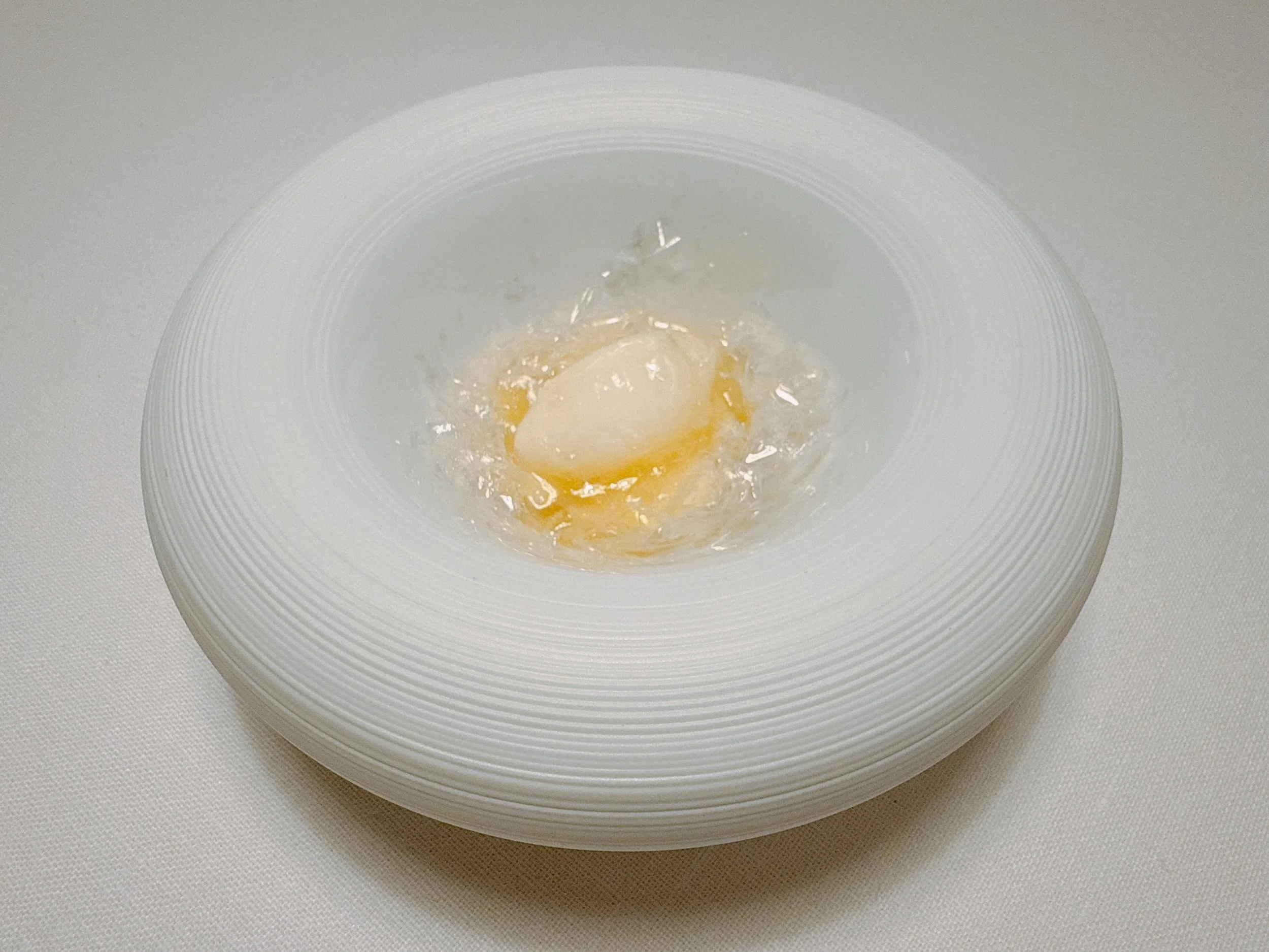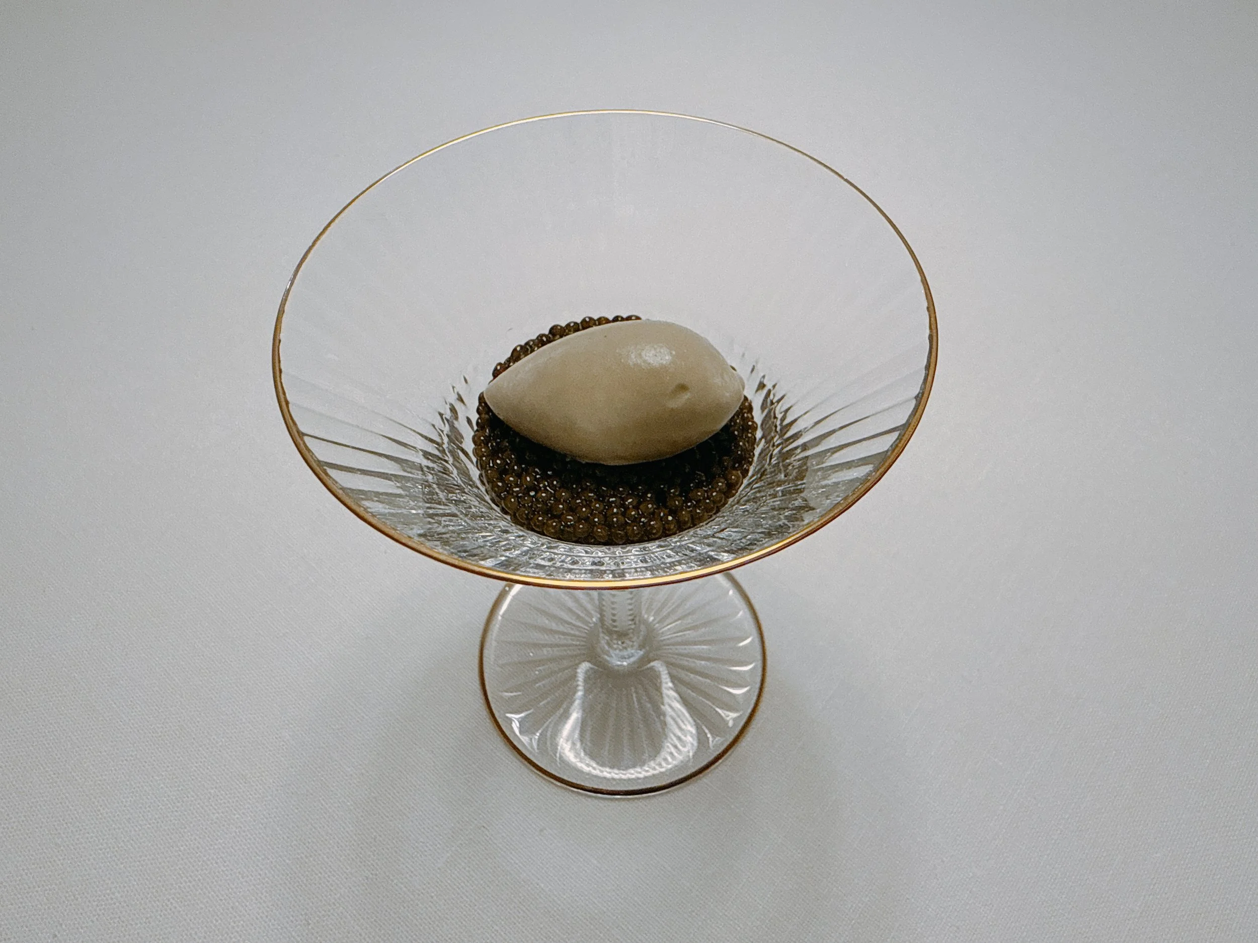 One of the chef's three signature dishes arrived next. At the bottom of a cocktail glass sat a generous helping of imperial osetra caviar. On top of it was an ice cream made from a “No. 0” (i.e. very large) oyster finished with a few drops of whiskey. This dish was inspired by a trip that the chef took to Scotland. On that trip, he was served a (fresh) oyster seasoned with whiskey instead of the more traditional choices, such as lemon juice or a mignonette. Fittingly, this dish was paired with a 10 year old Scotch, the same that was used in the dish (unfortunately, this was not part of the wine pairing, but cost extra). The best part of this dish might have been the caviar: creamy and salty, I would have happily eaten a lot of it, and thankfully this was a large serving. The oyster ice cream added a more pronounced sea flavor the dish, reminding me of crashing waves. A simple looking, but quite delicious dish. It was impossible to taste the whiskey directly in the dish, but the paired whiskey was pretty nice - not too strong, and almost a bit sweet when combined with the food 18.