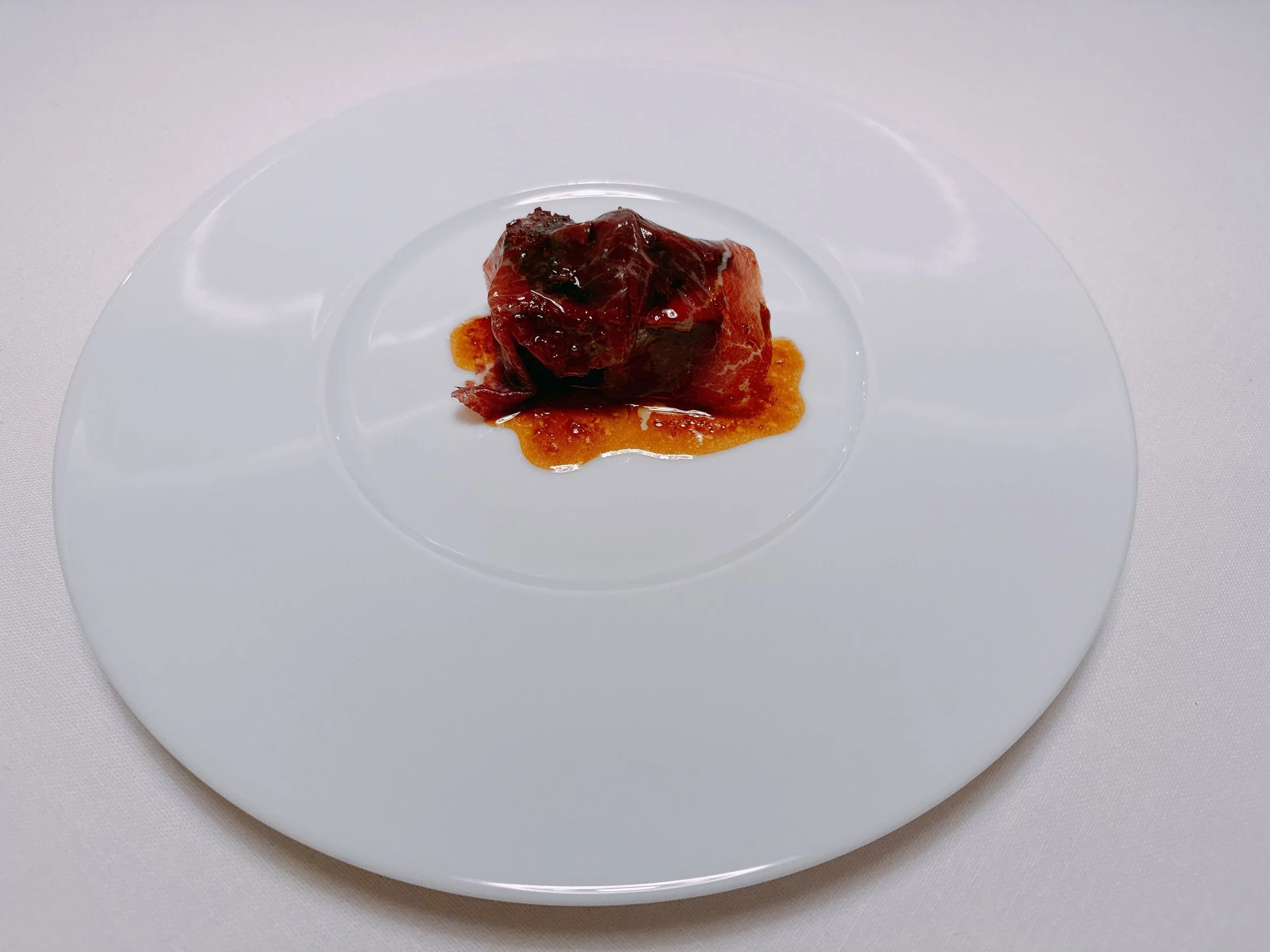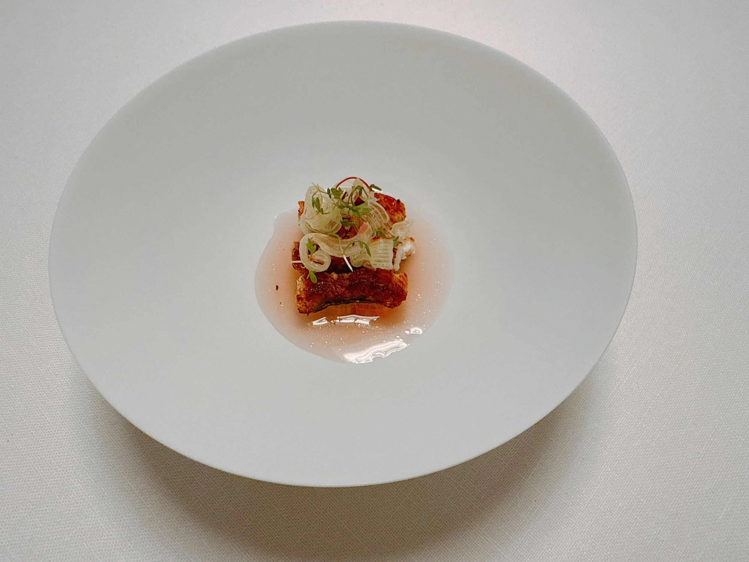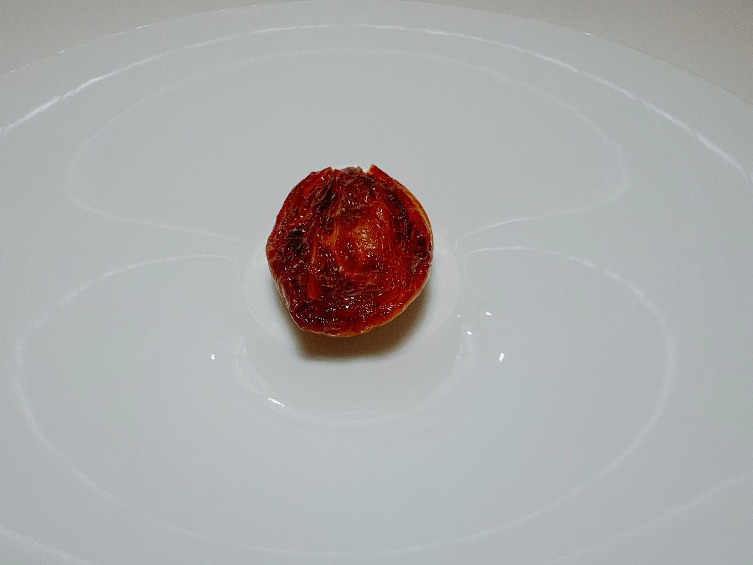 The last two savory dishes were again optional additions for the shorter tasting menus. First, a caramelized onion that had been taken apart, layer by layer, before being reassembled with chorizo slices in between the onion layers. (I had recently seen a similar presentation, but using truffles instead of chorizo, at Odette in Singapore.) This dish was served very hot, and the onion was very sweet, not sharp or spicy at all. So even though there was a hint of chorizo flavor, it was overpowered by the caramelized onion, making this practically a dessert course. I love onions and chorizo, but I would have preferred them in a savory dish 15.