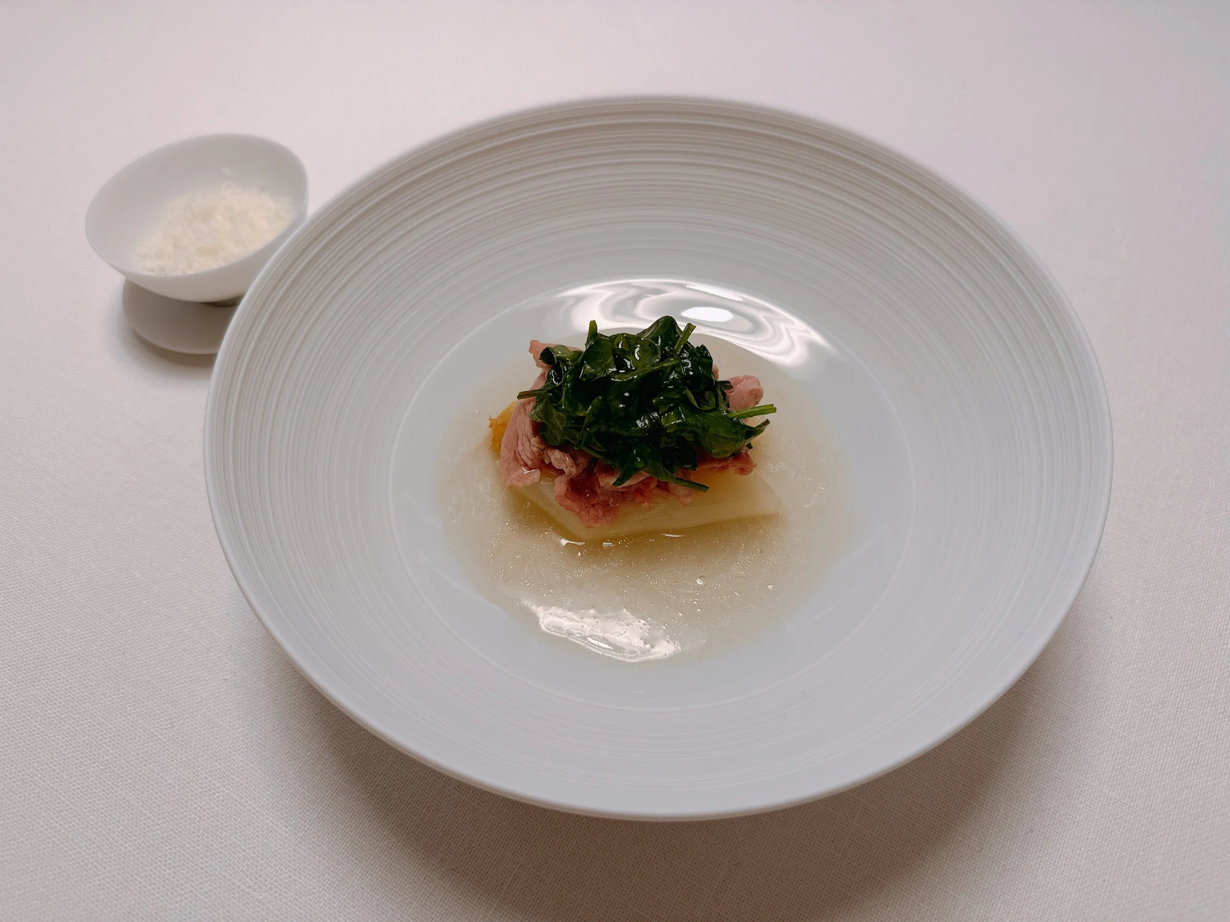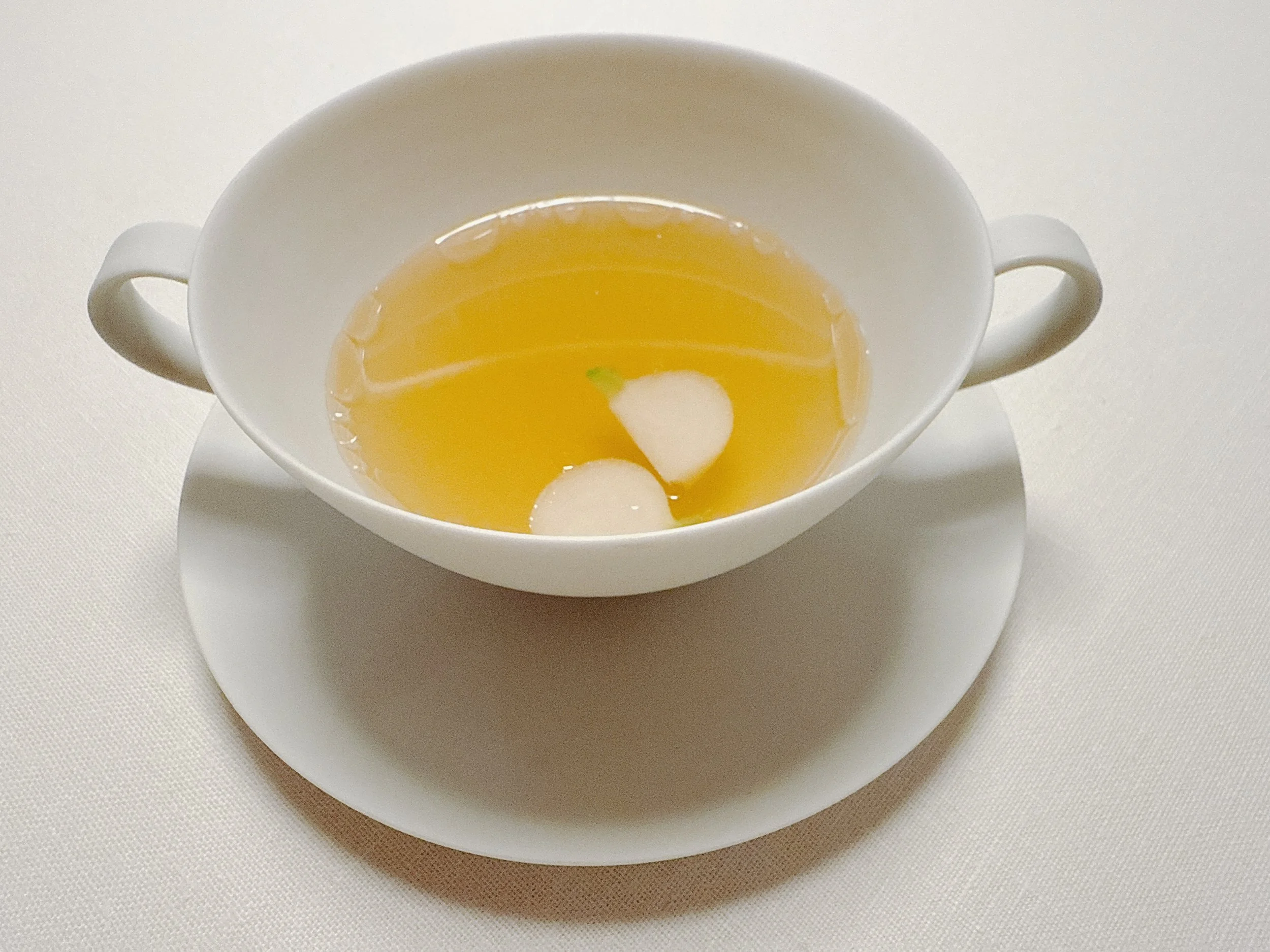 The next course was somewhat unusual for a French tasting menu: a Bresse chicken consomme with almond oil and small turnips. Essentially, this was a French take on the Japanese tradition of serving a clear soup during a kaiseki meal. (My server informed me that it was also intended as a palate cleanser.) The broth was served very hot, and was more a subtly seasoned soup rather than a “mere” chicken broth. The turnips were very juicy and suffused with vegetable flavors 16.