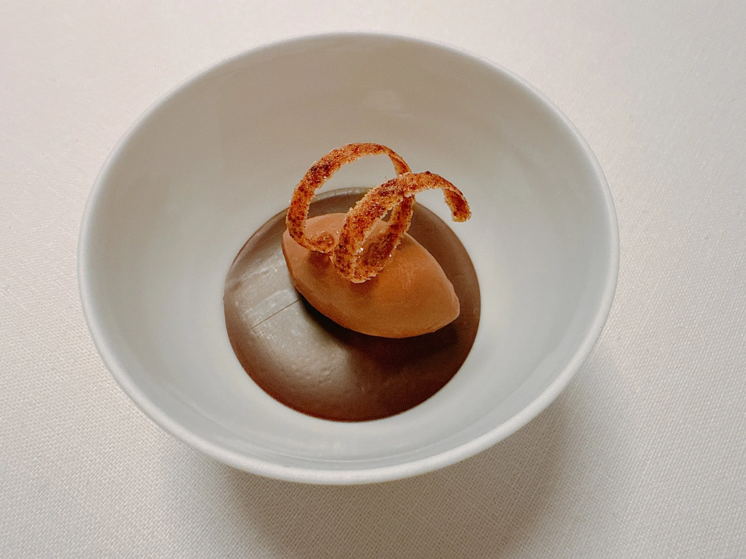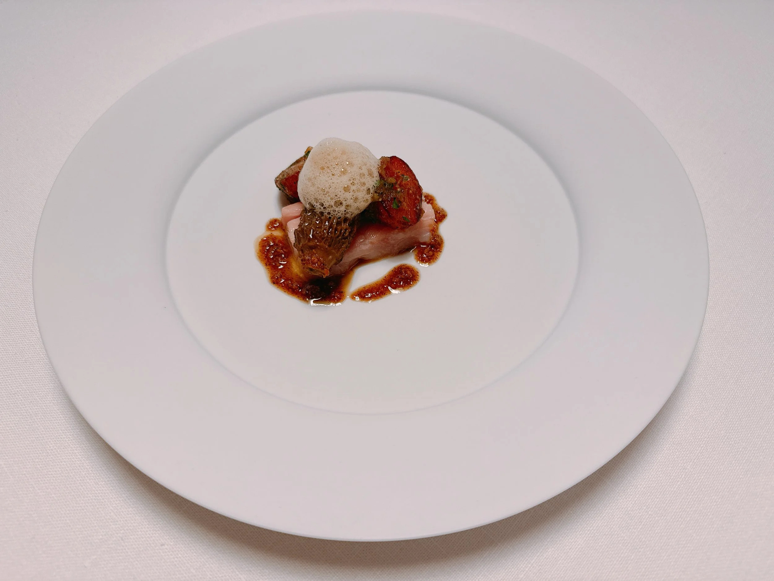 A three-day-cooked veal breast confit was served with baby potatoes from Noirmoutier, morel-stuffed morels and a sauce made from breadcrumbs, butter and oil. On top of the dish was a mushroom emulsion. The meat was very tender and had a distinctive and delicious veal flavor - by itself maybe an 18. The rest of the dish was still good, but slightly more “standard”. The breadcrumbs were nicely buttery and added a bit of texture, the buttery morels were quite tasty as well, but the potatoes were not particularly flavorful - they were just, well, potatoes. An upscale take on meat and potatoes 17.