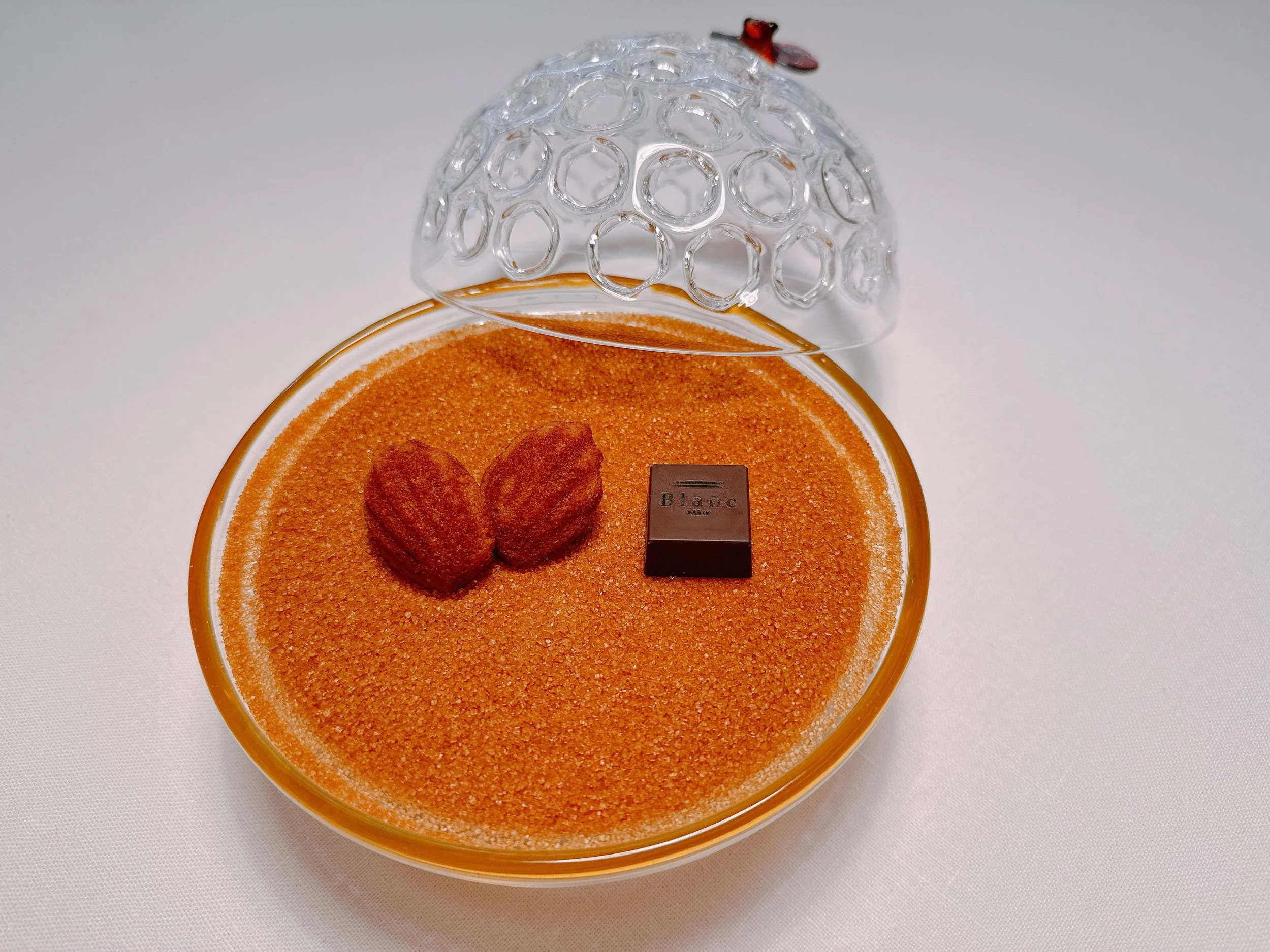 A final pair of sweet bites finished off the night. A madeleine with lychee honey was sweet with a light crunch 16. A Colombian chocolate praline was filled with a liquid rum-based filling. Nice enough, with a clear rum flavor 17.