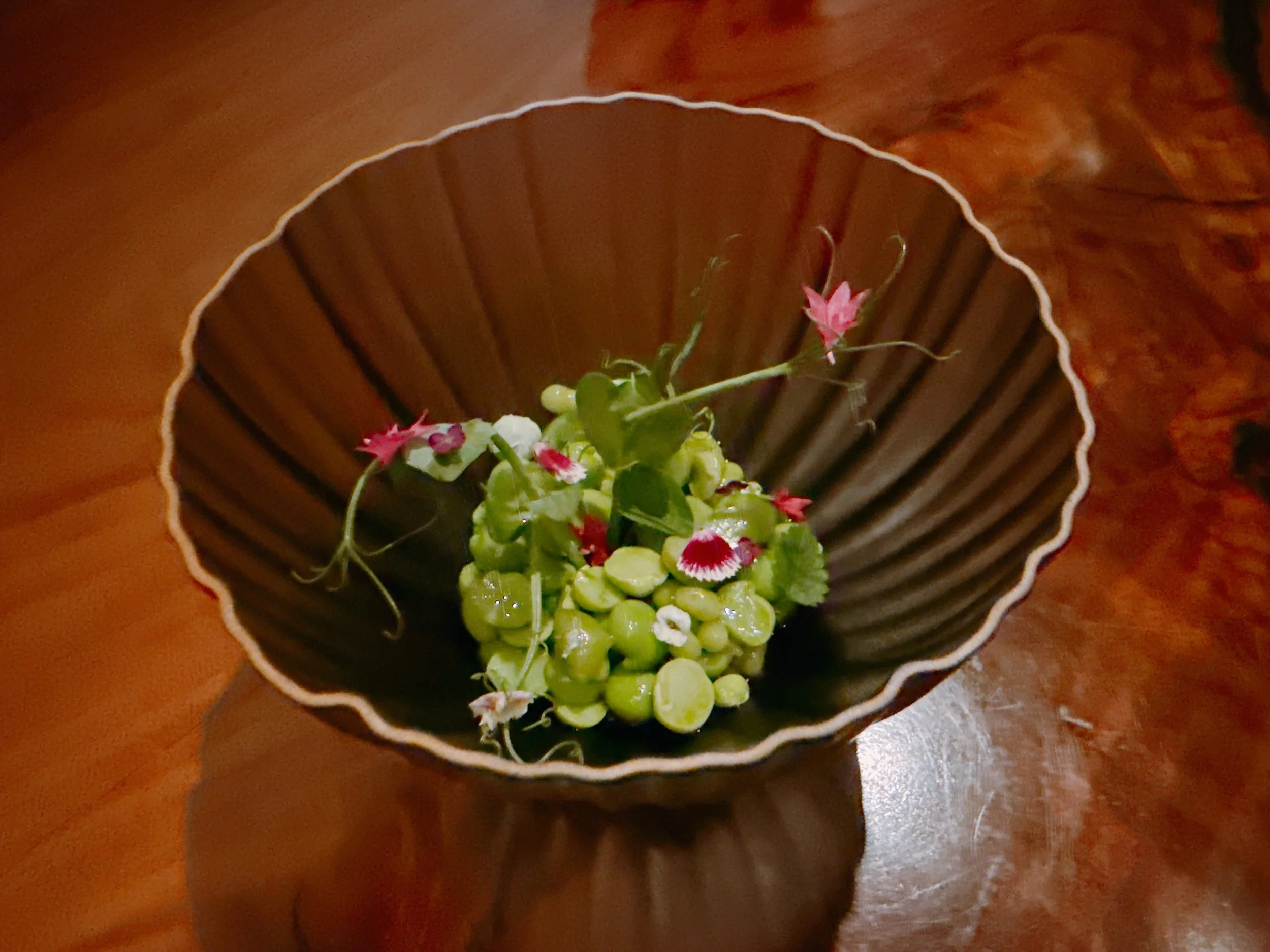 Along with the beginning of the wine pairing, we received a two-part dish that represented spring, and starred English peas. The first dish was composed of fresh peas, a bit of wasabi and pea shoots. The peas had a mealy crunch, and had only been lightly cooked, and there was a pea jelly underneath them 18. The second dish was served warm and contained buckwheat, a pea puree made with smoked butter, and some uni (sea urchin) on top. Tableside, a vinaigrette containing oyster liquor, mussel jus and tarragon oil was added. This dish naturally had a much stronger sea flavor than the preceding one, with the uni providing creaminess rather than taste 17. My wife liked the second dish much better than the first one though, so ymmv.