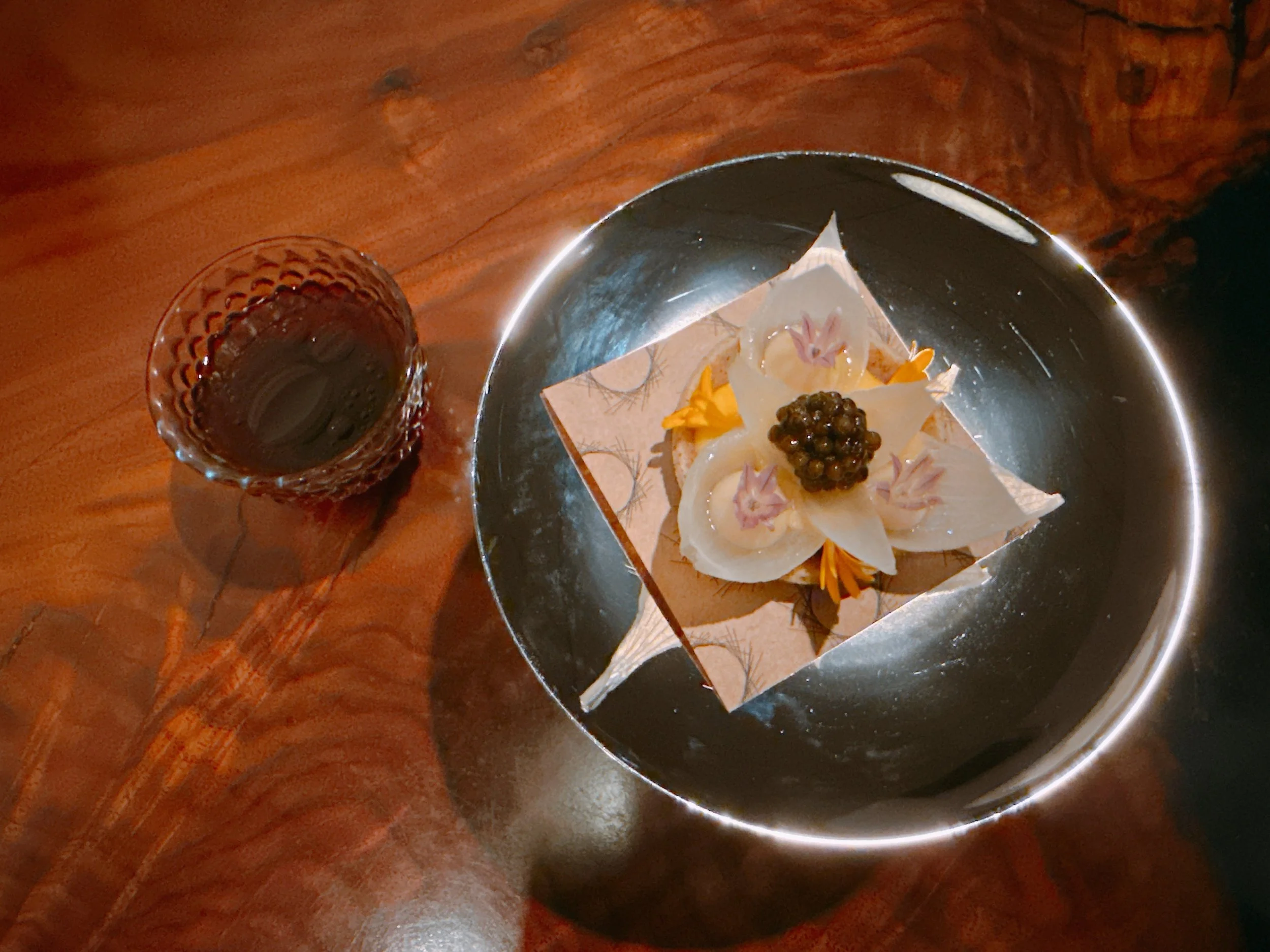 Always on the menu at Atelier Crenn is a play on an onion soup. This time, we received an onion tartlet containing buckwheat, caramelized onions, an aged cheese sauce, an onion petal confit and a dollop of caviar. In a separate cup was a broth made from the rest of the onions, seasoned with kombu, Parmigiano Reggiano fat and scallion oil. Especially the tartlet was bursting with flavors of caramelized onions - it was close to perfect for a dish capturing the essence of onions. The soup tasted less strong - surprising, since it's often the other way around. Still, for the tartlet alone, a 20.