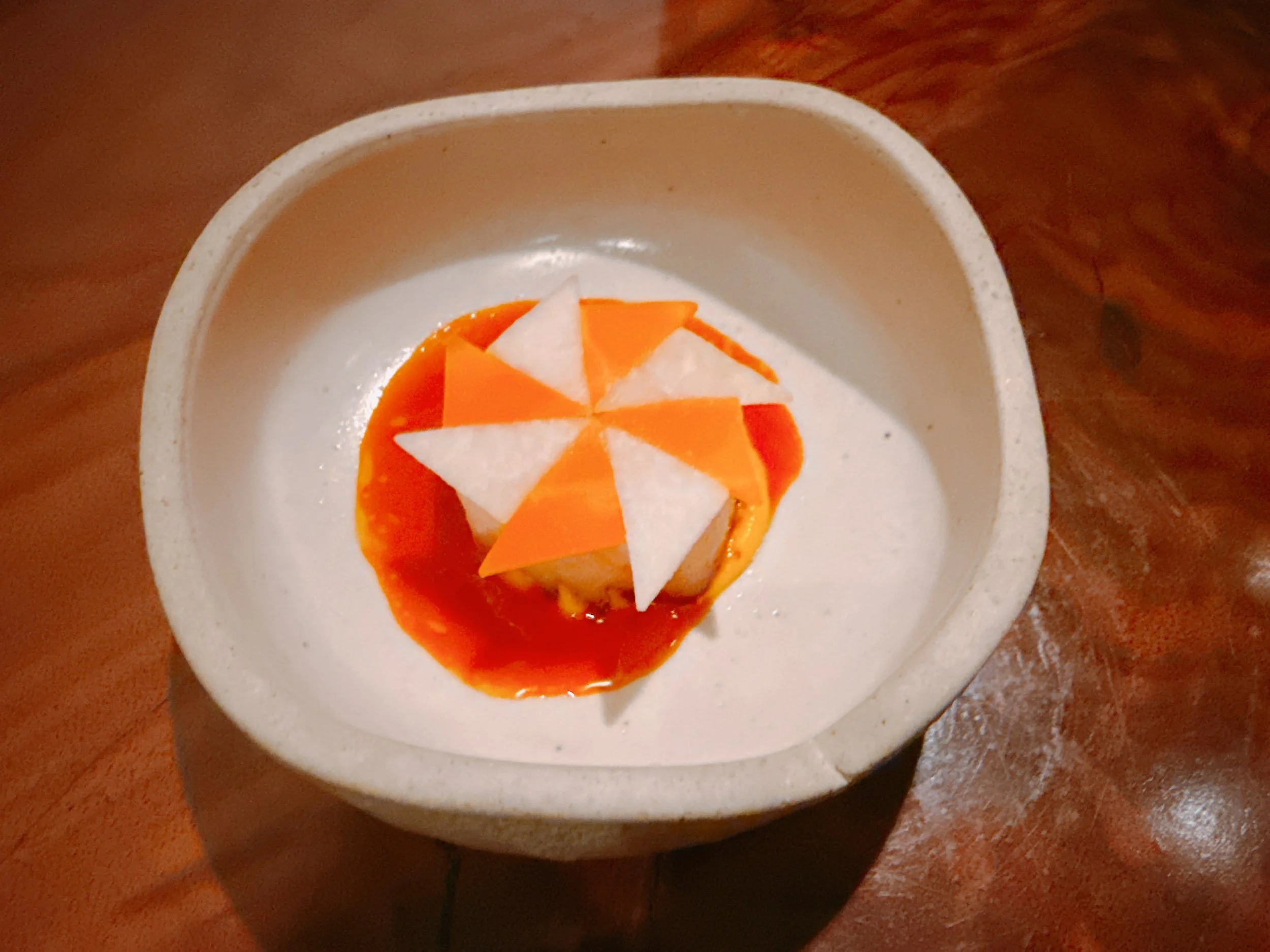 A scallop that had been seared on only one side was served with different preparations of carrots: steamed, as a purée, and as decorative triangles on top of the scallop, interleaved with radishes. A carrot jus with mandarins and black olive oil completed the dish. The scallop was nicely cooked, and the sauce was very flavorful - I felt that this is what “carrot ketchup” might taste like: slightly sweet, and tasting less of carrot, and instead of citrus and a mix of flavors. The radishes on top added some crunch to the dish 18.