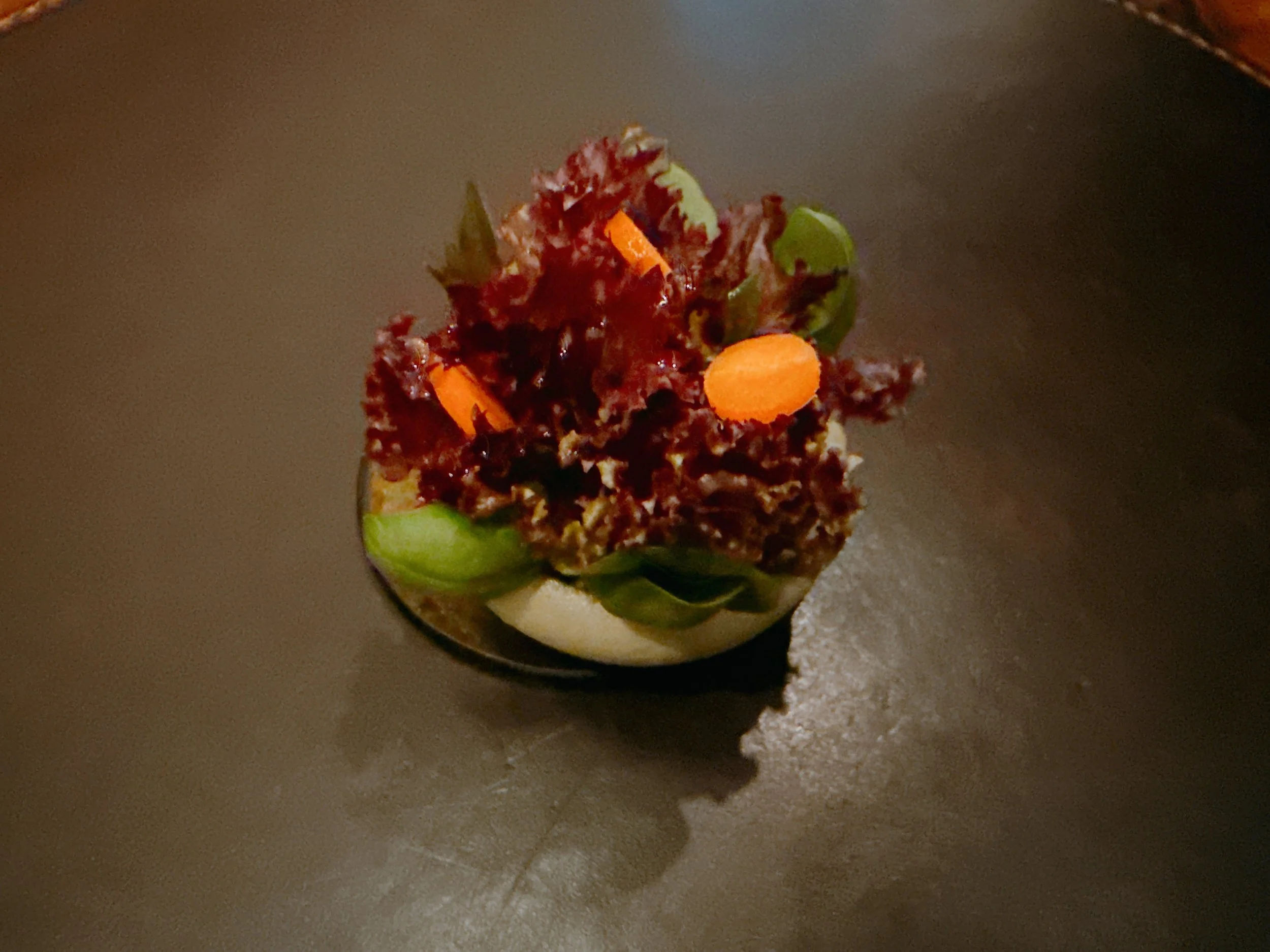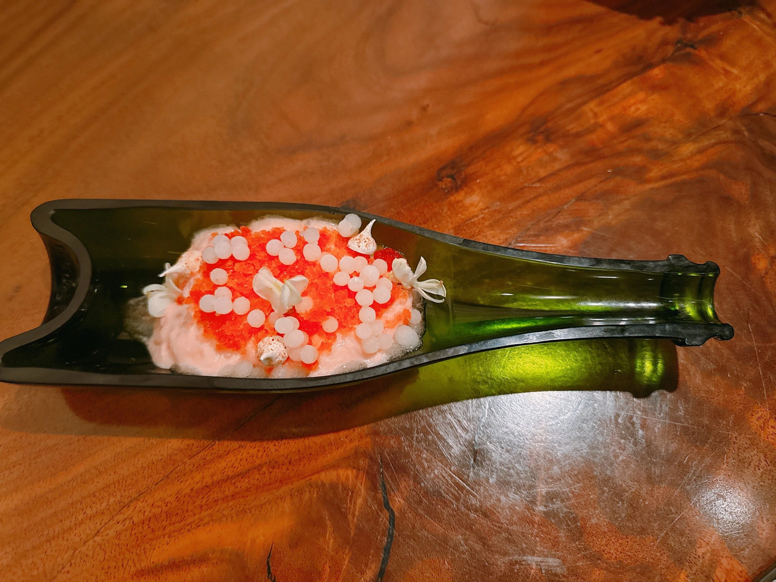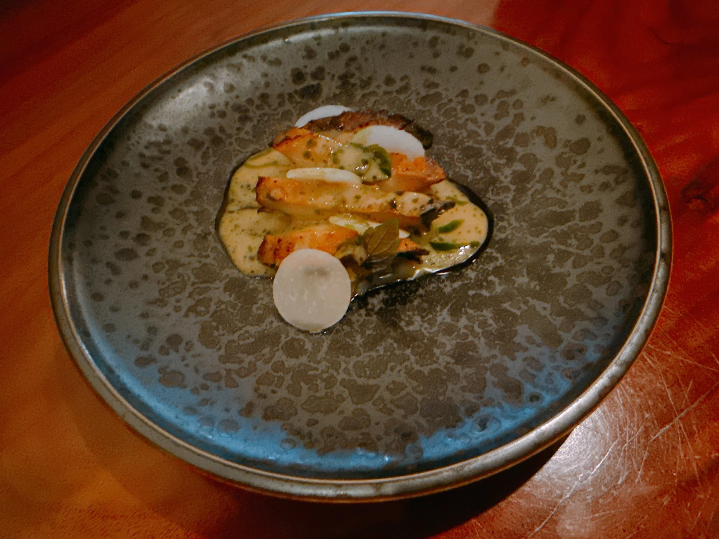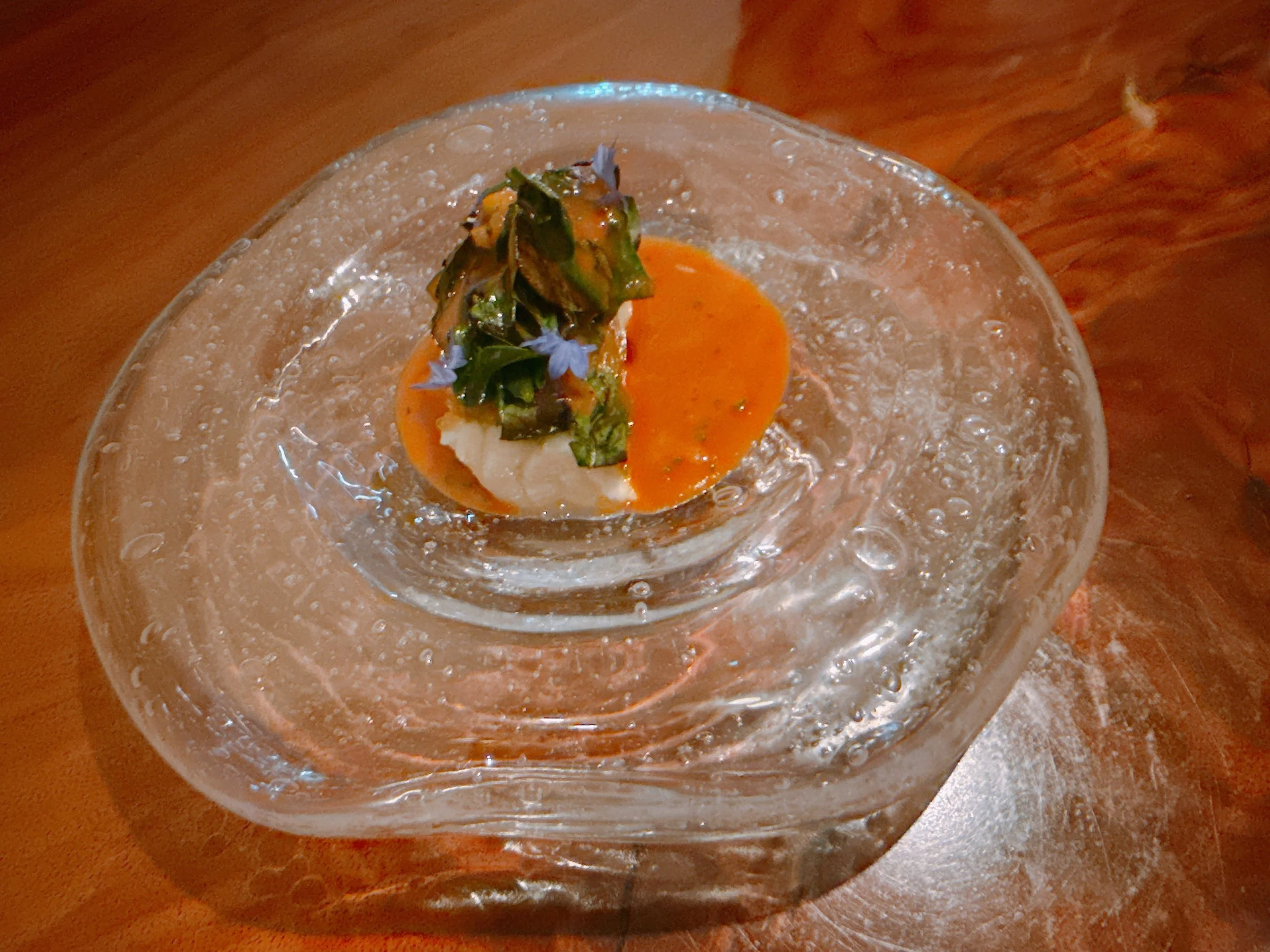 Our first few bites arrived before the beginning of the wine pairing. A “Kir Breton” was a coconut butter shell filled with apple juice and topped with a black currant gel. It tasted of fresh fruit and black currants. The danger in these kind of preparations is that the shell is either too fatty or too thick, and ends up dominating the taste impression in an unfavorable way. That was not the case here at all: the shell had a near perfect consistency - thin and sweet 18. A hedgehog mushroom puree was topped with a socca chip made from acorn flour, and Douglas fir spruce tips. This dish had a nutty, forestry taste with a light mushroom flavor. A surprisingly light and fresh bite, despite the mushrooms and forest associations 18. A feuille de brick tartlet filled with a miyagi oyster and a kalamansi/fish sauce had a nice crunch and strong flavors, although it tasted more of seafood in general than of oysters in particular 18.