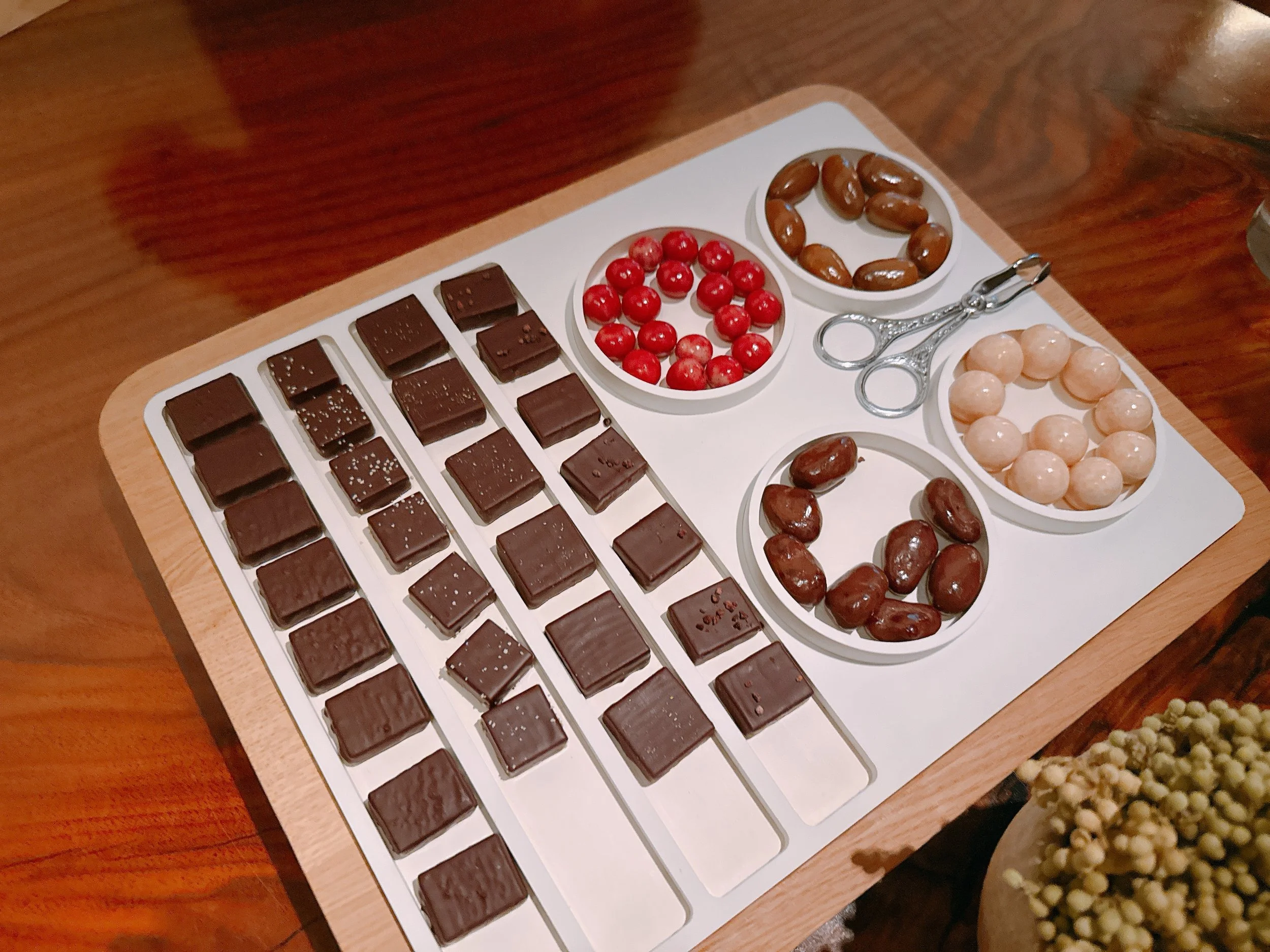 We ended our dinner with a selection of eight petit fours - one could choose as many or as few as one desired. First, four dragées. Peaches and cream had a crunchy core and a slight peach flavor 16. Raspberry yogurt with a pretzel filling was ok, but the pretzel inside tasted a bit odd 15. Milk chocolate with passion fruit and pecans was nutty with a hint of acidity 17. And fourth, a candied black walnut had a light crunch 15. Then there were four chocolate pralines. One was simply 72% dark chocolate - fine 15. Another was filled with hazelnuts, which gave it a bit of a nutty taste, but predominantly, this was still chocolate 17. A honey chamomile praline was oddly sweet and did taste a bit like chamomile tea 15. Finally, an oolong chocolate praline was a bit lighter than the 72% pure chocolate 16.
