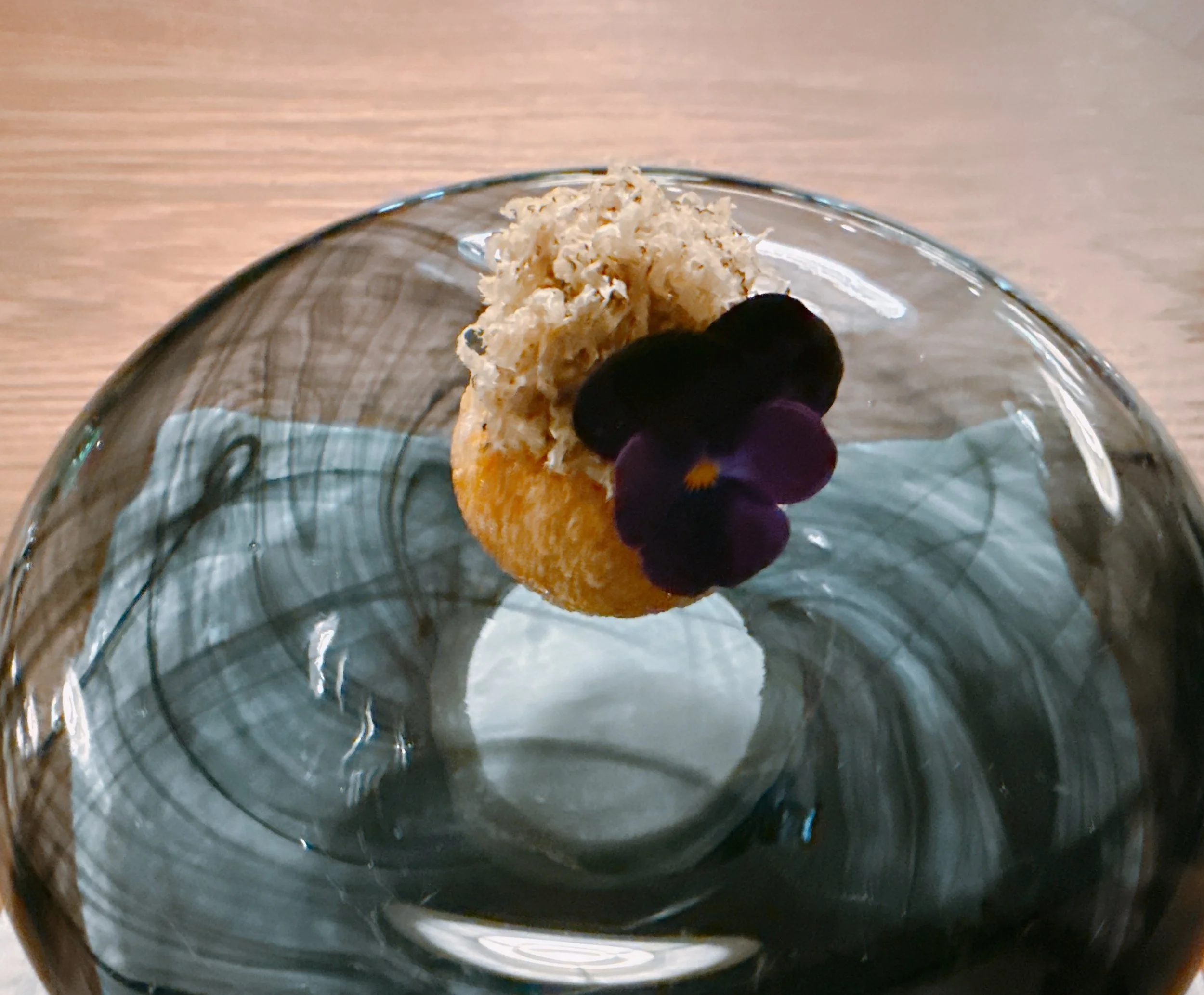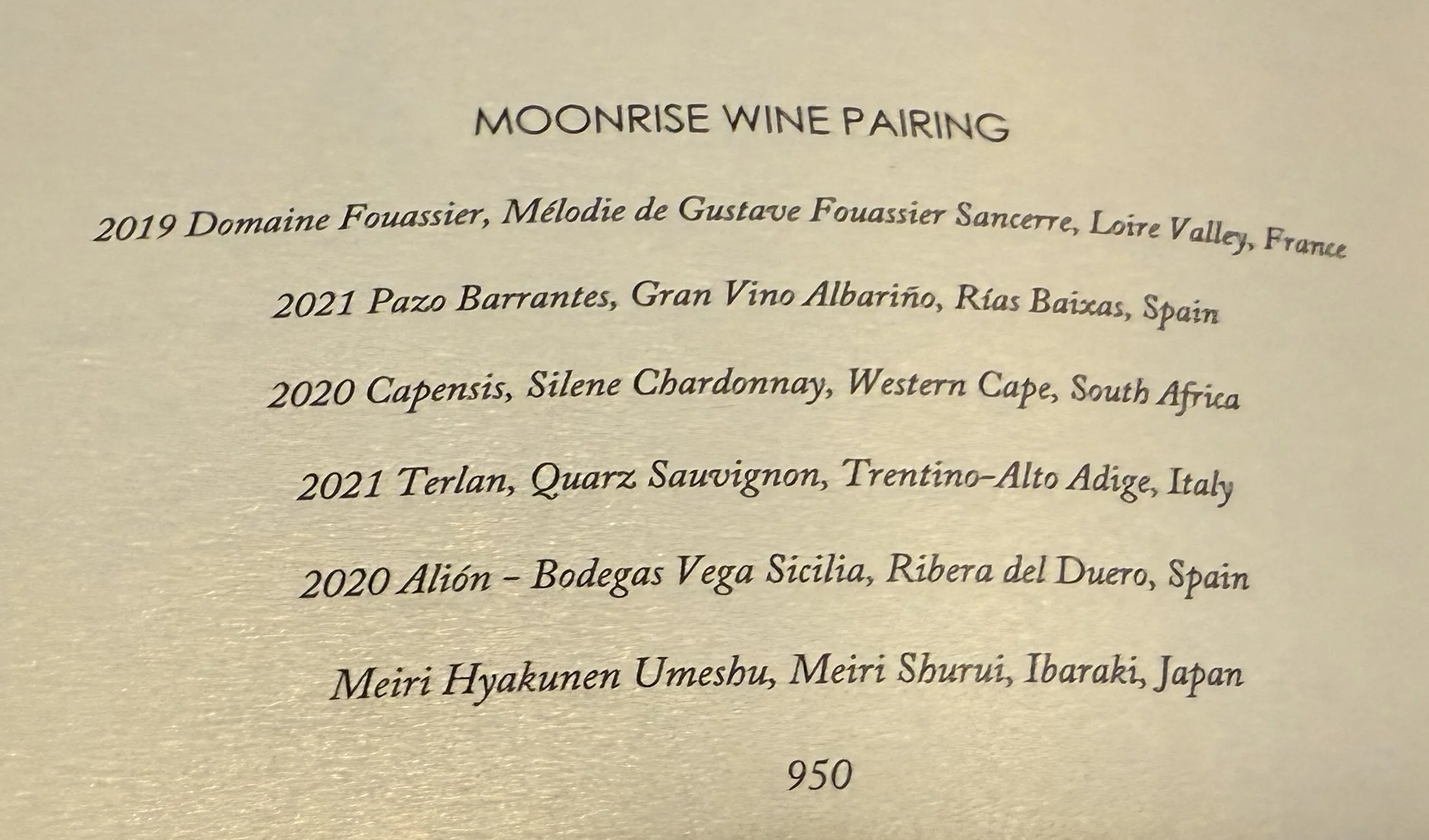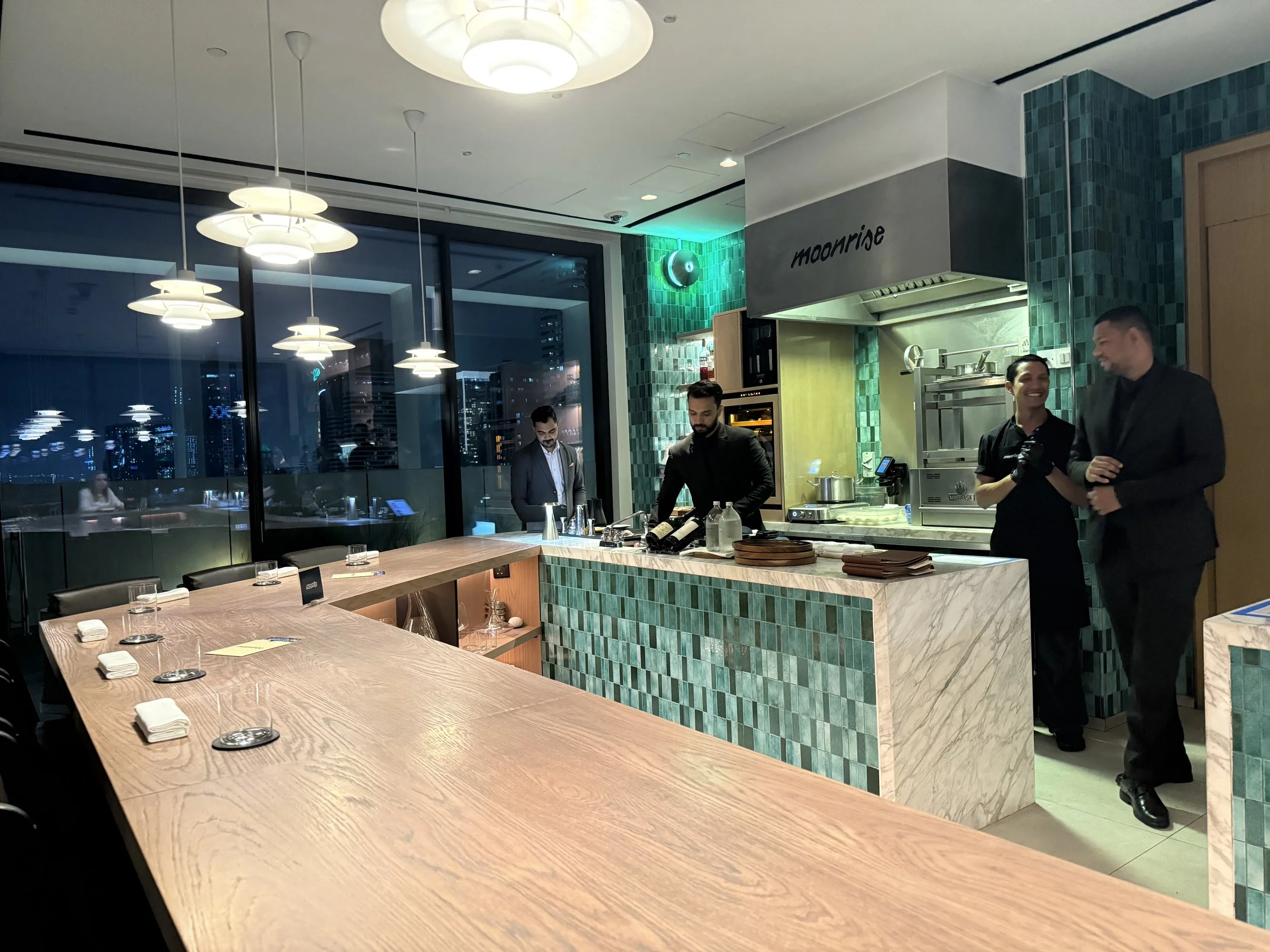 The name of the restaurant “Moonrise” might have been chosen with exactly that distinctive nighttime view in mind. And the dinner served here was a love letter its city, to Dubai. Some dishes celebrated local produce, others highlighted the fertile mix of culinary cultures, and a few reflected the chef's childhood, spent growing up in Dubai during the late 1990s and 2000s. Fittingly, all diners were seated at a U-shaped wooden counter that faced the open kitchen, and the chef took center-stage, explaining every course and the story behind it. This all came across as quite genuine and charming, with amusing and/or interesting vignettes instead of an over-produced story line.