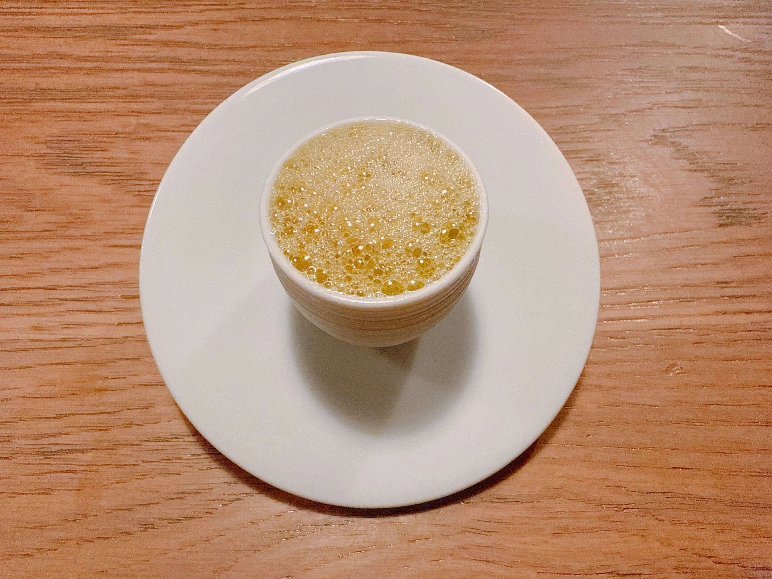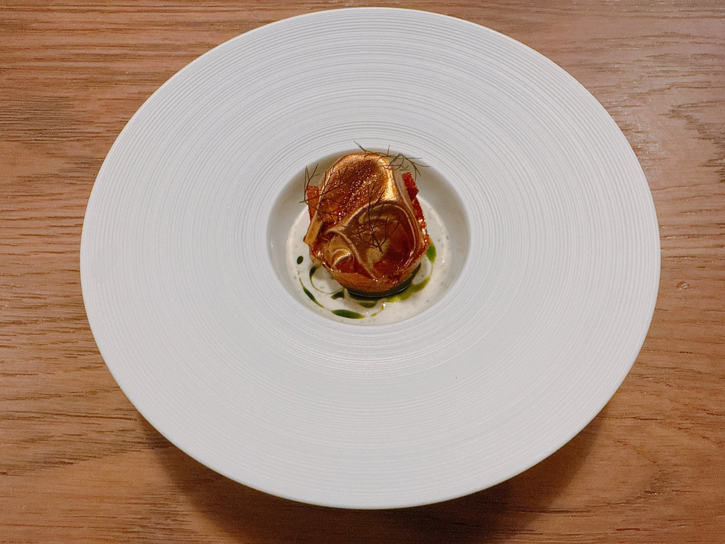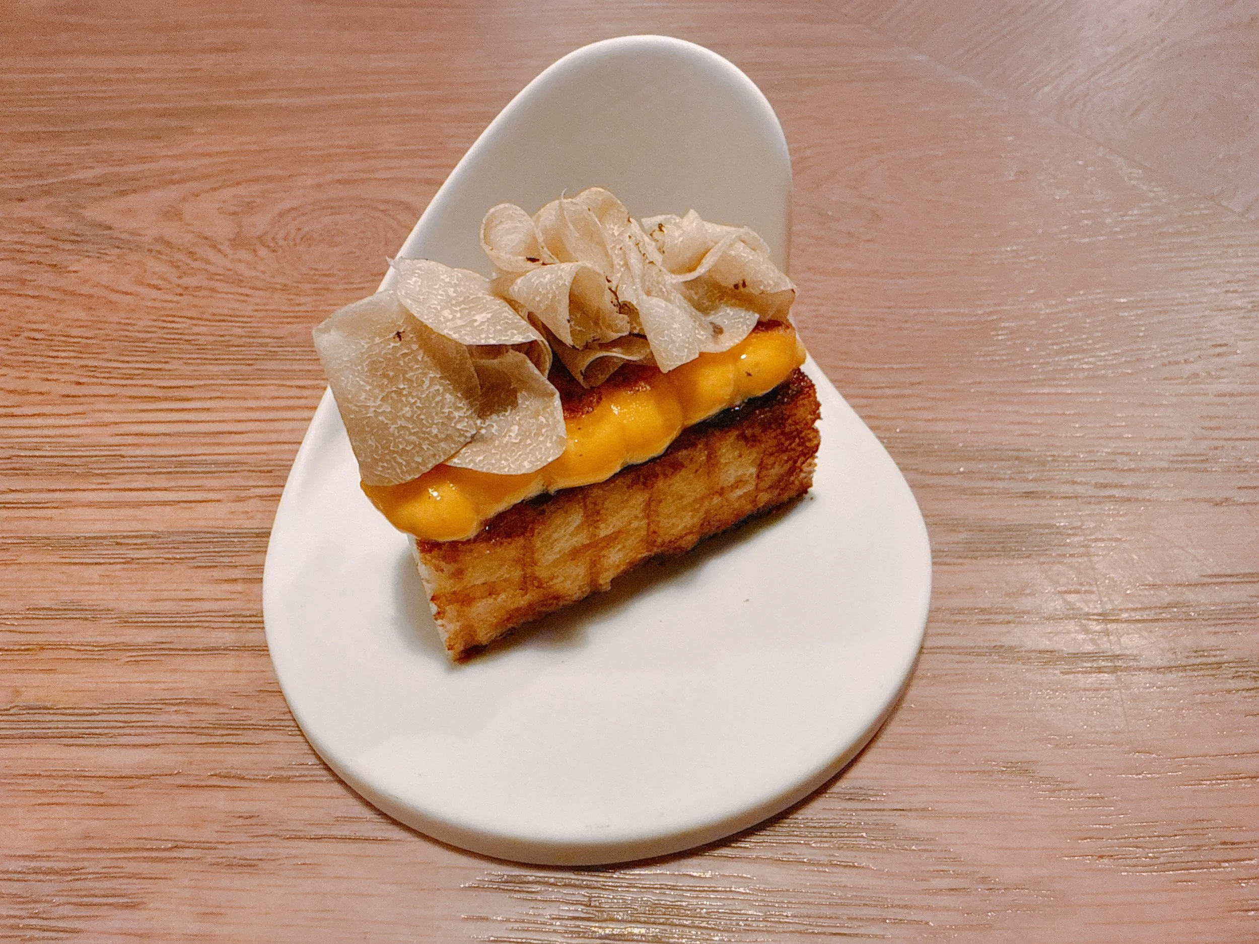 The last starter was a grilled cheese sandwich - the first dish that the chef had ever cooked. (Presumably not in this version, though.) Here, toasted Hokkaido milk bread was topped with Thai black garlic, a Parmesan cheese sauce cooked at a low temperature, and shaved summer truffles. On the one hand, this was all decent: the bread was nicely toasted, the sauce cheesy, only the truffles were a bit light in flavor. However, this dish felt a bit generic. And ironically, right after mentioning that a dish was too acidic, this one actually could have used more acidity to cut through the heavy cheese. Maybe some pickles? 15