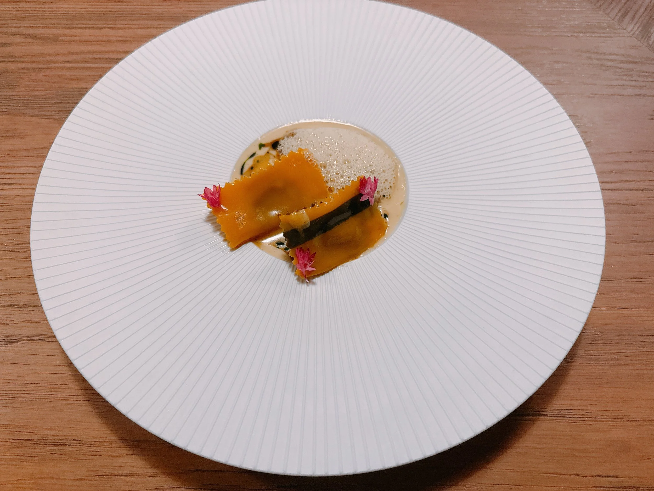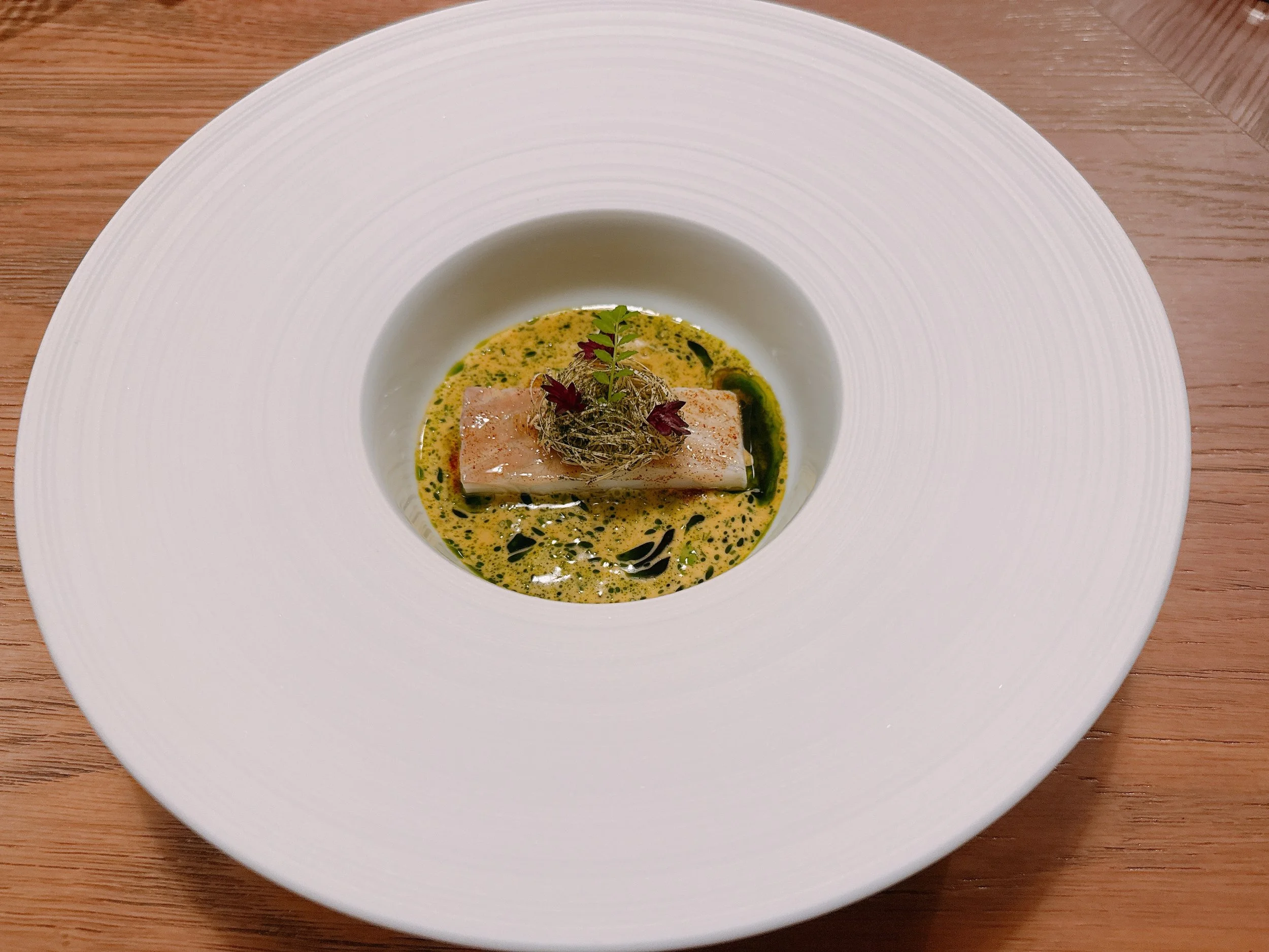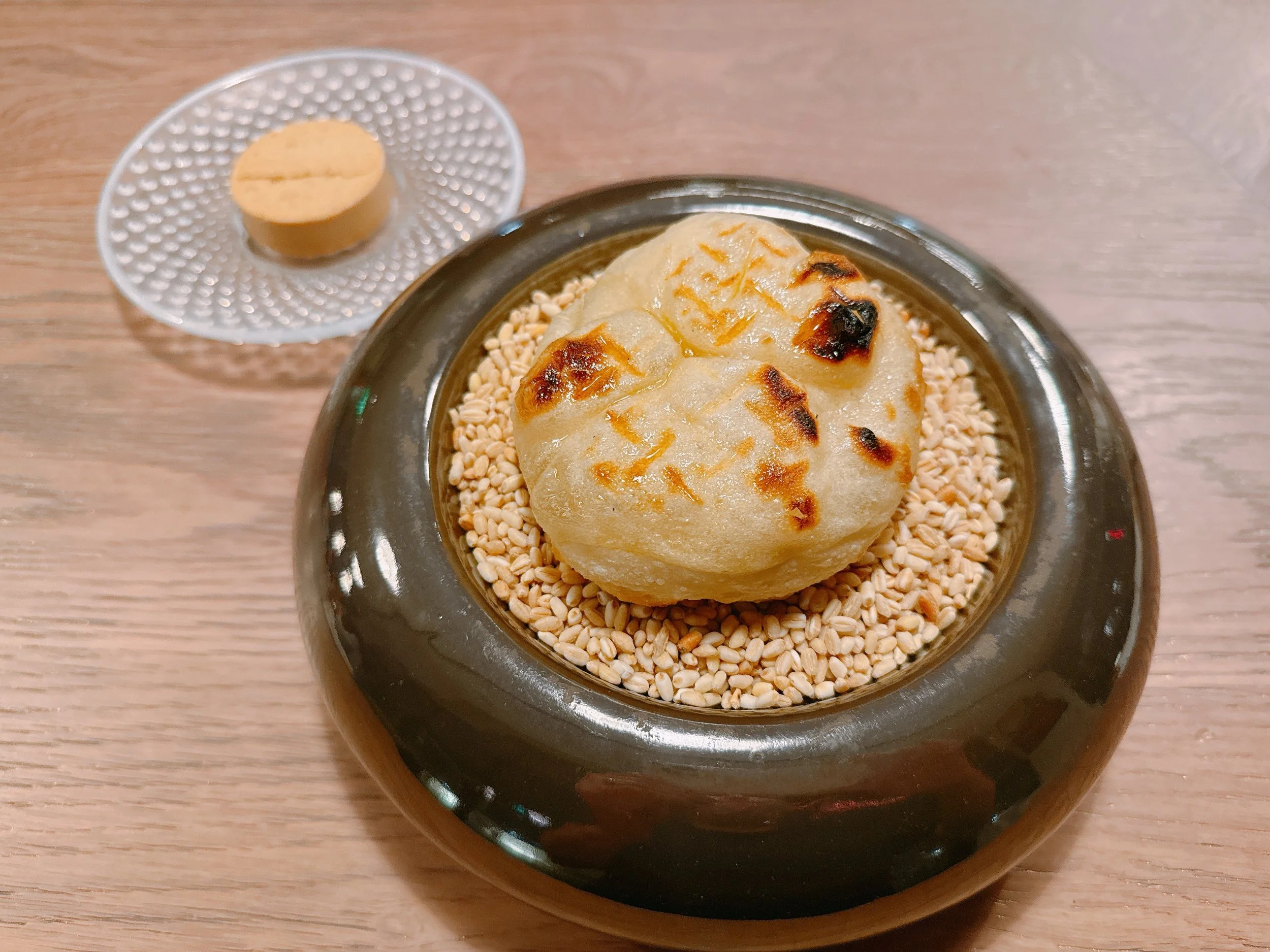 The last starter was a grilled cheese sandwich - the first dish that the chef had ever cooked. (Presumably not in this version, though.) Here, toasted Hokkaido milk bread was topped with Thai black garlic, a Parmesan cheese sauce cooked at a low temperature, and shaved summer truffles. On the one hand, this was all decent: the bread was nicely toasted, the sauce cheesy, only the truffles were a bit light in flavor. However, this dish felt a bit generic. And ironically, right after mentioning that a dish was too acidic, this one actually could have used more acidity to cut through the heavy cheese. Maybe some pickles? 15