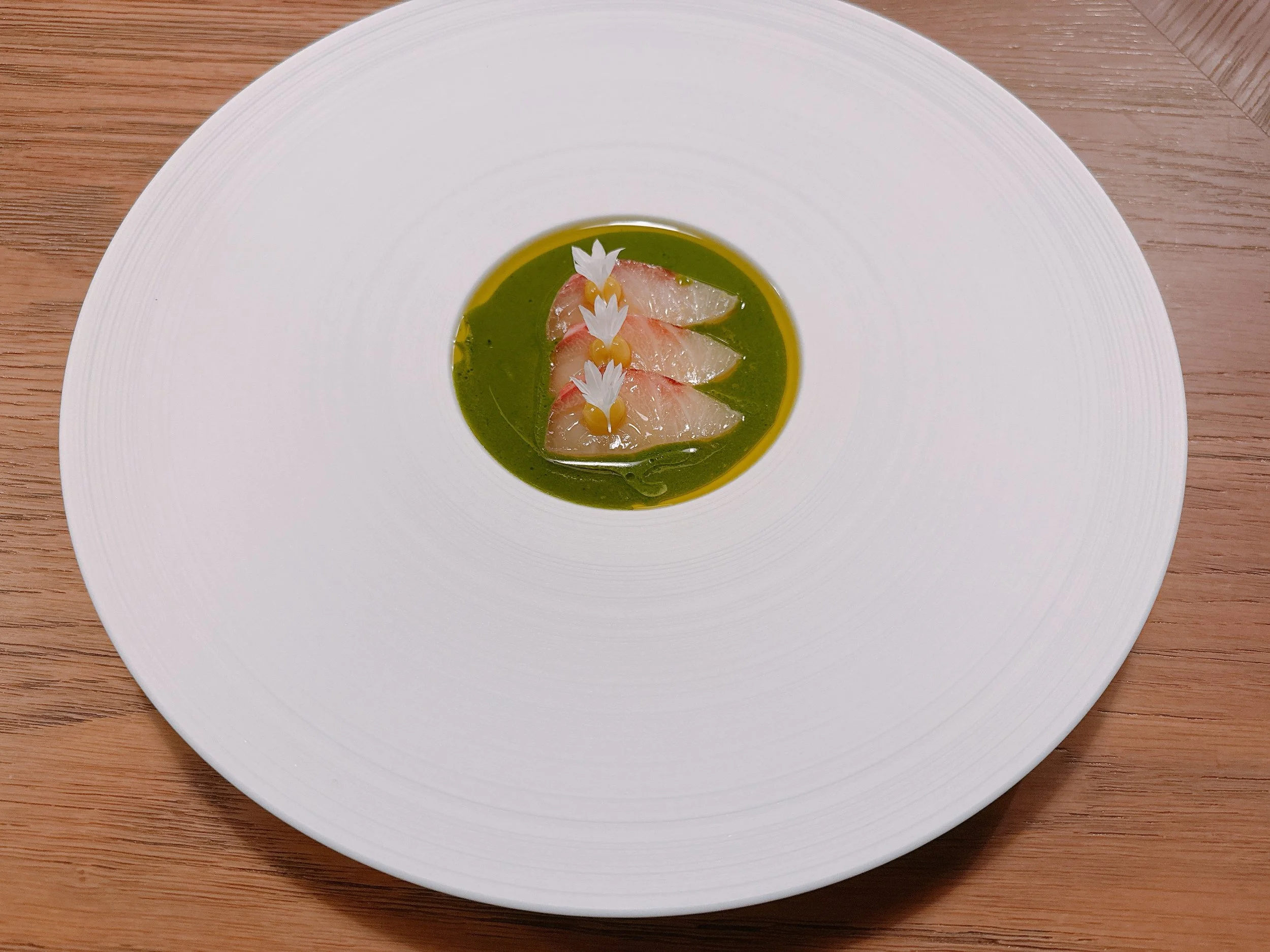 According to the chef, the best thing about Fattoush salad is the sauce at the bottom of the bowl, so the following dish only featured that sauce and skipped the salad entirely. More precisely, the acidic sauce was used to make a fish ceviche. The fish in question was a shima aji that had been aged for several days and was topped with a lemon koshu and lemon zest. The fish itself was lovely with a slightly creamy consistency, and its sweet topping was probably meant to balance the very acidic sauce. Overall good, but a bit too acidic for my taste 16.