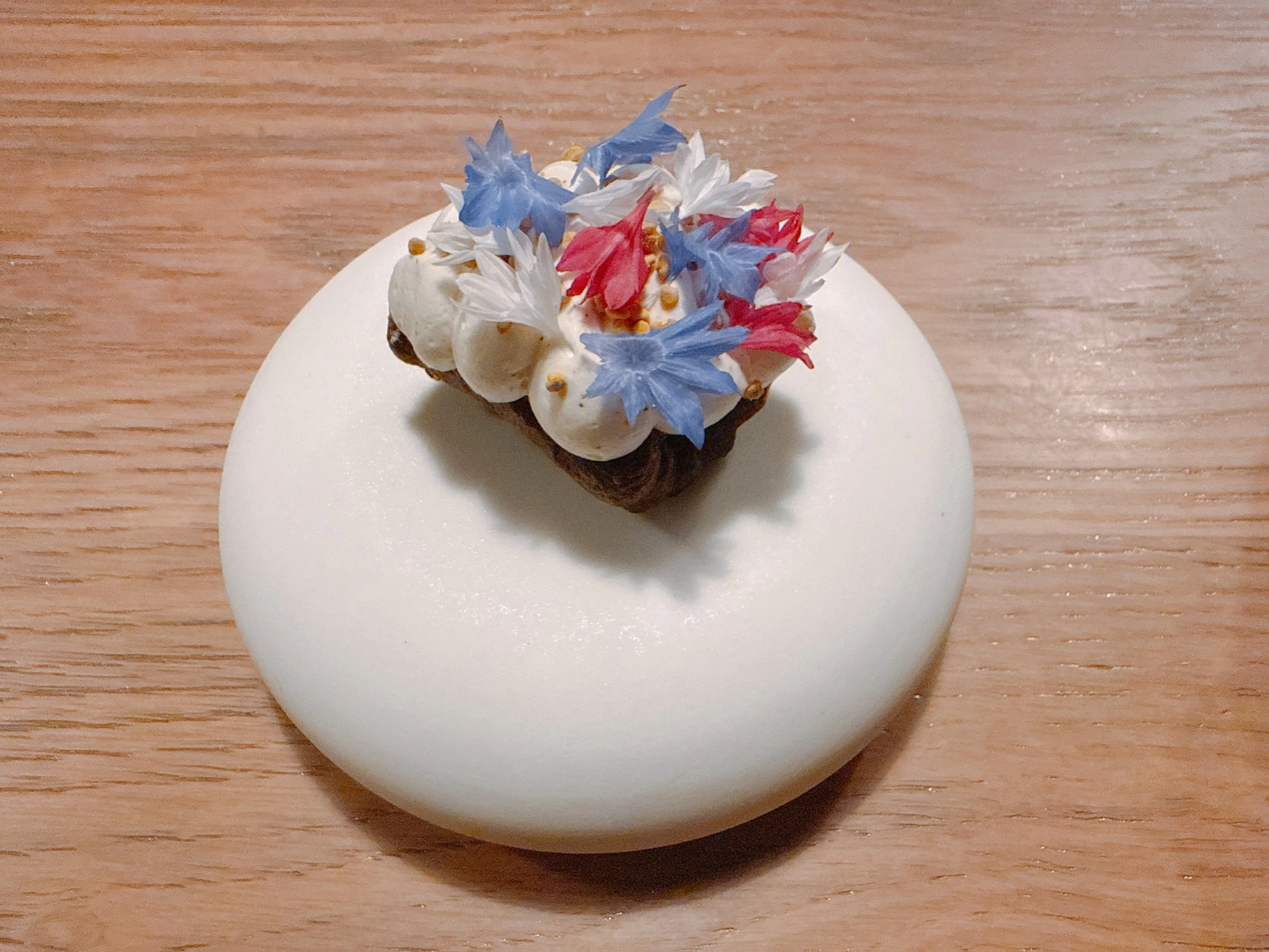 The final bite of the night was half a canelé seasoned with dates, brown sugar and genmaicha tea, and topped with some cream. The lights were dimmed when this dish was served, meant to evoke the feeling of sitting around a campfire with bites that looked a tiny bit like s’mores. The canelé's seasoning made it taste more like gingerbread, and I couldn't make out its texture since the cream on top was so overpowering 15.