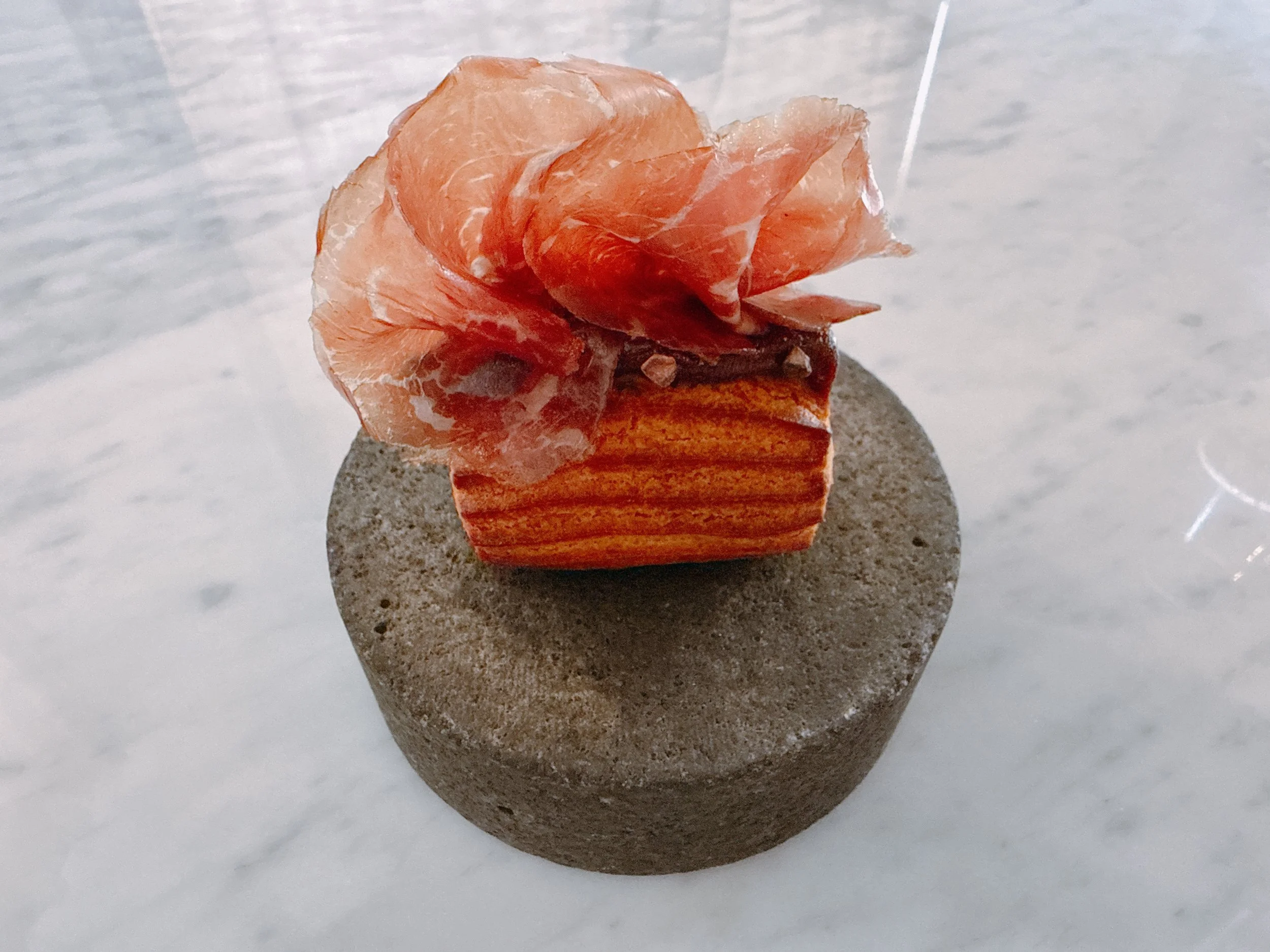 An “umami eclair” was filled with porcini mushrooms, Marmite and cocoa nibs and was topped with beef coppa. The most flavorful part of this dish was the thinly sliced beef - very good. The (savory) eclair had some crunch from the cocoa nibs, but for better or worse, its filling didn't really taste much of either mushrooms or Marmite 15.