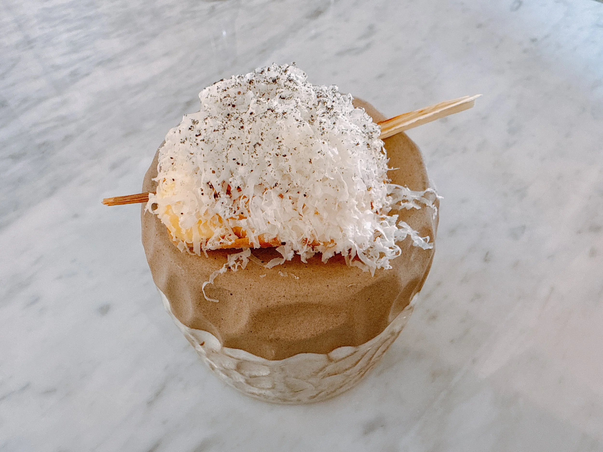 The following beef kebab also used wagyu. Three meatballs on a stick were topped with a cherry emulsion, pine nuts, and spices such as cinnamon. The meatballs were crunchy on the outside, the cherries added some sweetness, and the spices were perfectly measured: they made the dish more interesting without being distracting, as cinnamon might easily be in a savory dish 15.