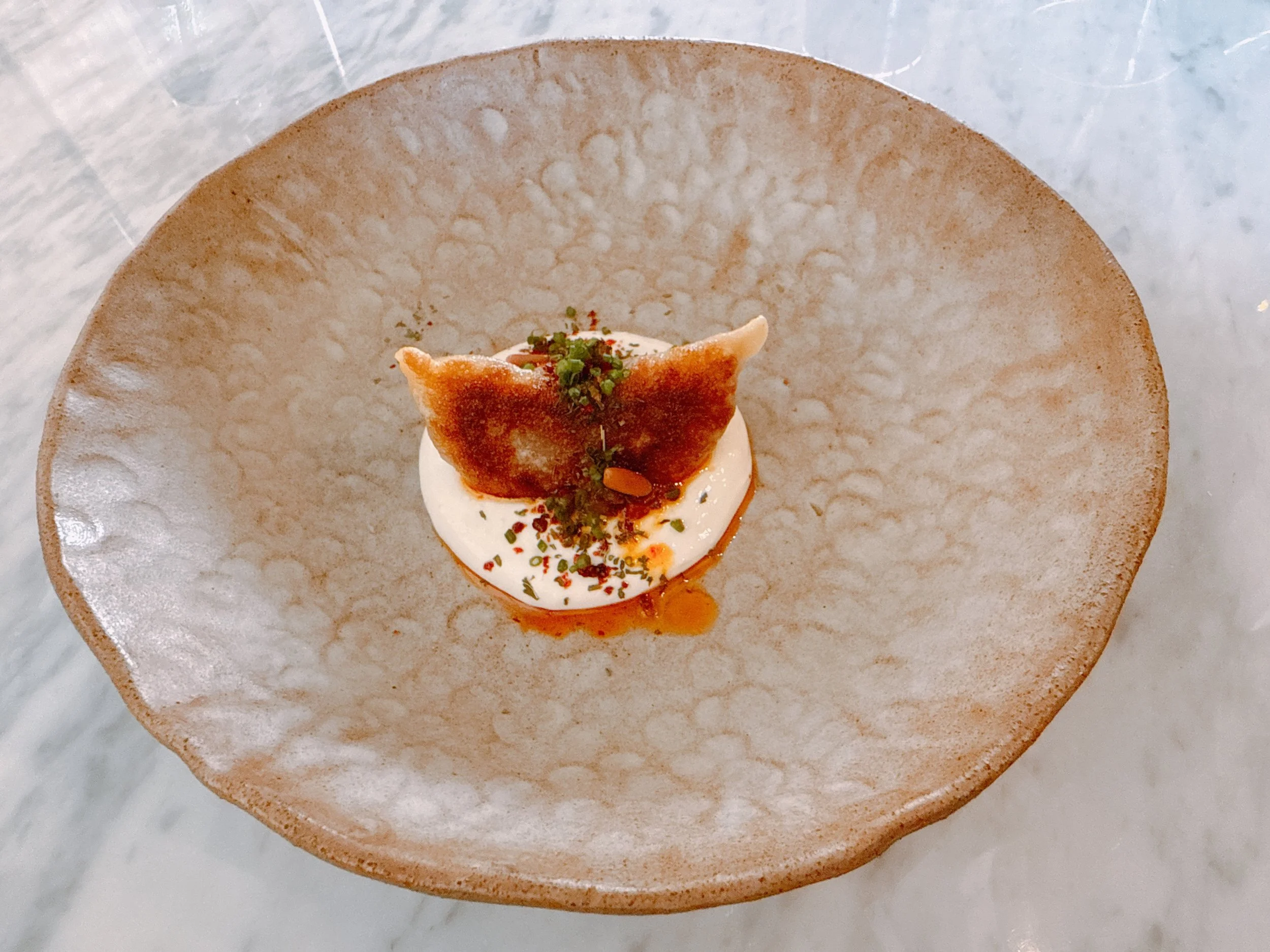 A wagyu beef dumpling came in the form of a gyoza surrounded by a garlic yogurt sauce, pine nuts and a spicy oil. The dumpling was fine, its shell maybe a bit to thick, and the beef was lightly seasoned. Good, but nothing too special. Arguably, the smooth yogurt sauce with its hint of garlic was better than the dumpling 15.