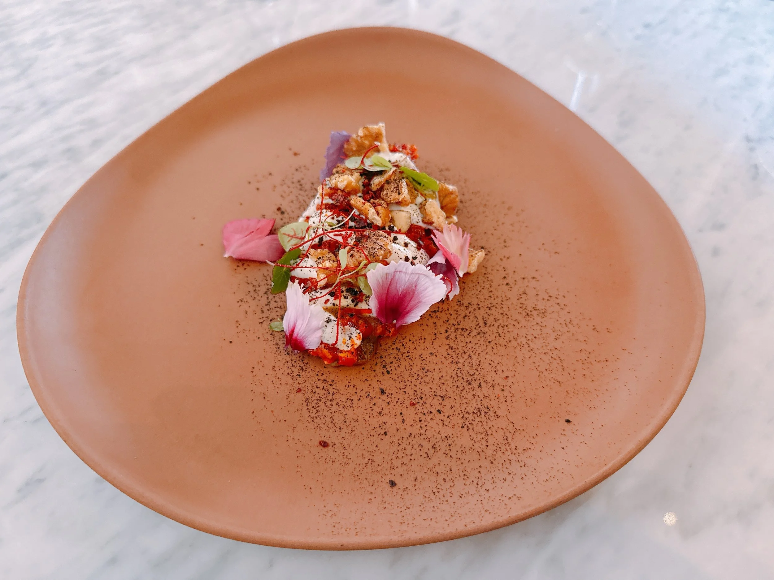 The next dish was the most Mediterranean so far: roasted eggplant, tahini, walnuts, edible flowers and a powder made from burnt eggplant skins. There was lots going on here: a bit of spice, some creaminess, the eggplant taste, texture from the walnuts, and so on. The combination was not too heavy, and interestingly, the many flavors didn't really combine into one. Usually that might be considered a bad thing, but here it was actually an asset: each bite was slightly different, putting yet another ingredient to the forefront 15.