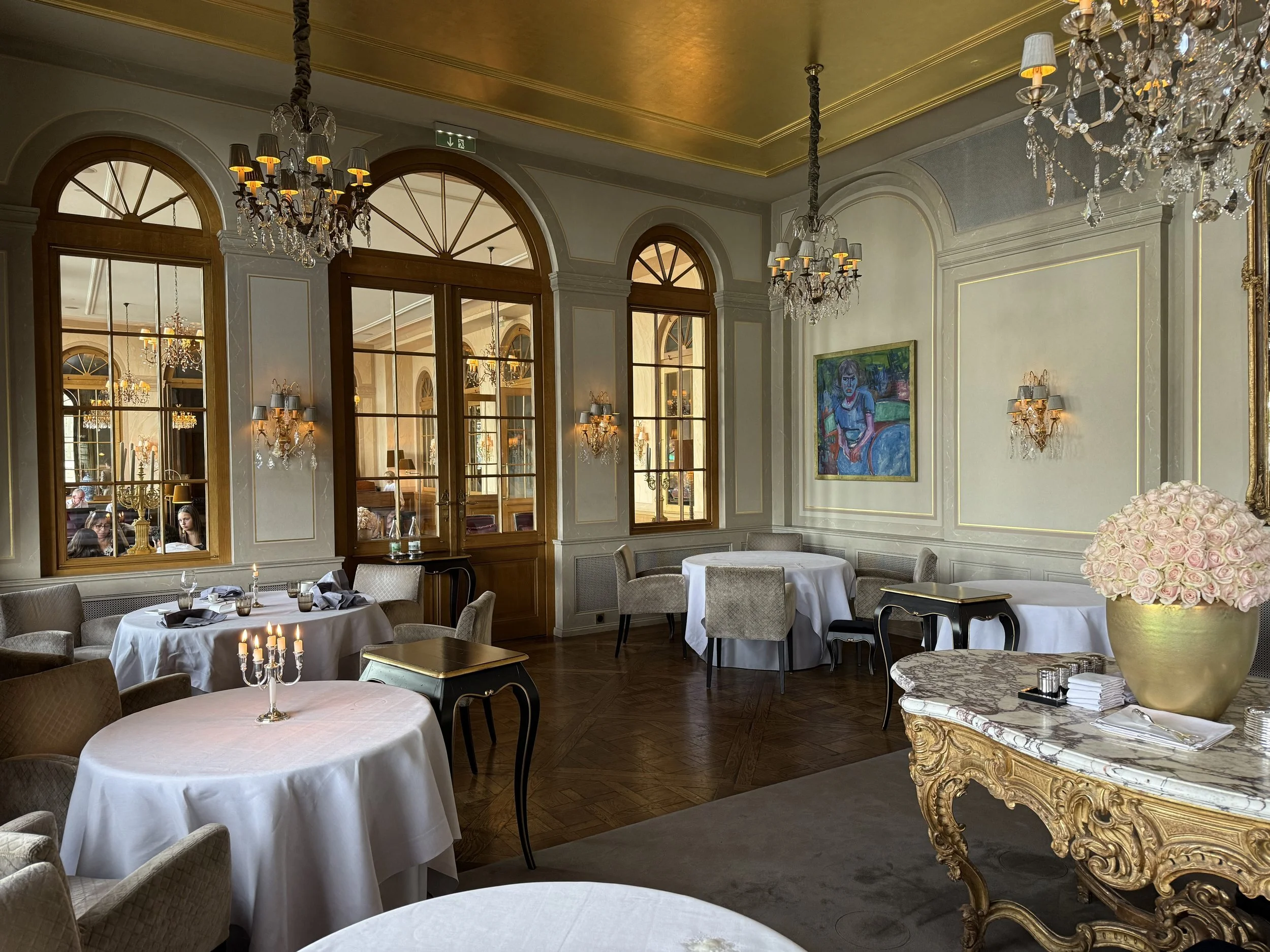 Three-Michelin-starred “Cheval Blanc” in Basel's “Les Trois Rois” hotel has served us some of the best meals of our lives - one of the few restaurants in the world that I've ever considered rating a 20 out of 20. Our previous two visits both occurred at the beginning of December, so we were curious to see what a meal would be like in the middle of summer. When we settled in for our weekday lunch, it was nice to watch the Rhine river flowing past outside, with a few courageous swimmers braving the strong currents. Quite a contrast to the nighttime view of Basel's Christmas decorations that we had enjoyed during our previous dinners.