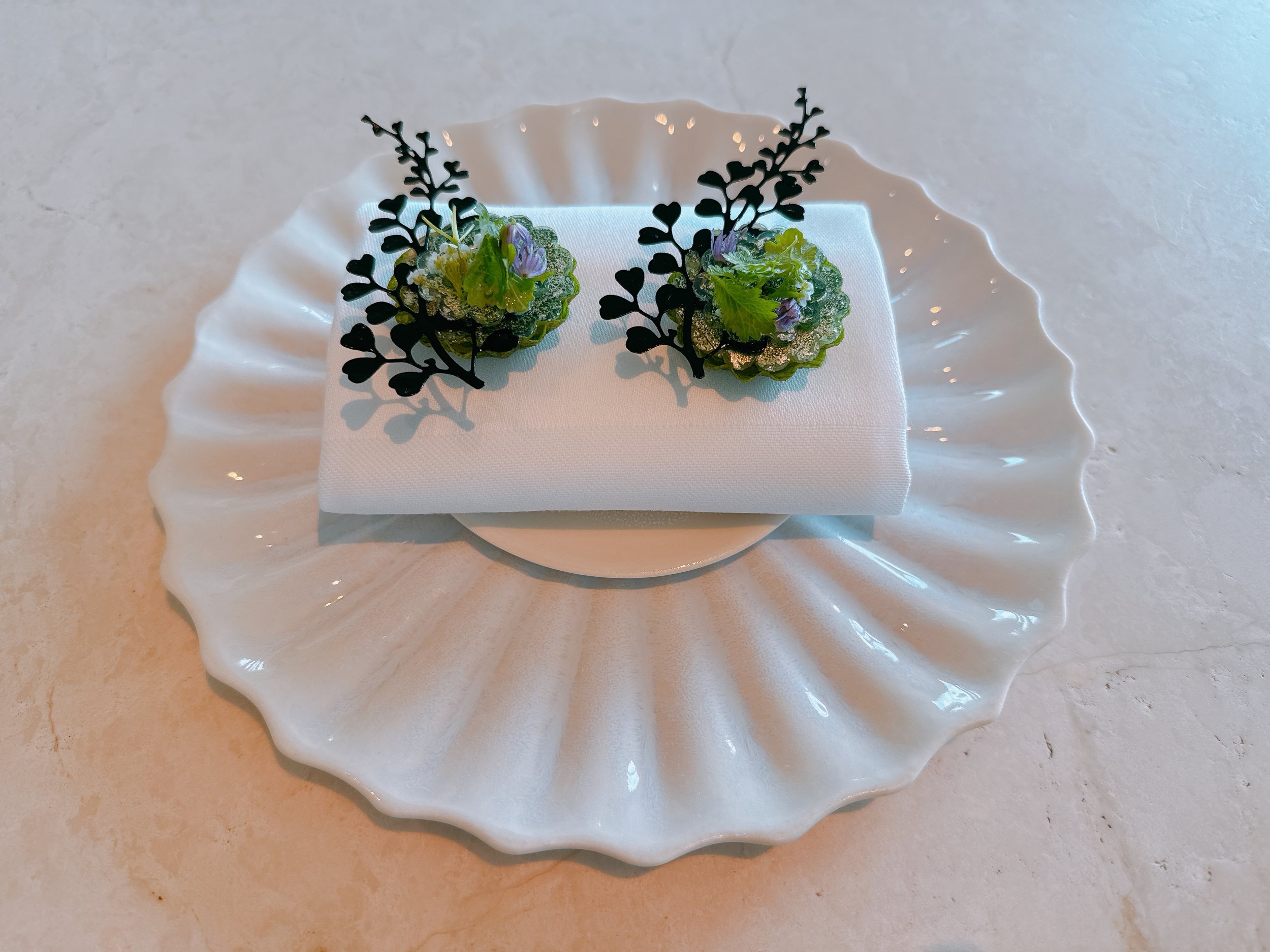 Our lunch started with a few small bites before the wine pairing commenced, so ordering an aperitif was not a terrible idea. First, a cracker filled with an oyster, cucumbers, pickled elderflowers, dill, aquavit and decorated with a sunchoke crisp that had been blackened with charcoal. The cracker was extremely light, the predominant taste and texture came from the crunchy cucumber, enhanced by dill. The oyster, on the other hand, was barely noticeable. A lovely, fresh, summery bite 18.