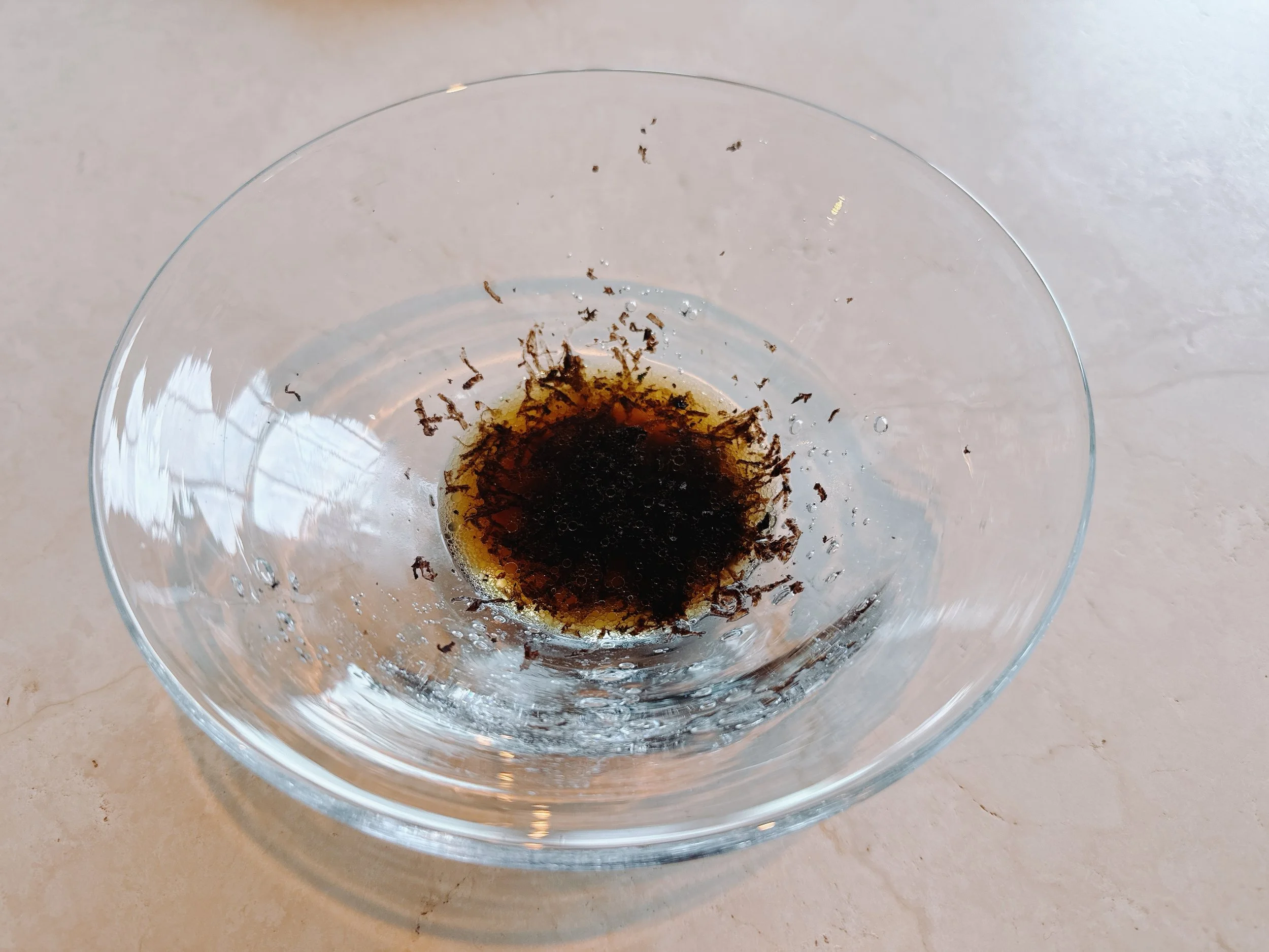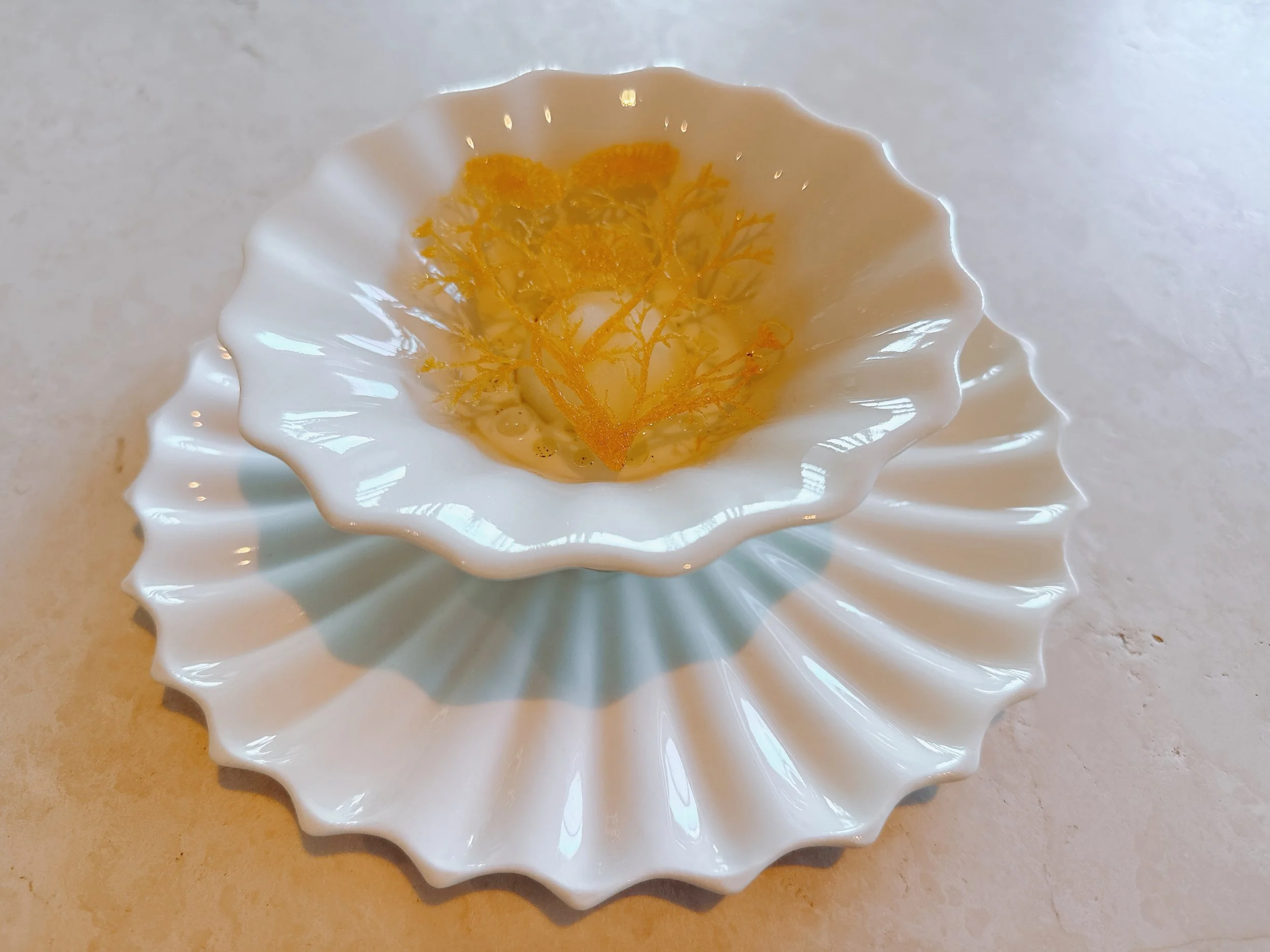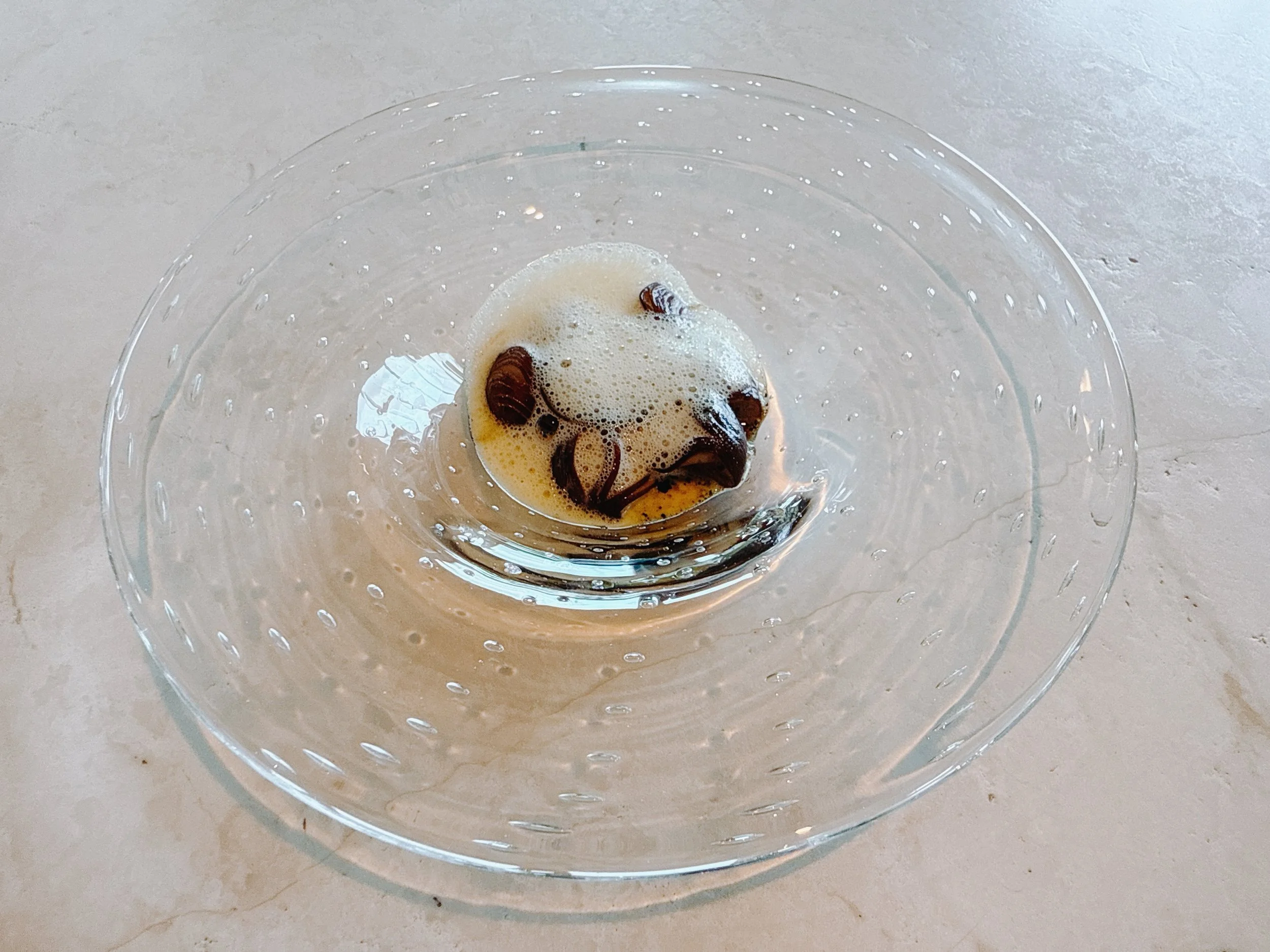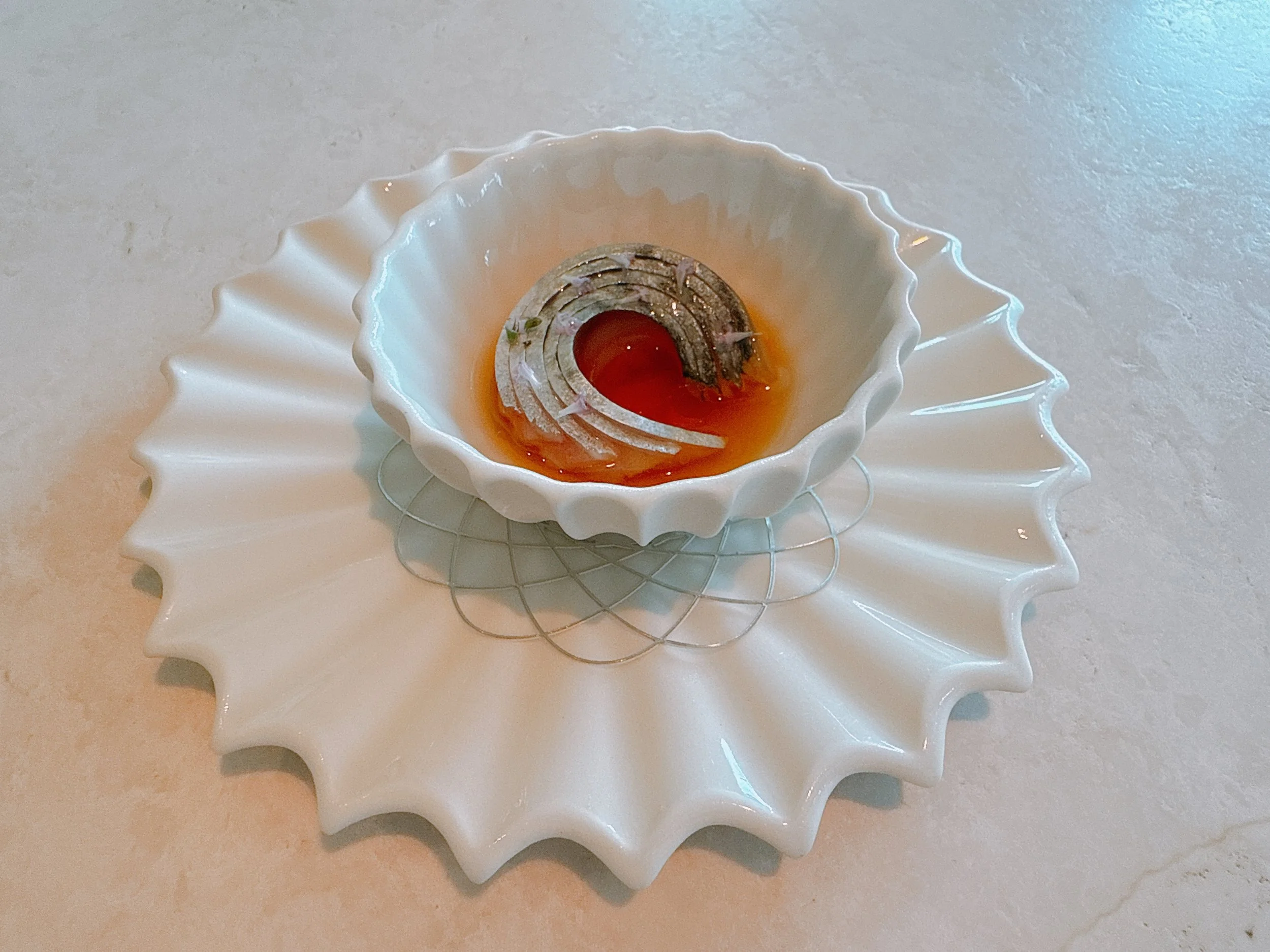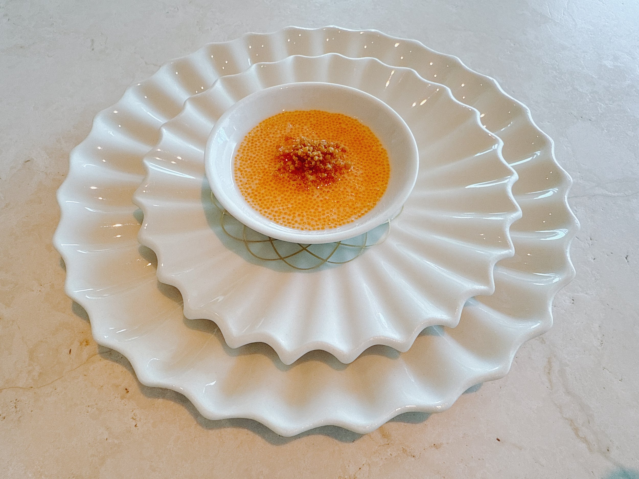 Next, we received a little flat bowl, filled with (from the bottom) a kale/apple/parsnip juice, a “silky milk”, smoked bleak roe (“bleak” here is not an adjective, but the name of a fish) and crispy dashi. The latter added a noticeable flavor kick to a dish that otherwise would have been on the lighter side. There was some nice interplay of textures: the very fine roe, the crispy dashi crumbles, the creamy milk and the fresh juice 18.
