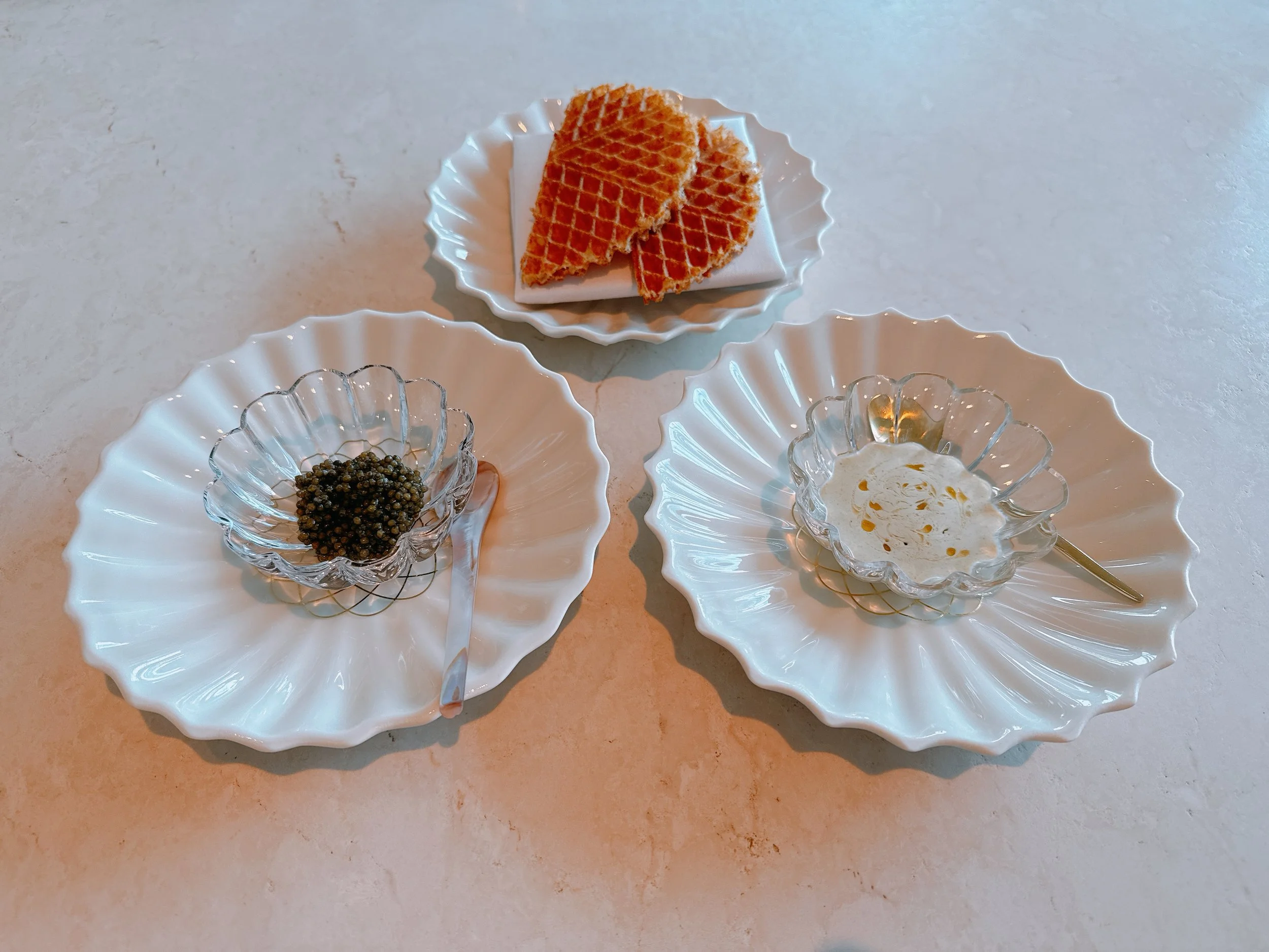 We ordered one serving of the optional caviar course to share, and it was served at this point, amidst the appetizers. It arrived on three plates: one had Imperial golden ossetra caviar, another sour cream seasoned with pickled walnut leaves, and the third a thin potato waffle. I liked the caviar by itself: it was salty and of good quality. The rest of the presentation though? Not entirely my thing. The sour cream was airy and lightly acidic, the waffle very thin and crispy with hardly any taste by itself. Rather than enhancing the caviar's wonderful flavor, the other components almost overpowered it. An ok dish, but not really worth the surcharge 15.