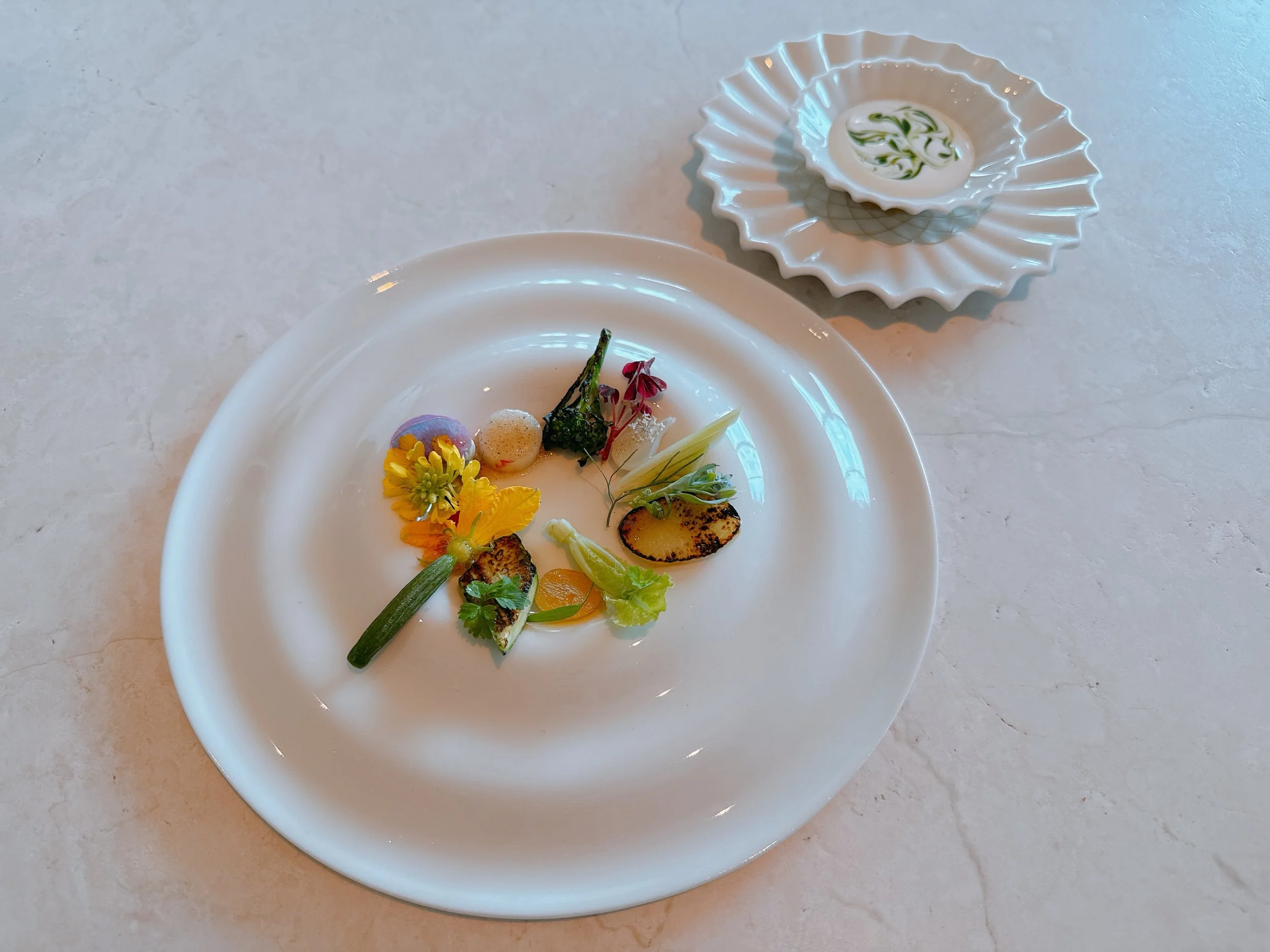 Our last appetizer was paired with the first glass of the wine pairing. It was a collection of fresh vegetables and herbs, selected in the morning from the available produce: fennel, cucumber, a grilled potato and zucchinis, seasoned with pickled pine and paired with a smoked cream cheese topped with parsley oil. The vegetables were all quite nice (clearly this was a good time of year to visit the restaurant) and the sauce was wonderfully flavorful 17.