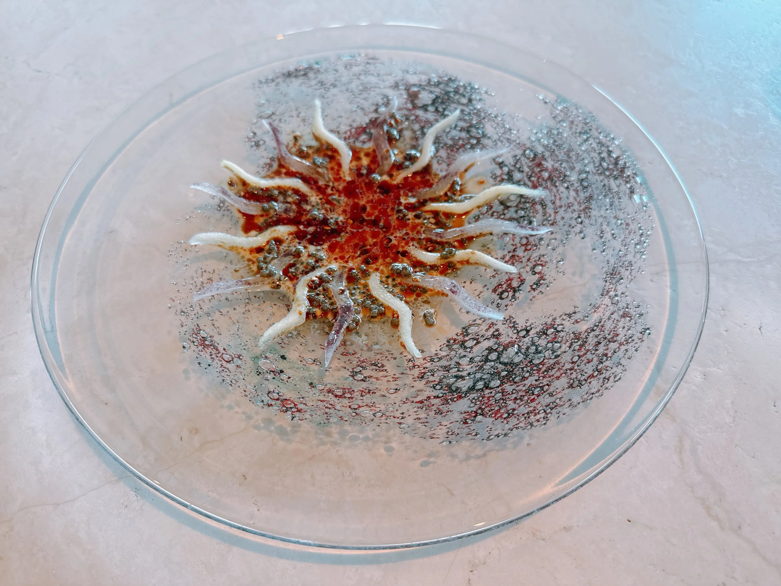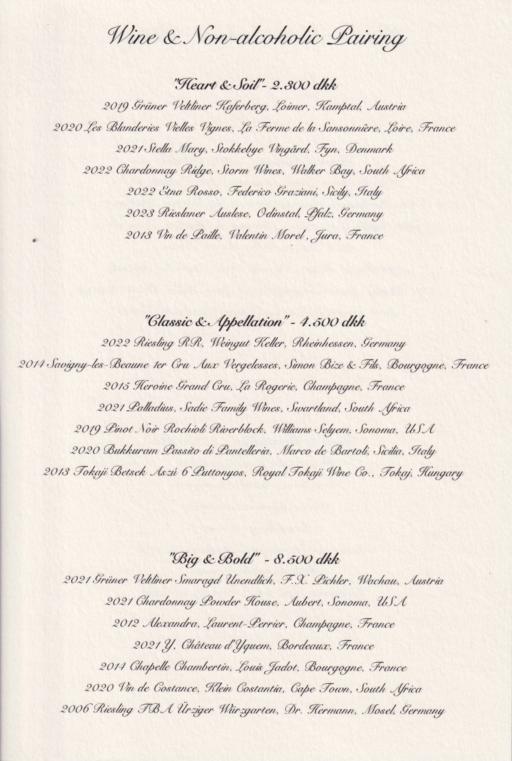 Geranium served just a single tasting menu with an optional caviar course. We were definitely in Denmark: the basic menu cost 4200 DKK (about $650) and the caviar course was 950 DKK ($150). Four wine pairings ranged from 2300 DKK to a whopping 20000 DKK ($350 to $3120). Prices like these might make Paris look like a bargain, but were actually not unusual for a three-Michelin-starred restaurant in this area. I went with the base-line 2300 DKK pairing, and the wines were not just enjoyable, but even included a few superb ones. Definitely much better than the basic pairing at most restaurants, but then again, the pairing’s price was not exactly “basic”...