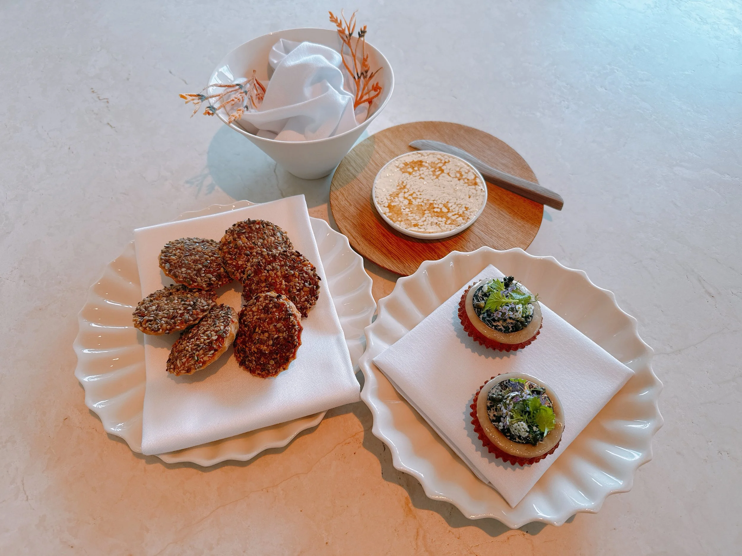 Tables in the main dining room were (for the most part) arranged to face the open kitchen. Two tables for single diners were placed right next to the kitchen with an excellent view - a nice gesture for guests who clearly had come only for the food. The interior design was modern Scandinavian, with simple but comfortable furniture, a color scheme tending towards white and no table cloths. At a first glance, not much had changed since our last visit in 2016. But it was a different season, and the menu had become fully pescatarian after the pandemic. Definitely worth a revisit then.