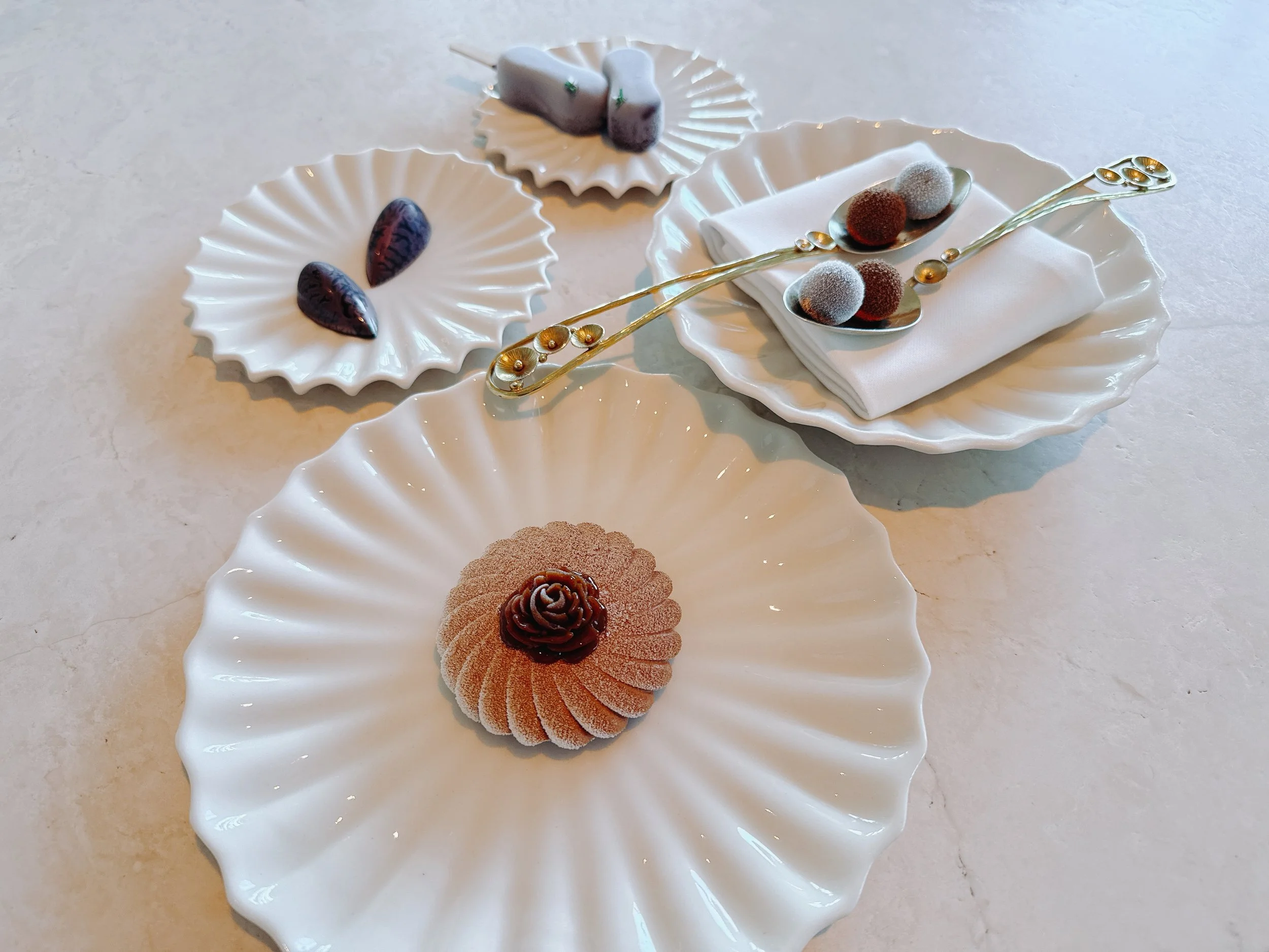 Five different small bites might constituted the penultimate course. In the order we tried them: a spoon containing two pralines, a white one made with coffee grains (and a strong coffee flavor) 17, and a brown praline filled with a chocolate anglaise 15. Next, a flower-shaped chocolate mousse topped with caramel and prunes. The mousse was airy and light, the cold prunes added some fruitiness and cocoa nibs underneath the mousse provided some crunch 17. A chocolate-covered, sunchoke-reduction-flavored ice cream popsicle was decorated with thyme and a single salt flake. I'd file this under “interesting”, since it was a bit too savory for my taste, the thyme in particular felt odd for a dessert 15. Finally, a chocolate praline with a rosehip filling was ok, but its lightly flavored filling was overwhelmed by the amount of dark chocolate surrounding it 14.