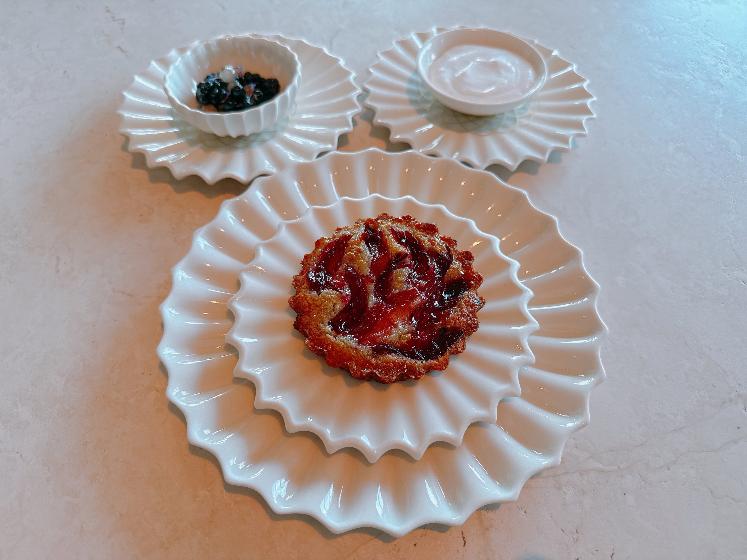 The final dish of the day was a tart made with sunflower seeds and plums, topped with a fig leaf glaze. It came with a vanilla cream and some fresh berries. The cake was a bit sticky, the vanilla flavor light, and the berries sour. A nice, rustic combination 17.