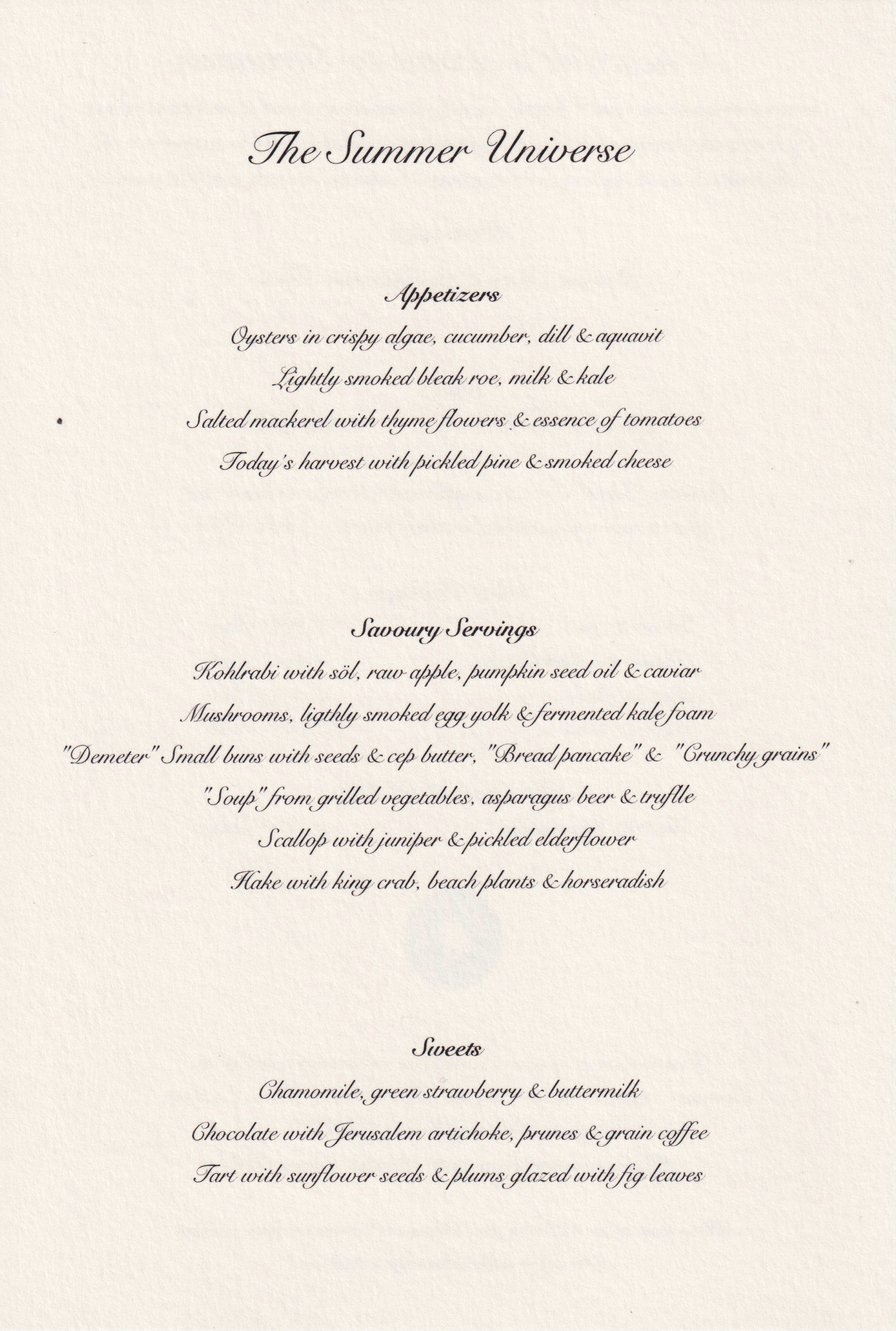 Overall: Modern Scandinavian cuisine, where single ingredients shine in every dish. When this worked - as it did especially early on in the meal -, the results were terrific. Later, there were some cases where this focus on a single ingredient didn't quite work, resulting in either too straightforward seeming dishes (the mushrooms), or ones that didn't get the balance quite right, overwhelming the stars of the dish (e.g. the caviar course). As a whole experience, though, it was still a very enjoyable meal, with excellent service, a great wine pairing and a terrific view 17.